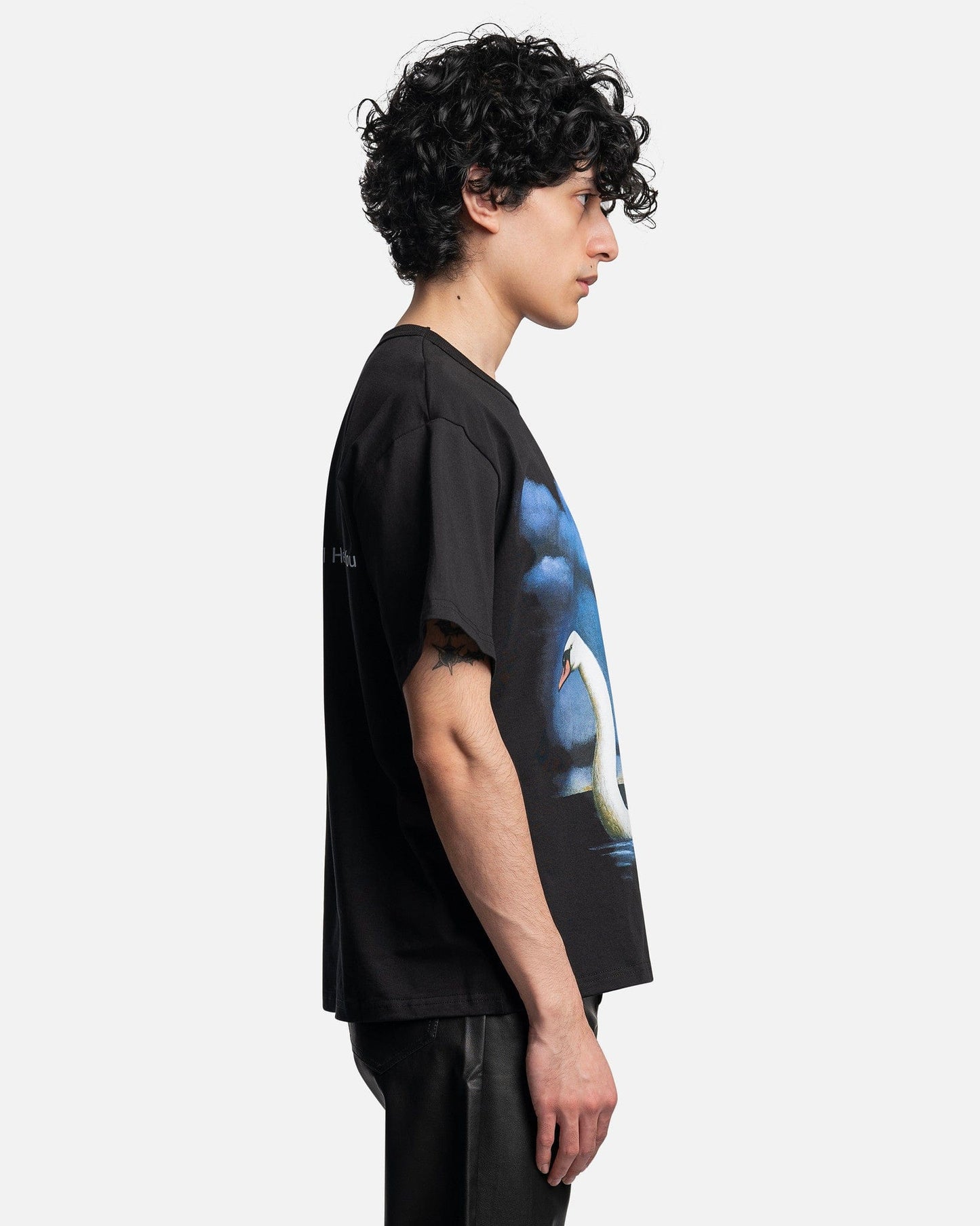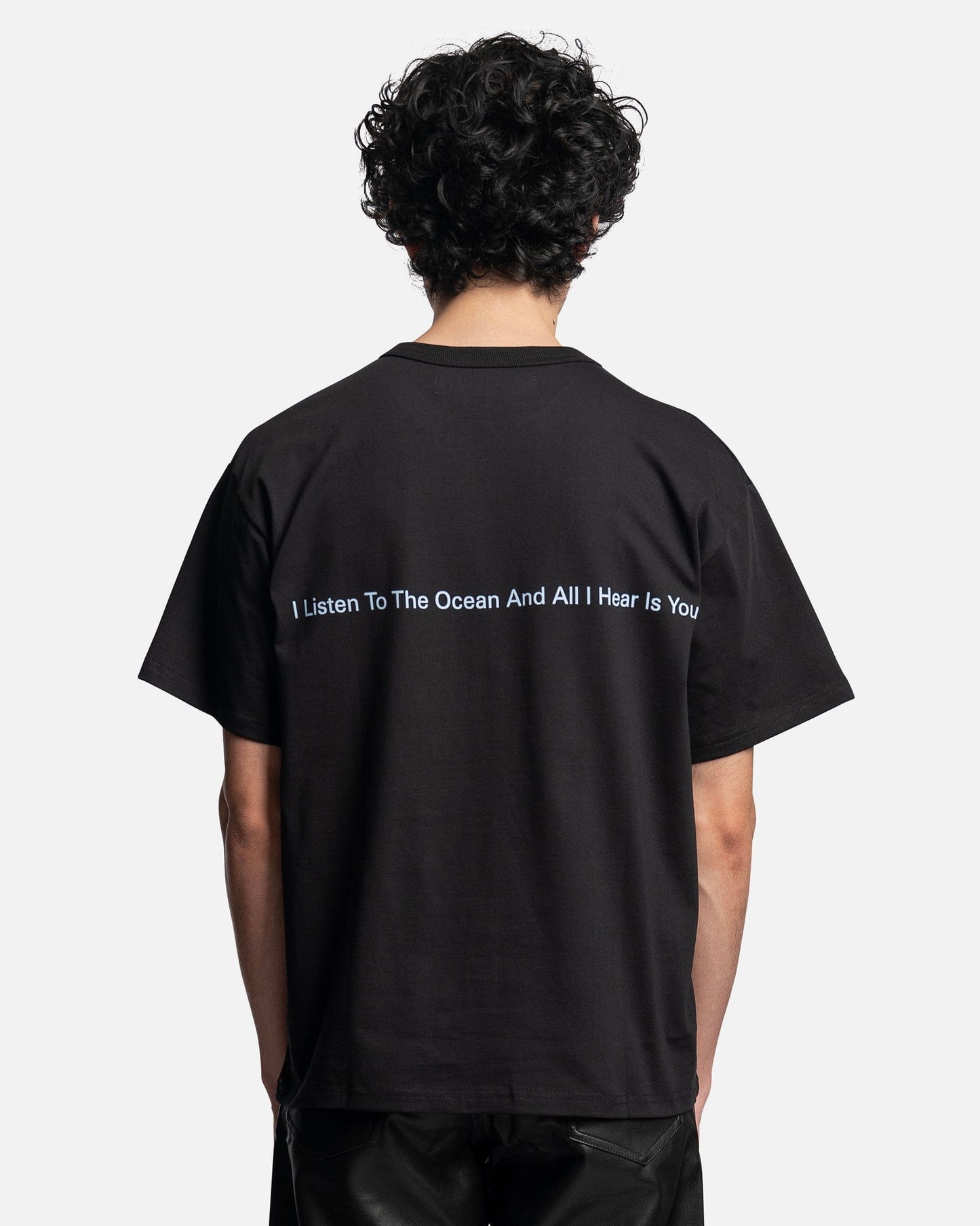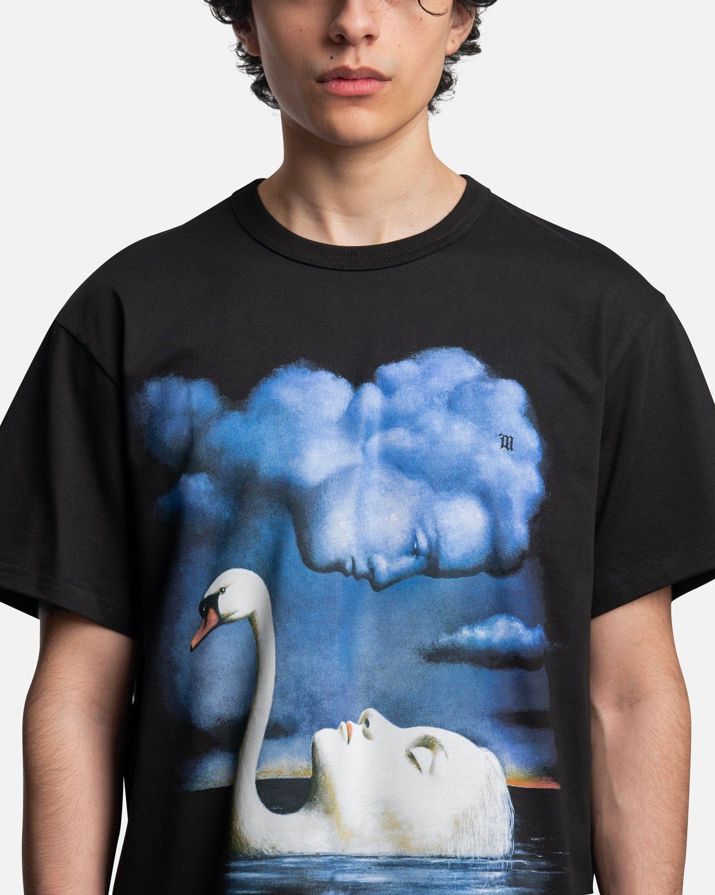 MISBHV men's graphic t-shirt in black. This shirt features a swan graphic printed on the chest and text on the back that reads “I Listen To The Ocean And All I Hear Is You.”