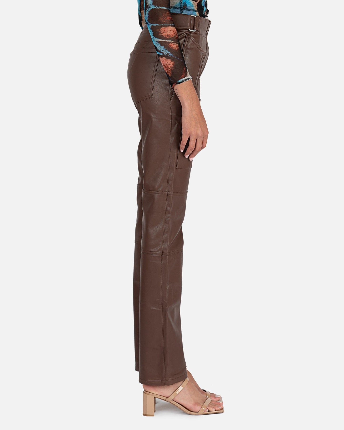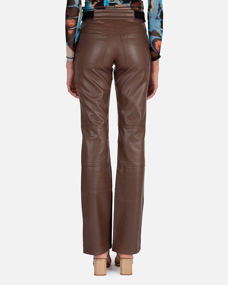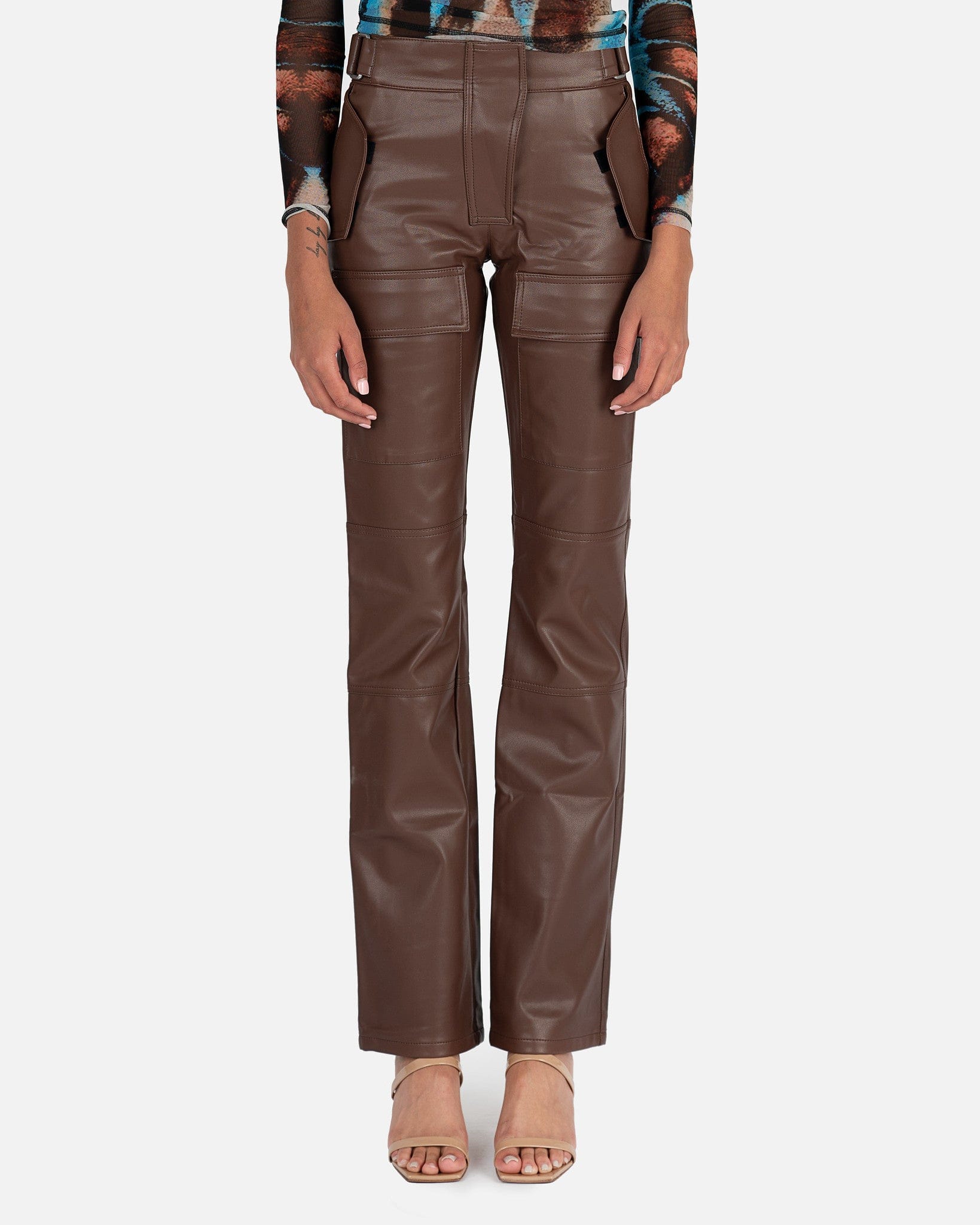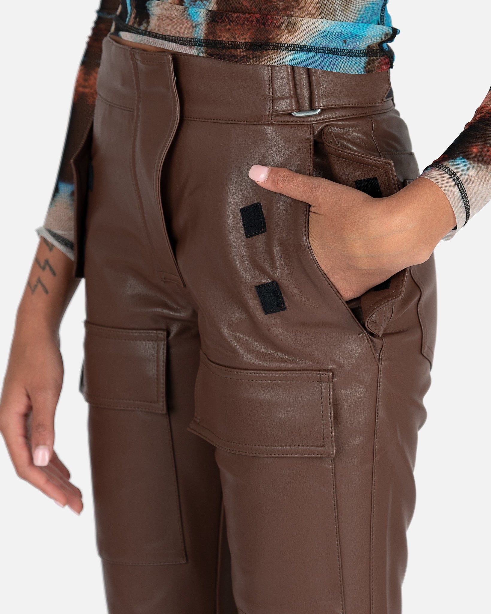 MISBHV vegan leather pants in brown. These trousers have a buckle fastening belt and side flap pockets as well as flap patch pockets along the leg. These pants have adjustable waist buckle fastening..