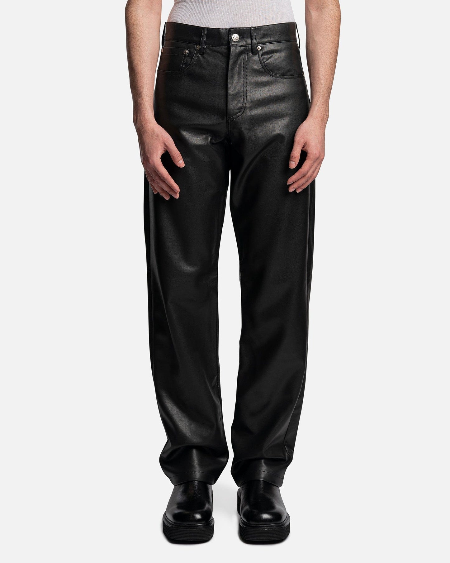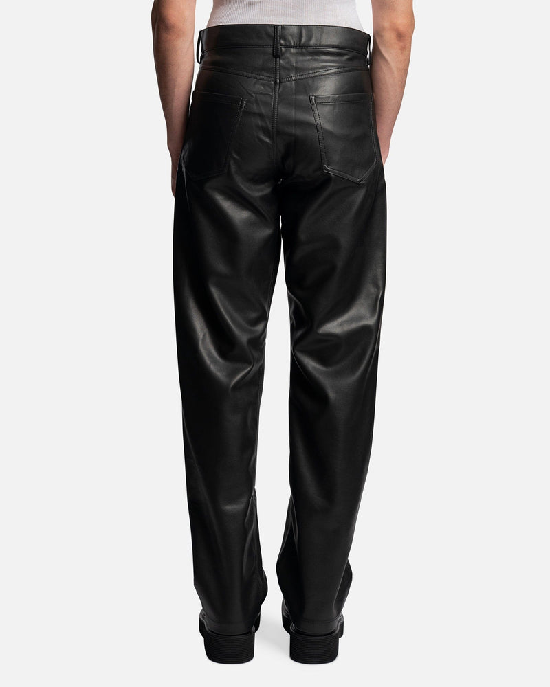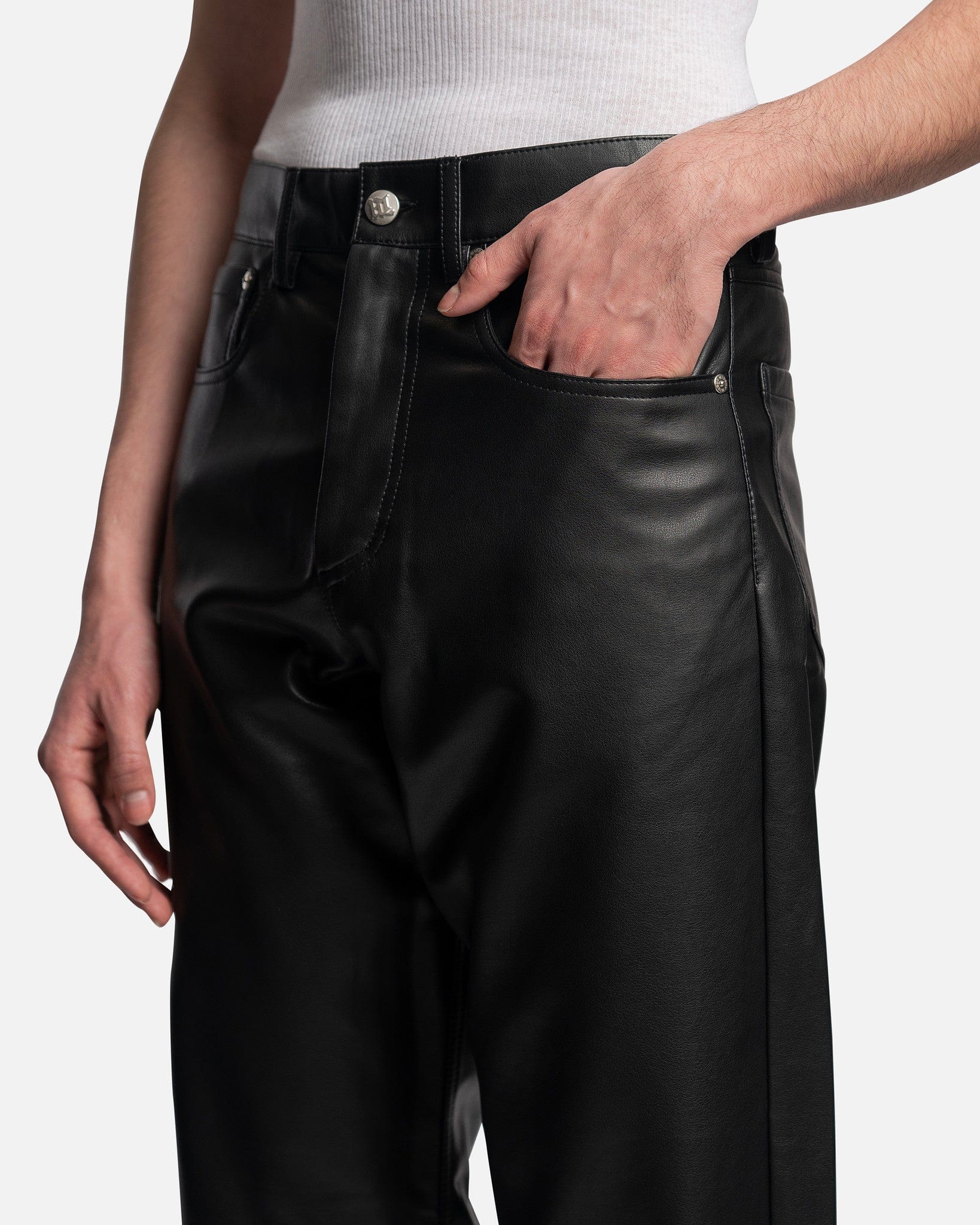 MISBHV men's vegan leather pants in black. These pants have a five pocket composition and a straight leg silhouette.