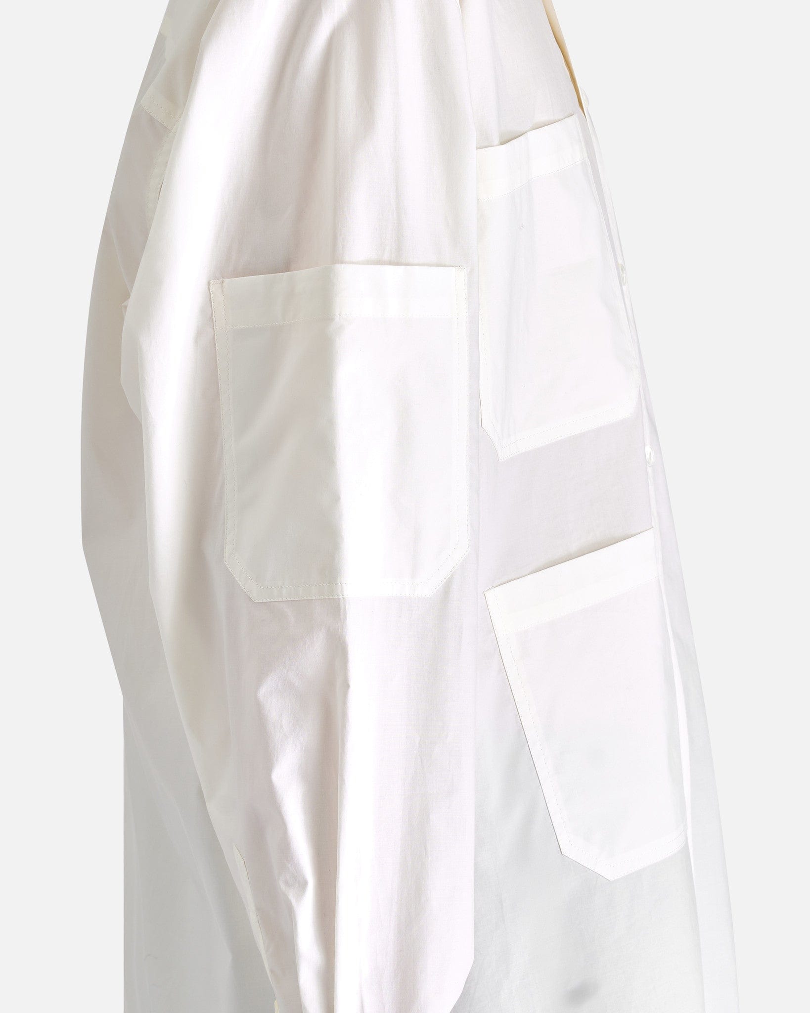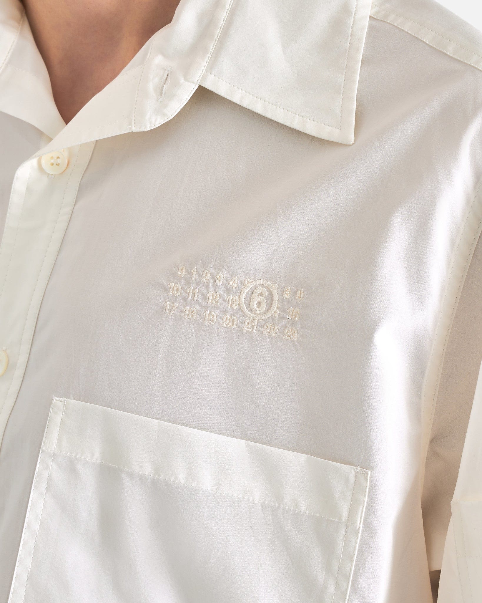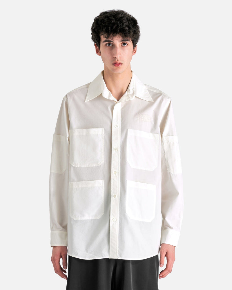 MM6 Maison Margiela Cotton Poplin Pocket Shirt in Ivory. This shirt features a spread collar, four patch pockets on the front of the shirt and two on each arm. The shirt has a front button closure, buttoned cuffs, embroidered label on the chest and a rounded hem.