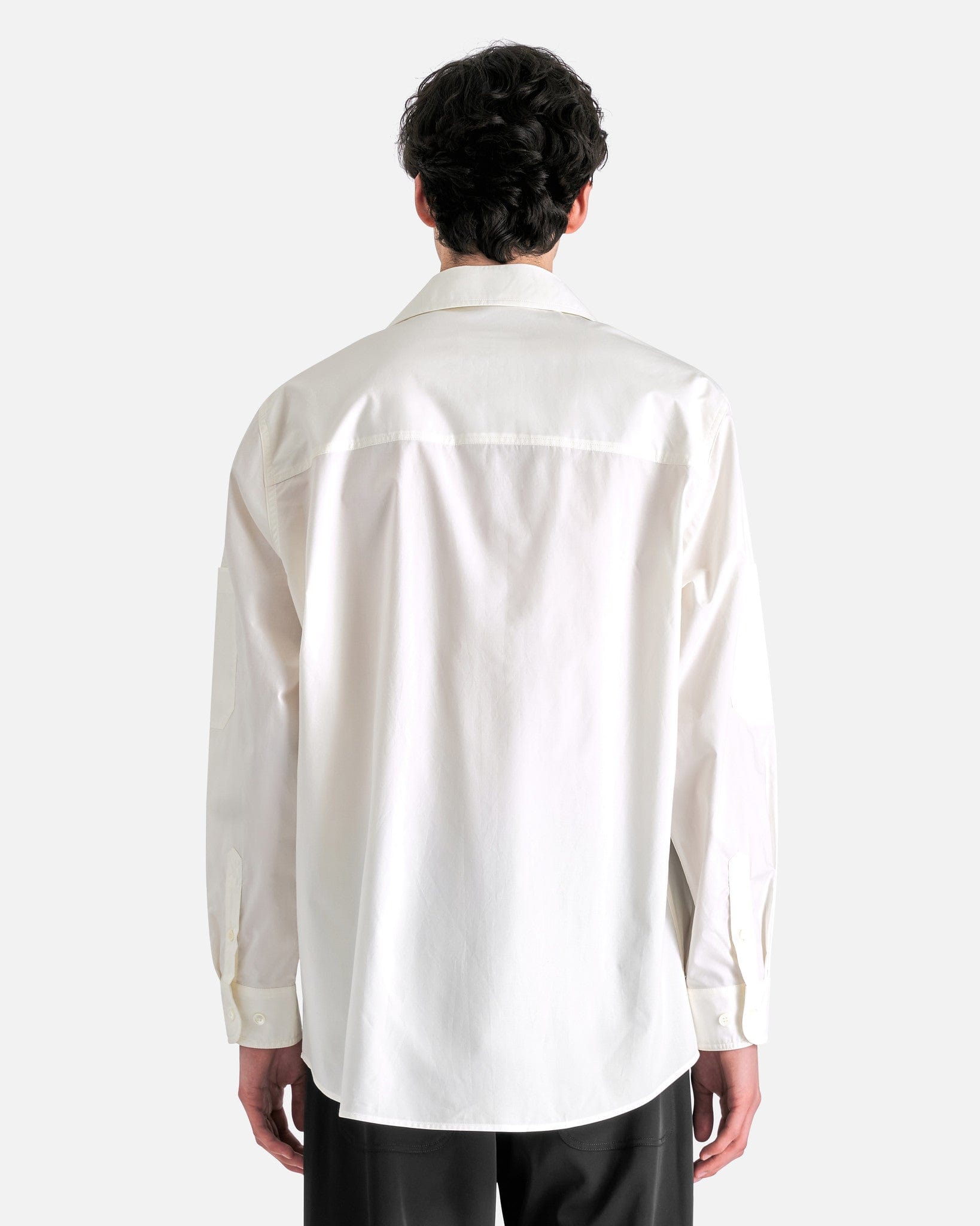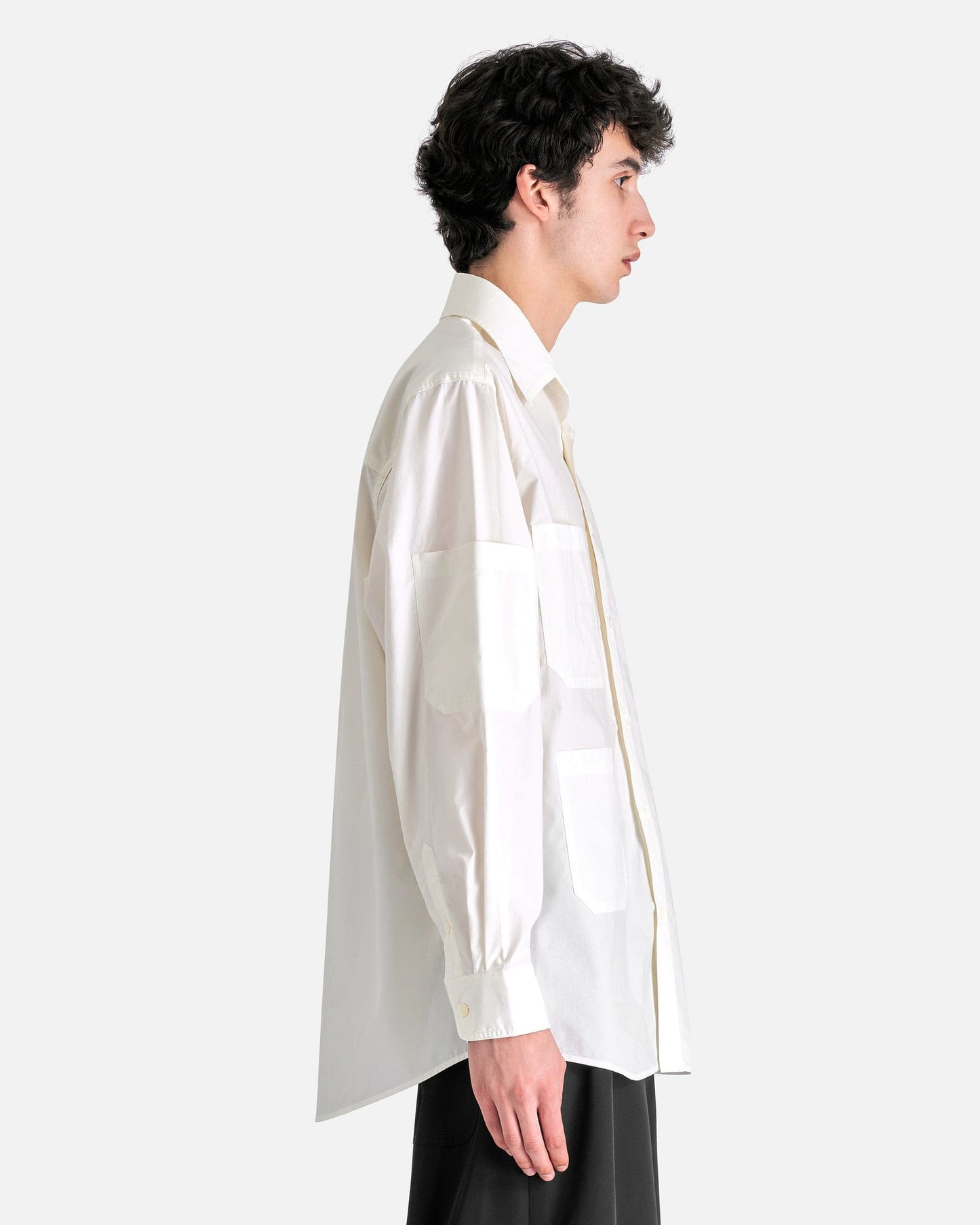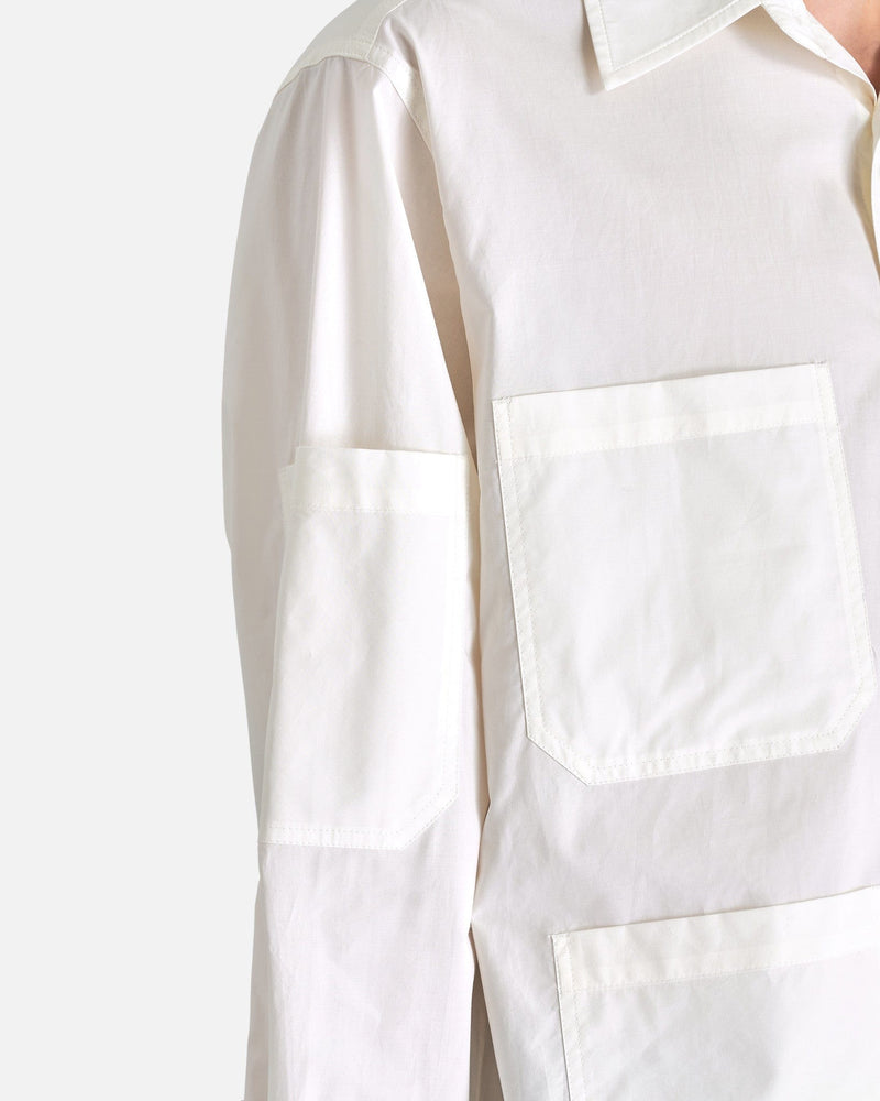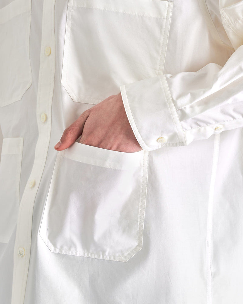 MM6 Maison Margiela Cotton Poplin Pocket Shirt in Ivory. This shirt features a spread collar, four patch pockets on the front of the shirt and two on each arm. The shirt has a front button closure, buttoned cuffs, embroidered label on the chest and a rounded hem.