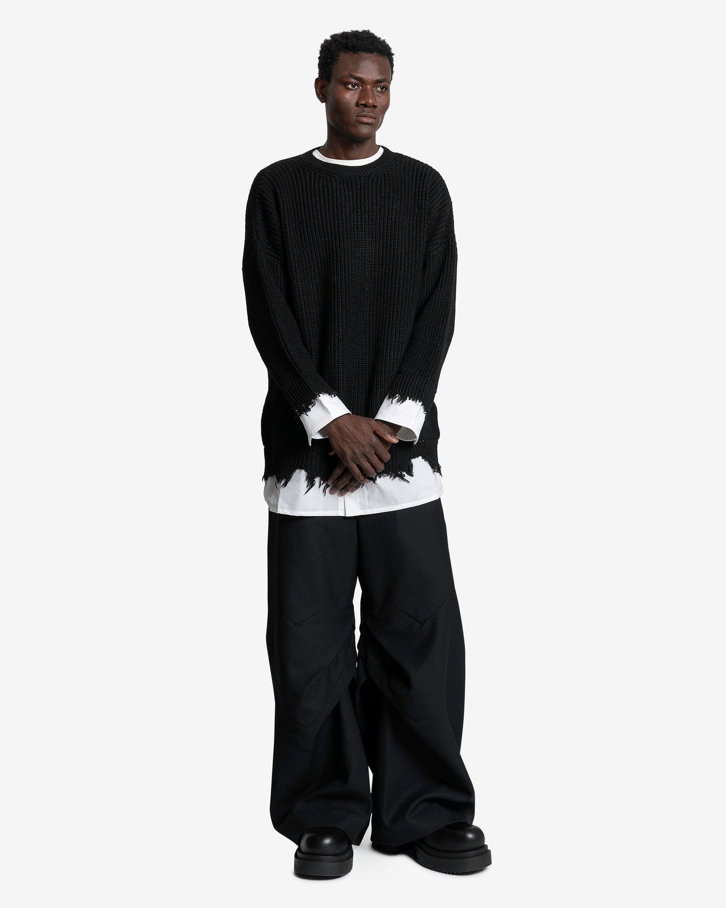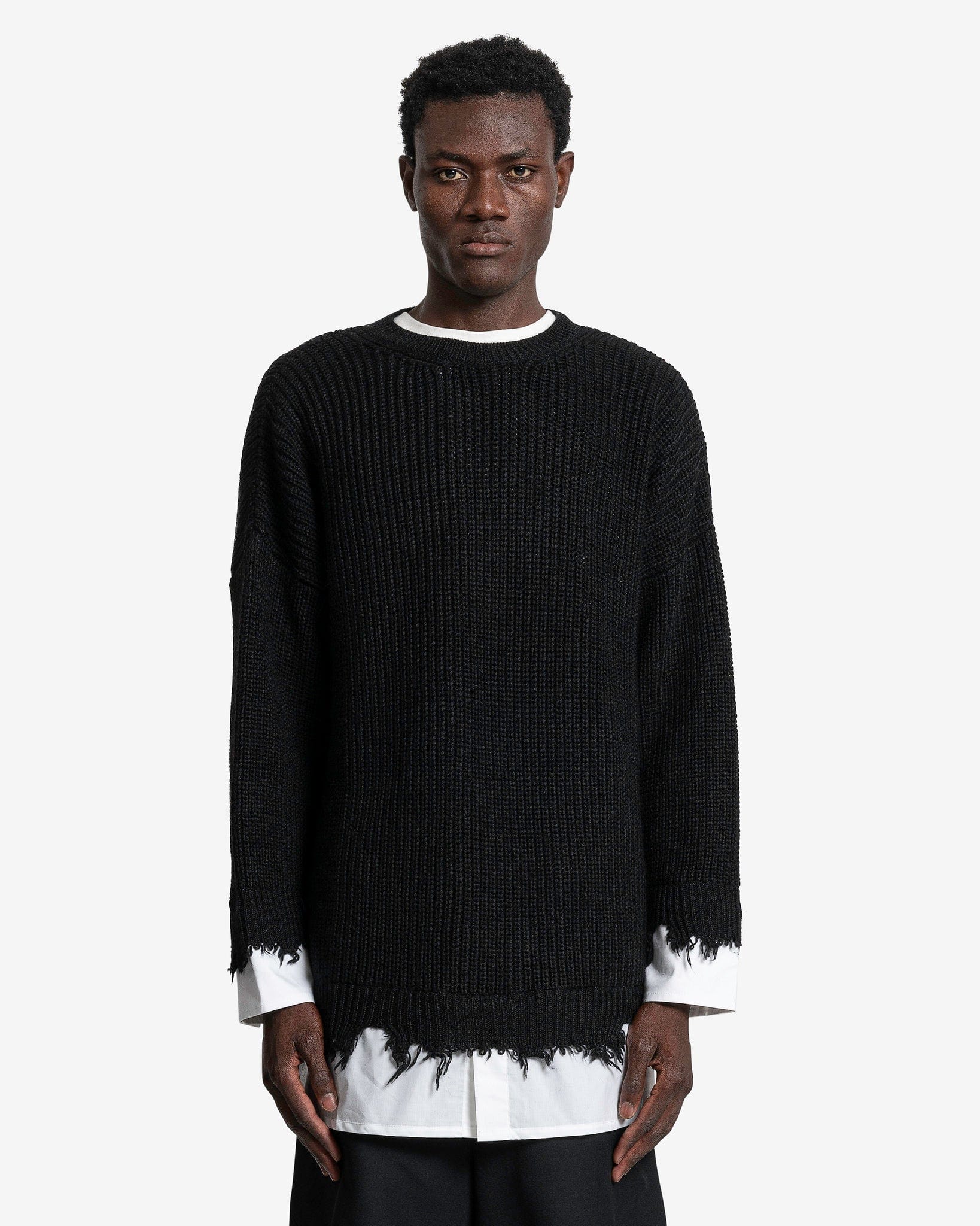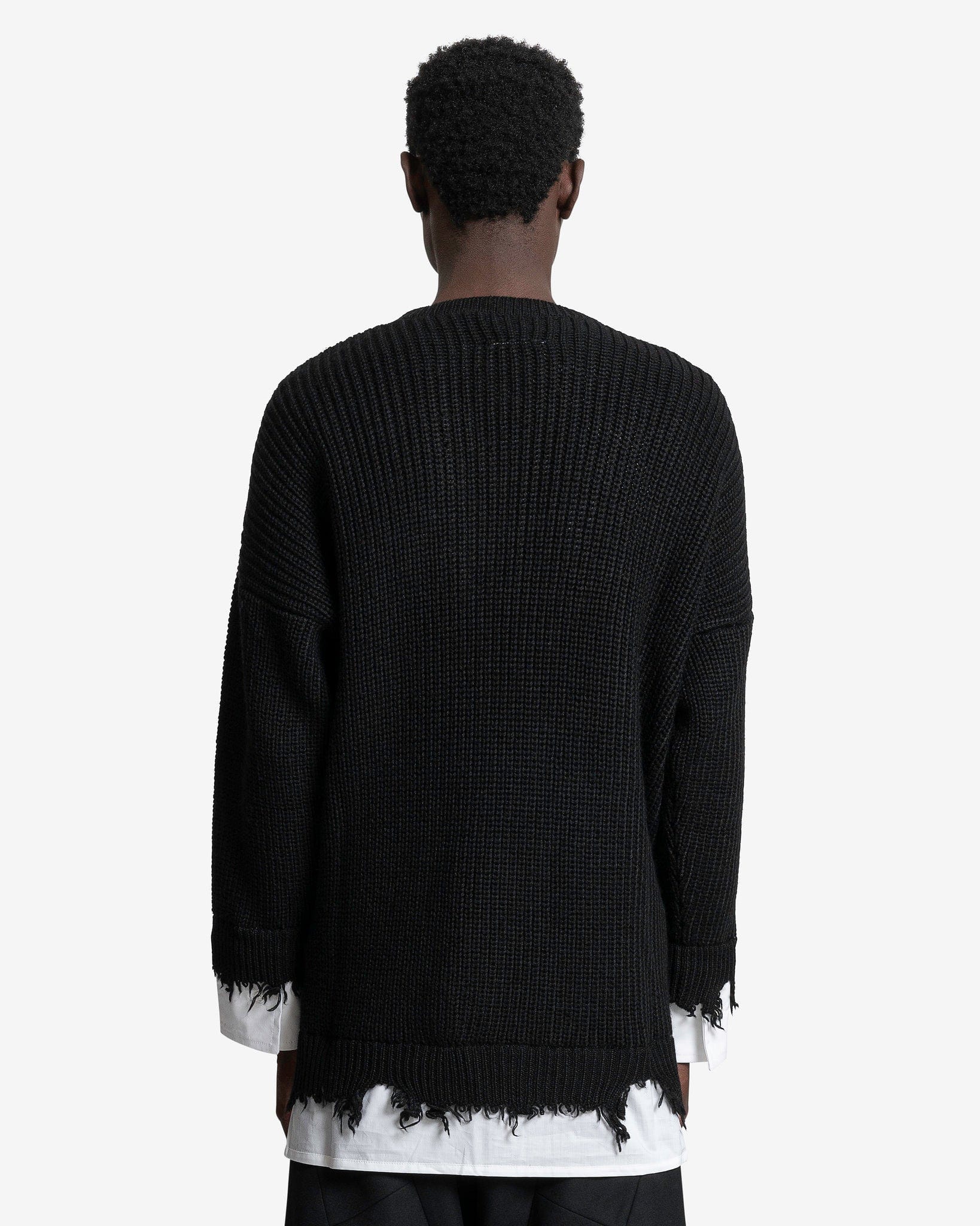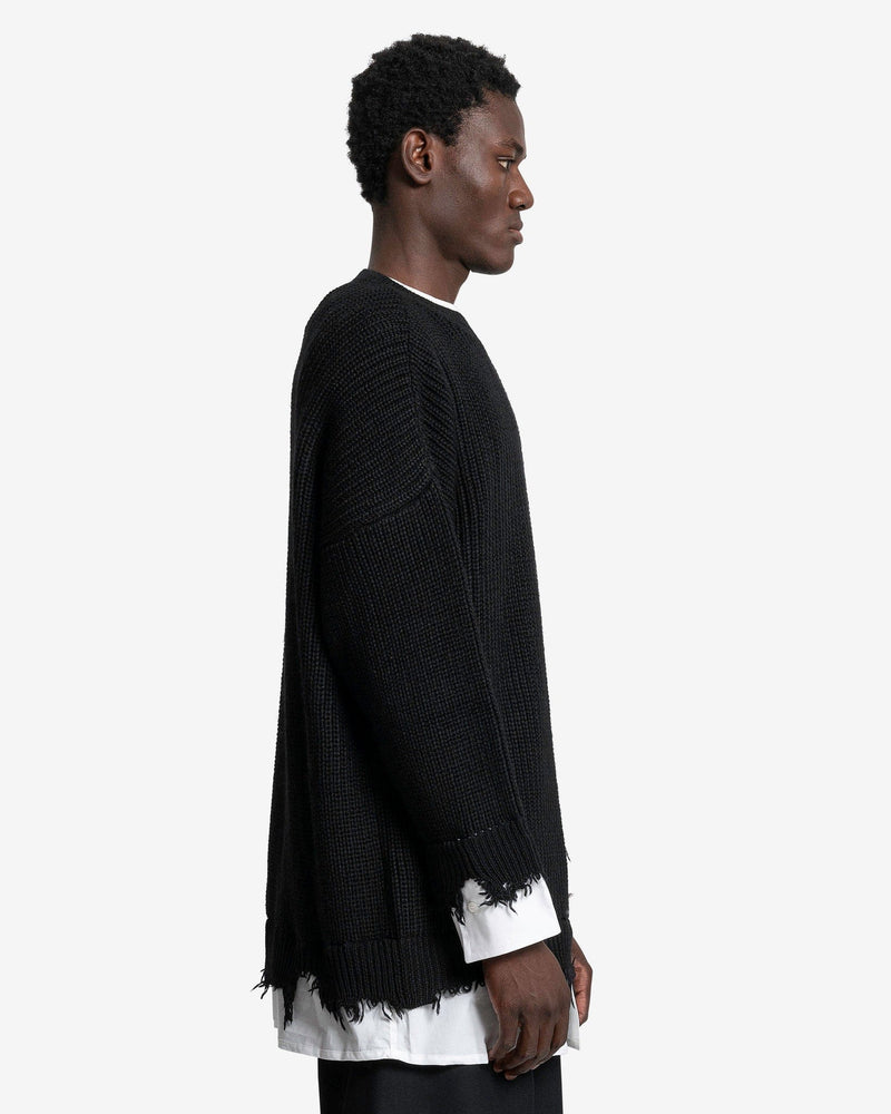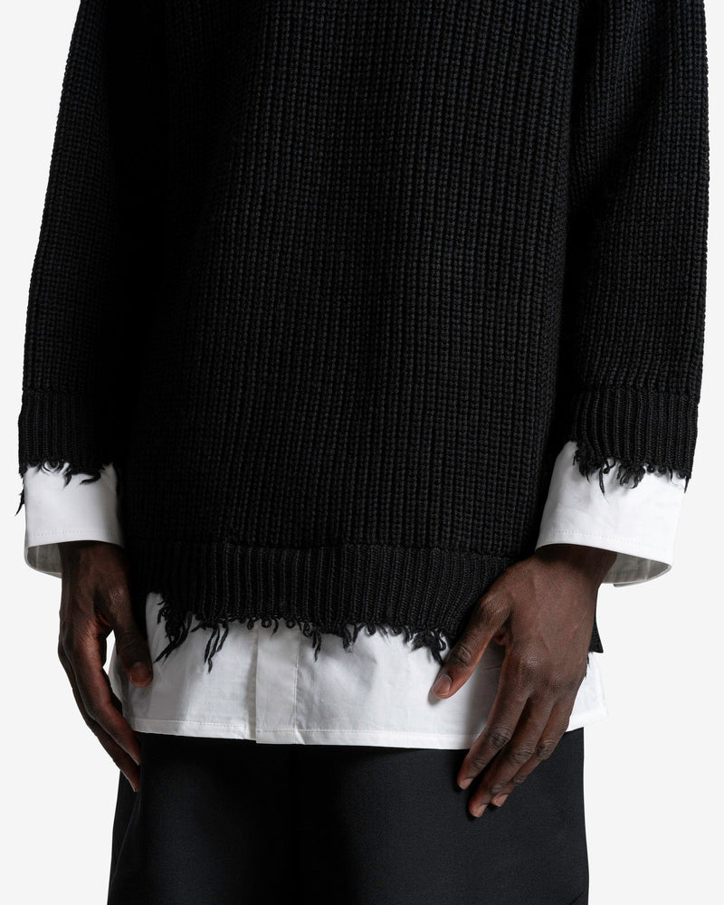 MM6 Maison Margiela Crewneck in Black. This long sleeve ribbed knit crewneck features raw-edge hems and a crisp shirt insert that completes the garment.