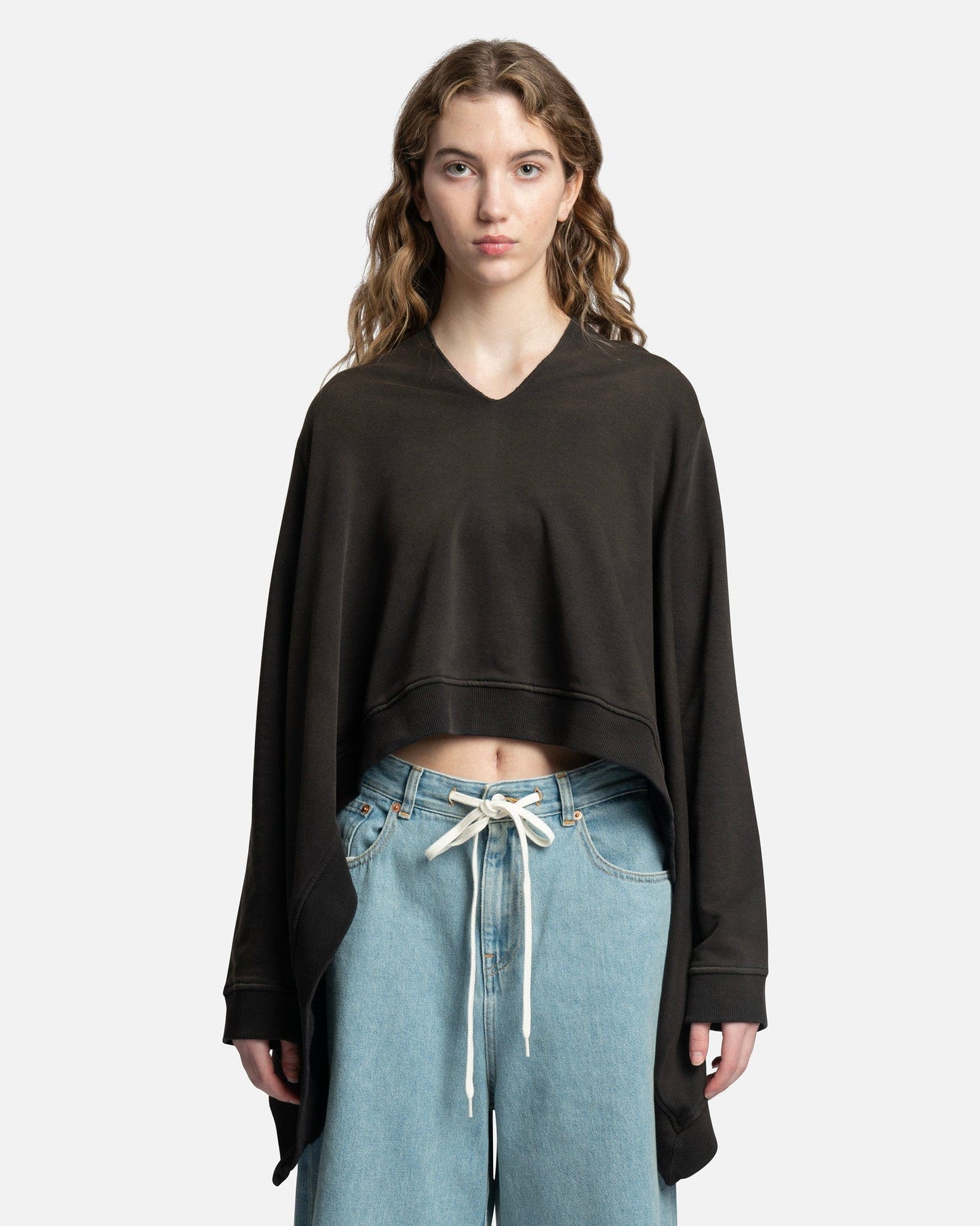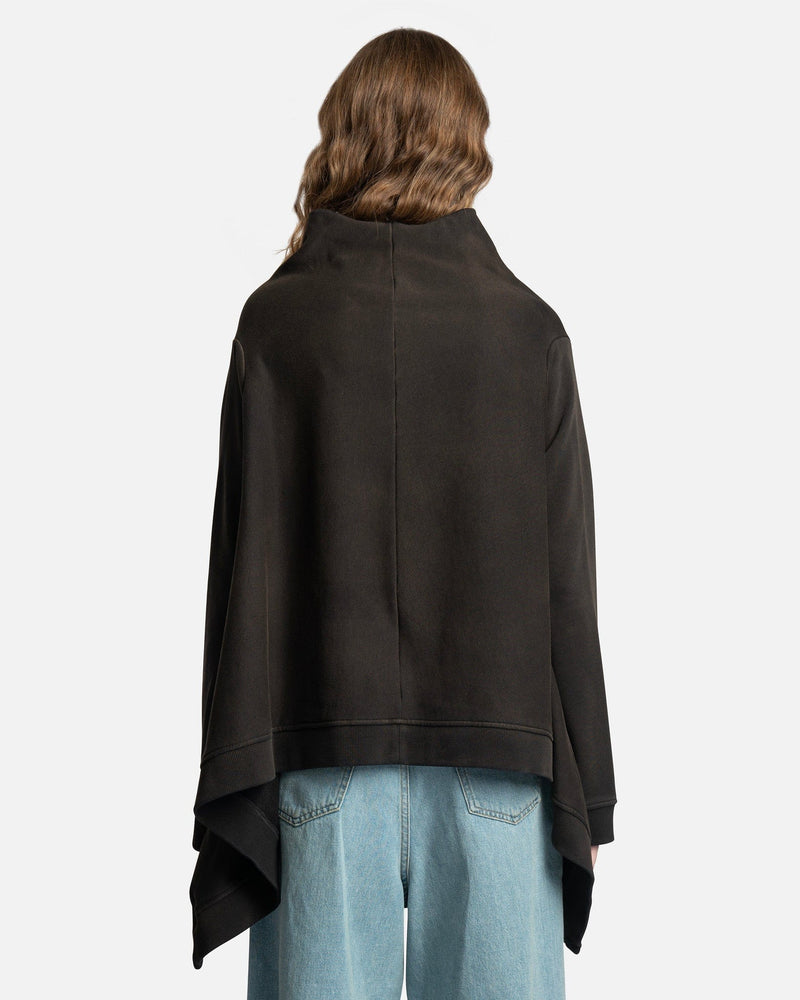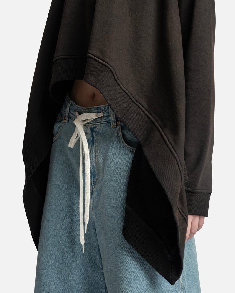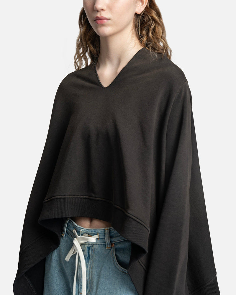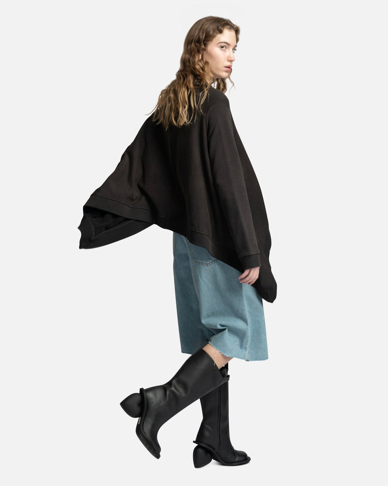 MM6 Maison Margiela women's oversized sweatshirt in black. This sweatshirt is distressed and has a high-low hem. It has a flowy, draped silhouette.