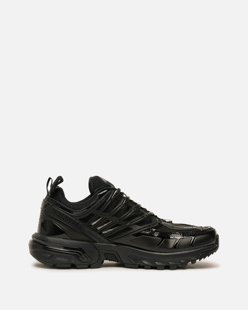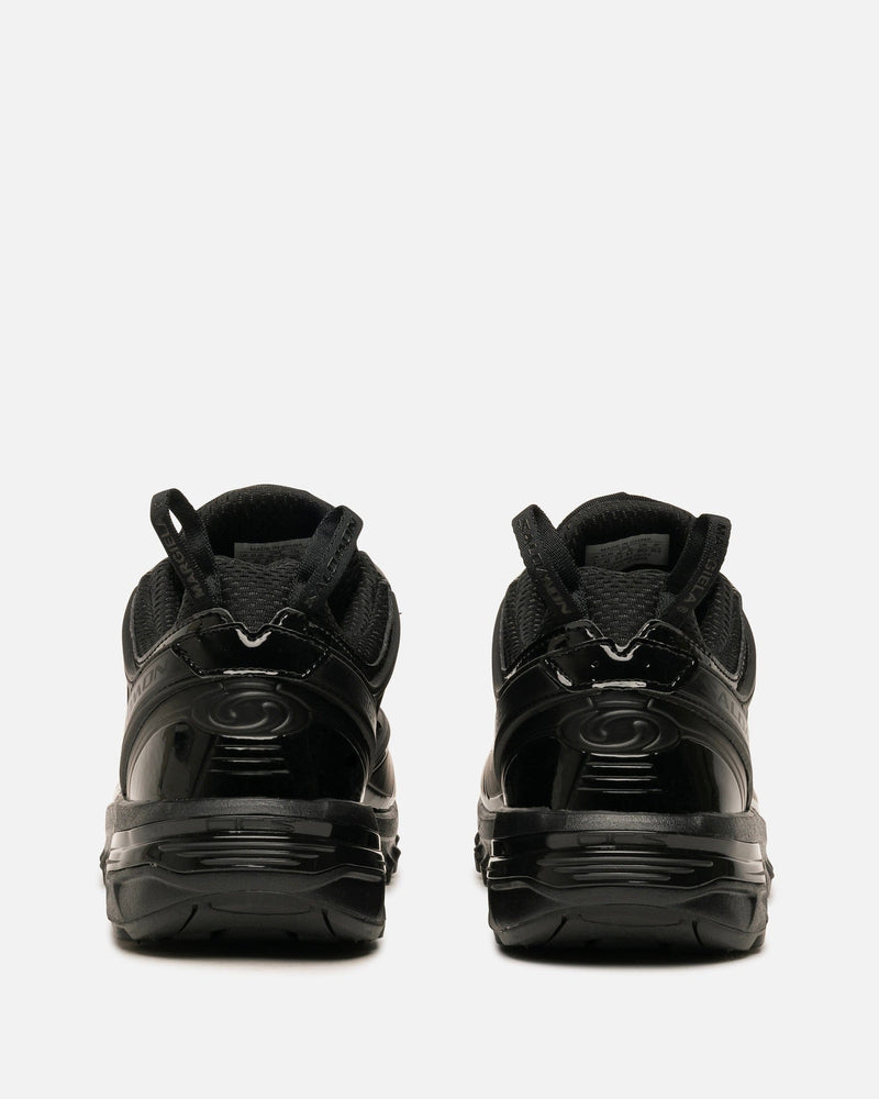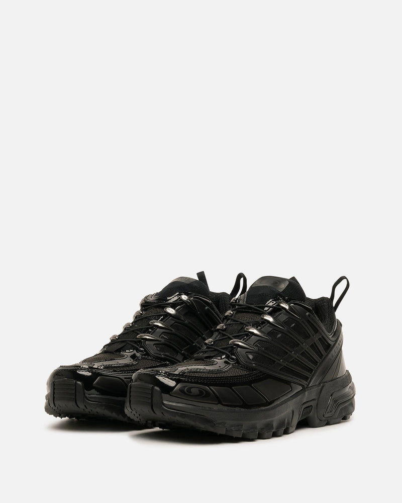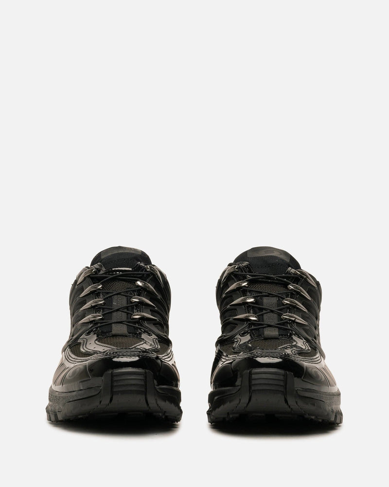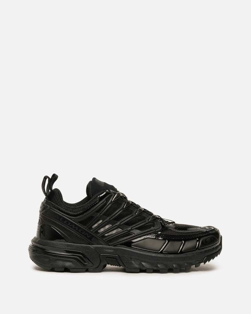 MM6 Maison Margiela x Salomon ACS Pro in Black/Quiet Shade. These shoes feature the Salomon branding and MM6 branding on the heels and tongue, respectively. The Salomon Quicklace® system makes lacing a cinch. Pull tabs on the back of the heel, mesh paneling on the lateral and medial sides of the shoes and a rugged sole.