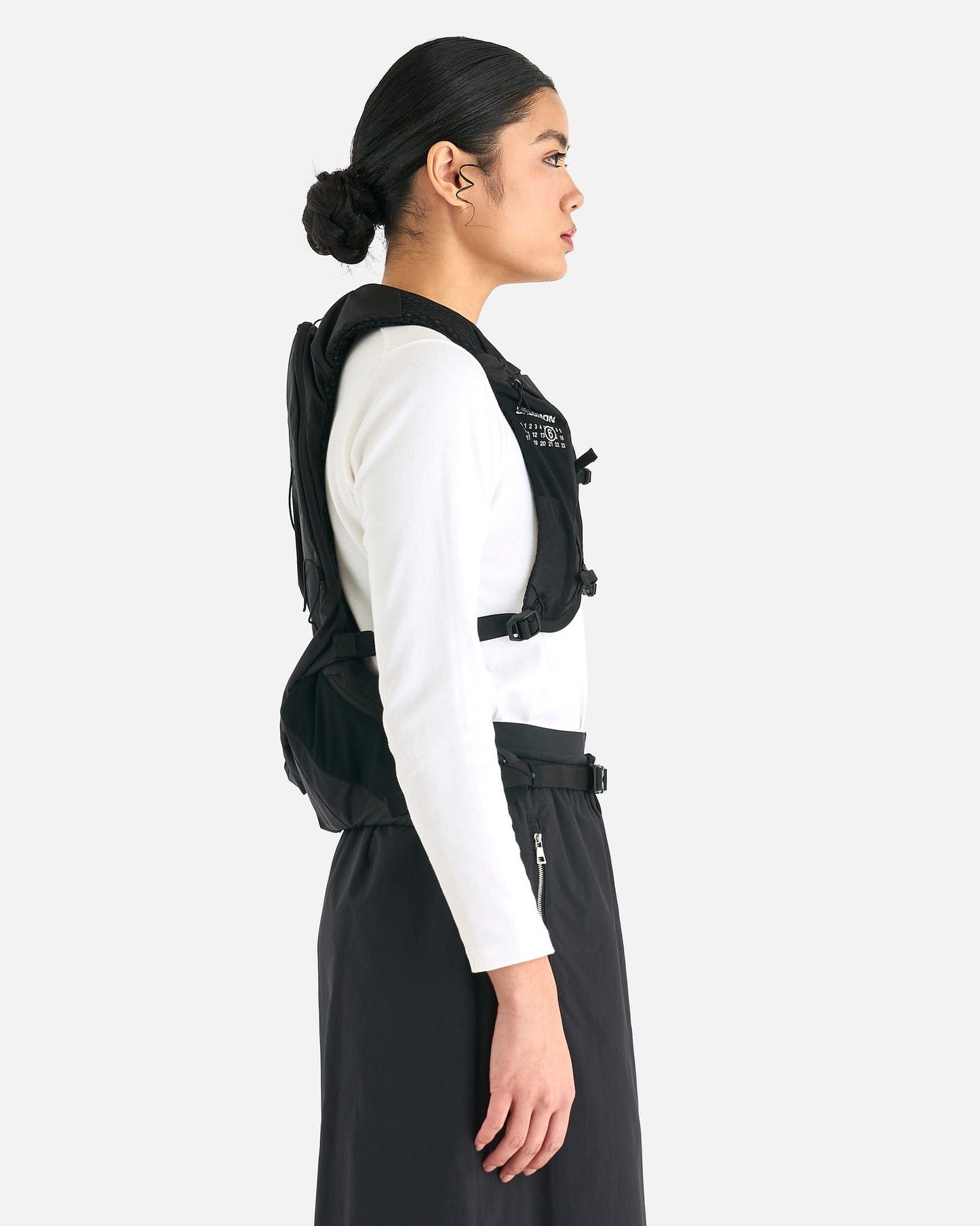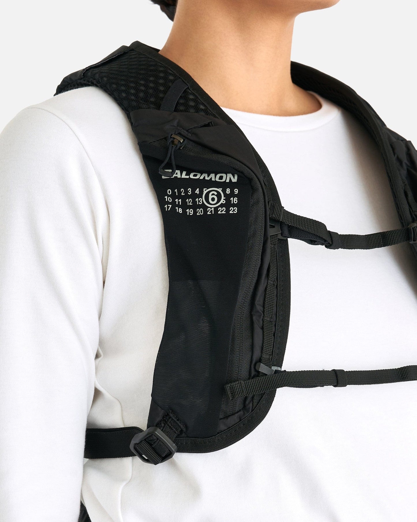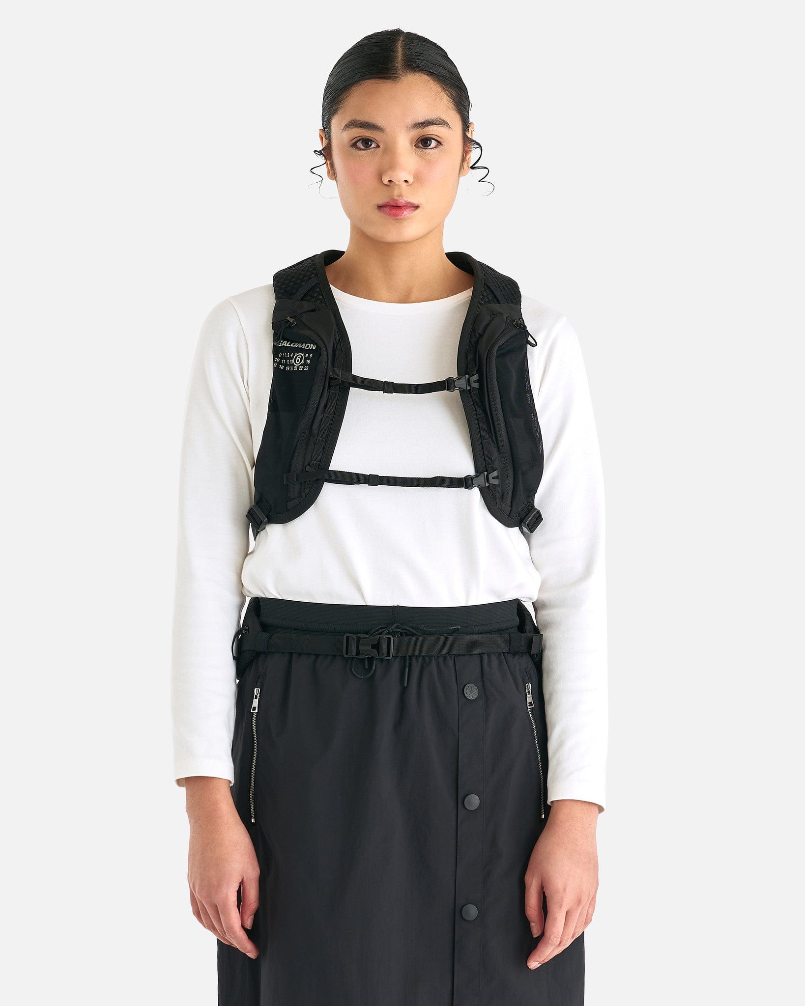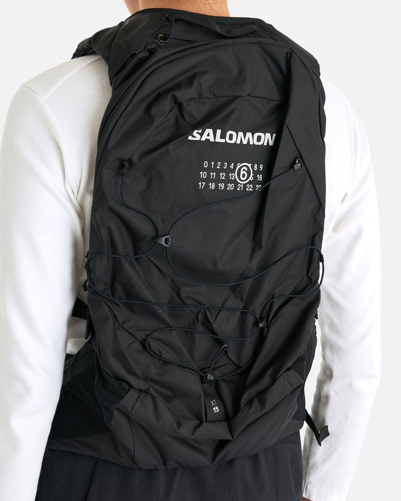 MM6 Maison Margiela x Salomon XT 15 Bag in Black. This bag features two sternum straps, hip belt with pocket, co-branding on the backside.