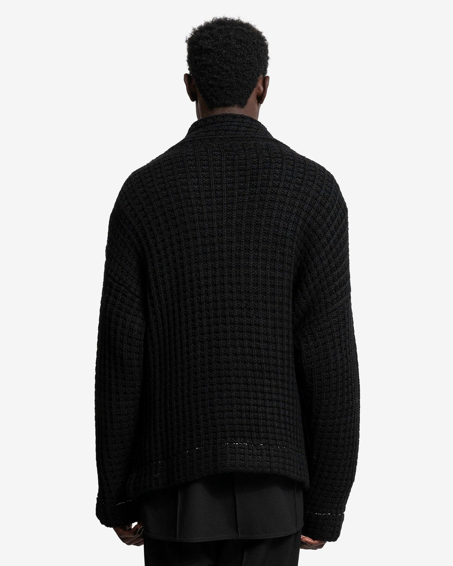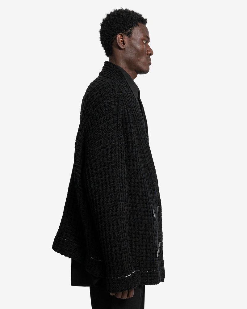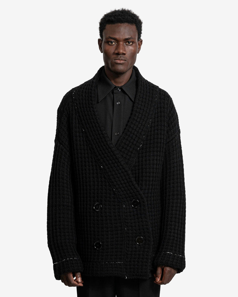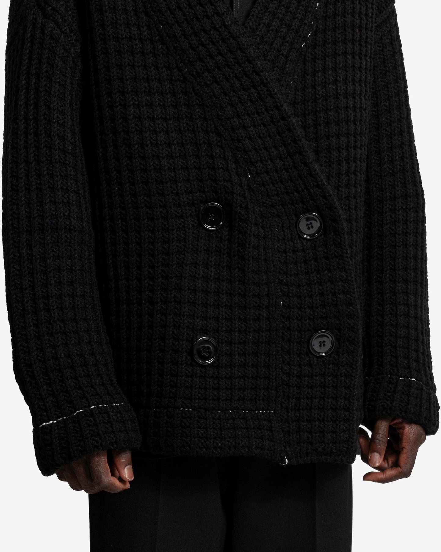 MM6 Maison Margiela men's Sports Jacket in Black. This garment features a waffle knit design with loose gauge construction. There is a front four-button closure and white detailed stitching throughout the border and cuffs of the jacket.