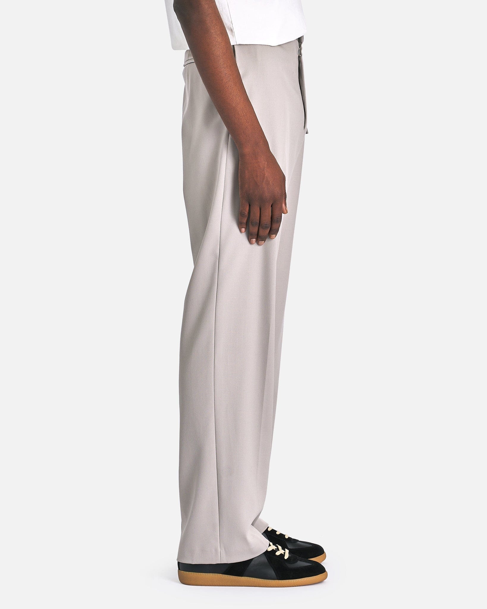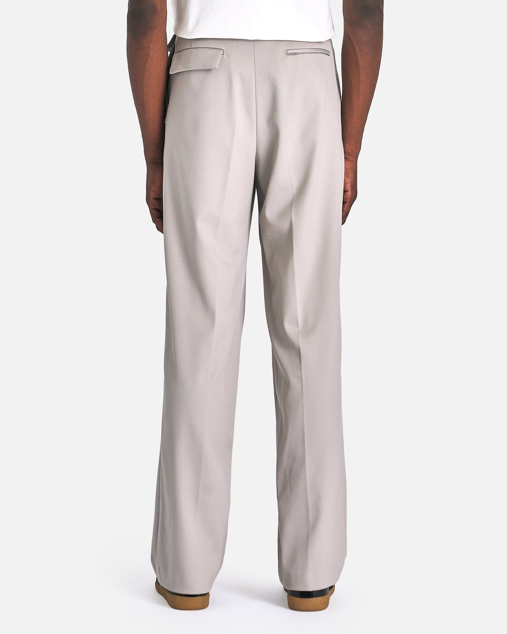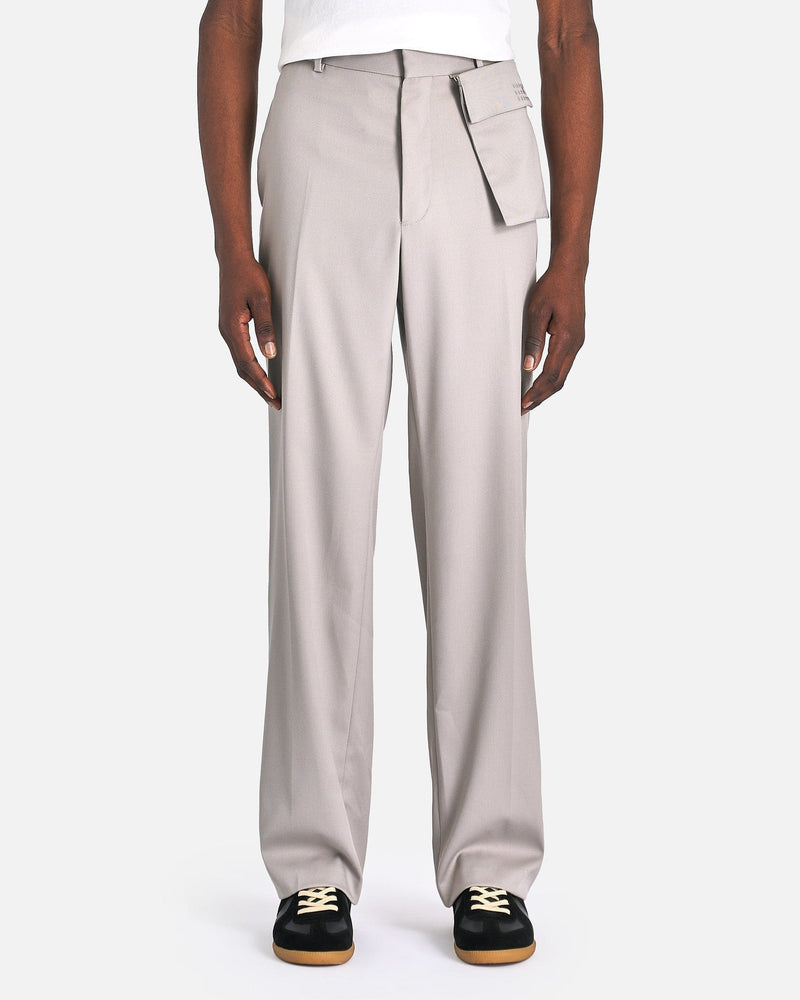MM6 Maison Margiela Wool Pouch Tailored Pants in Taupe. These pants feature a detachable front pocket, a relaxed fit with straight leg tailoring and a central pleat.