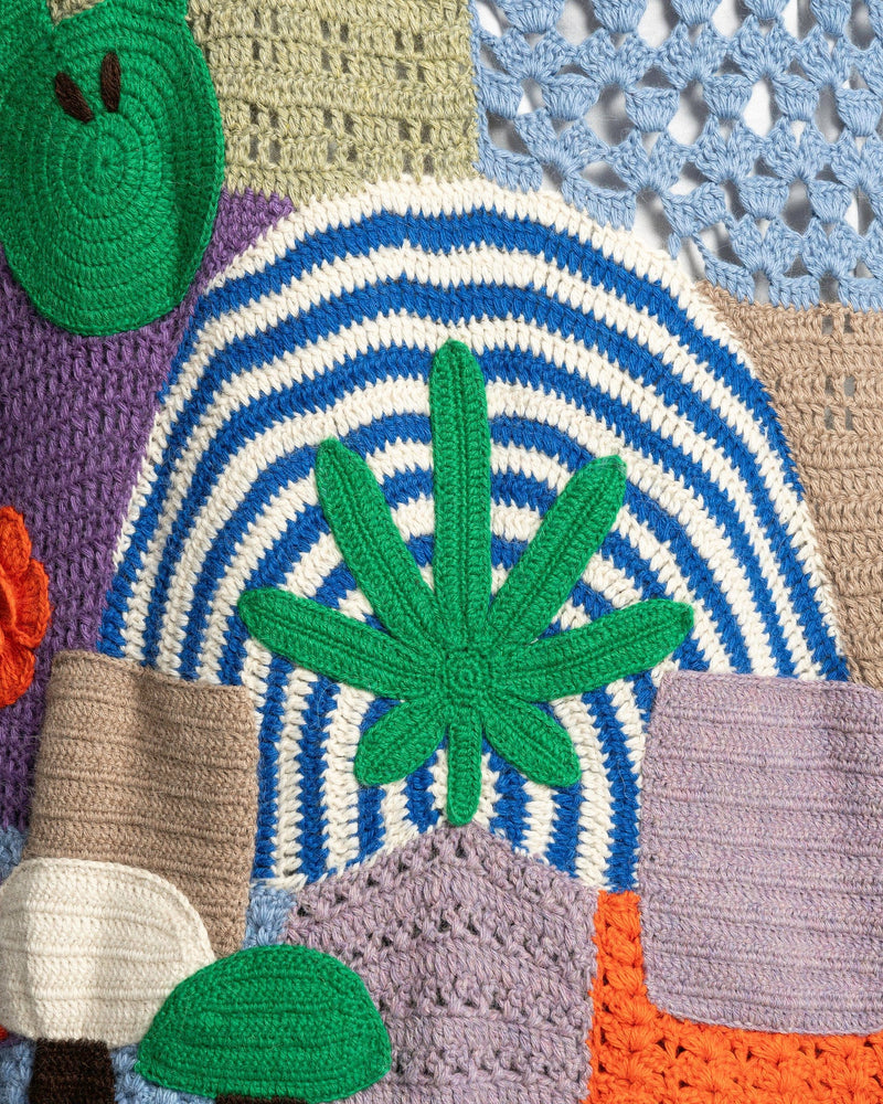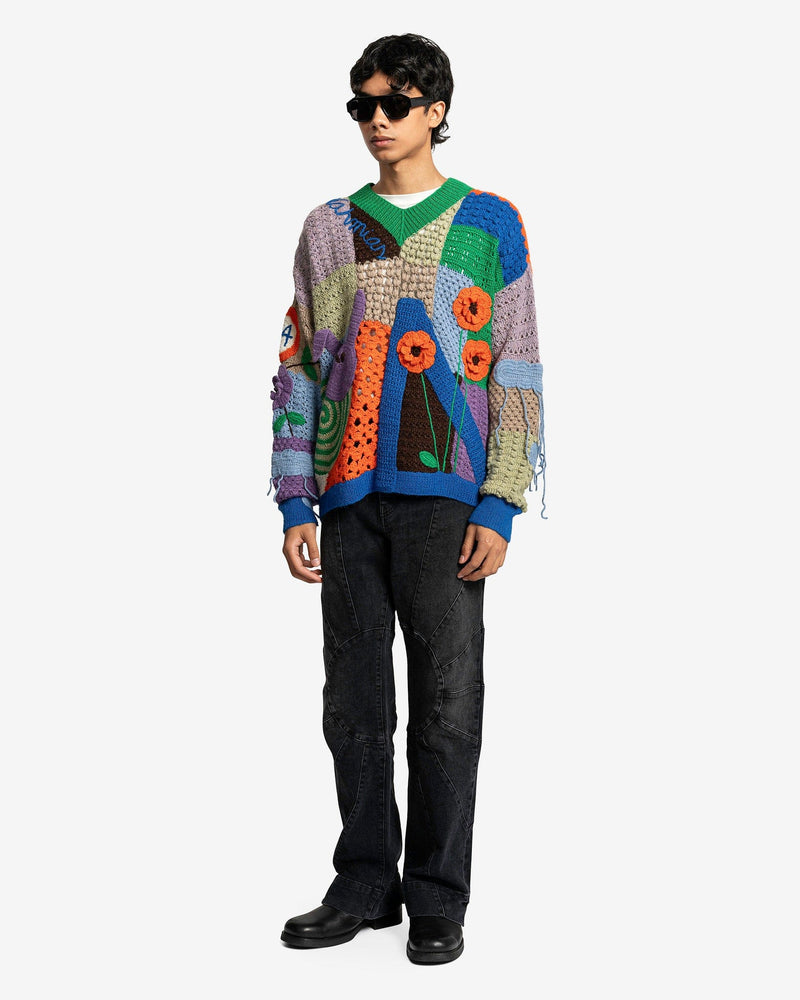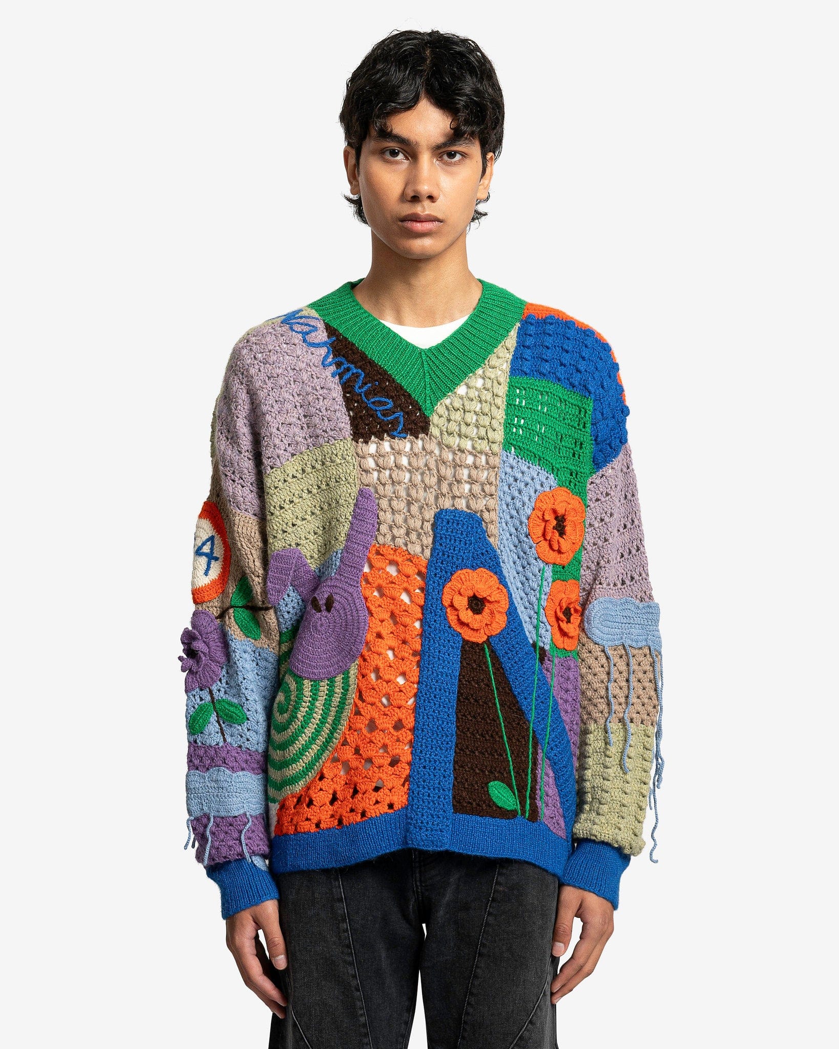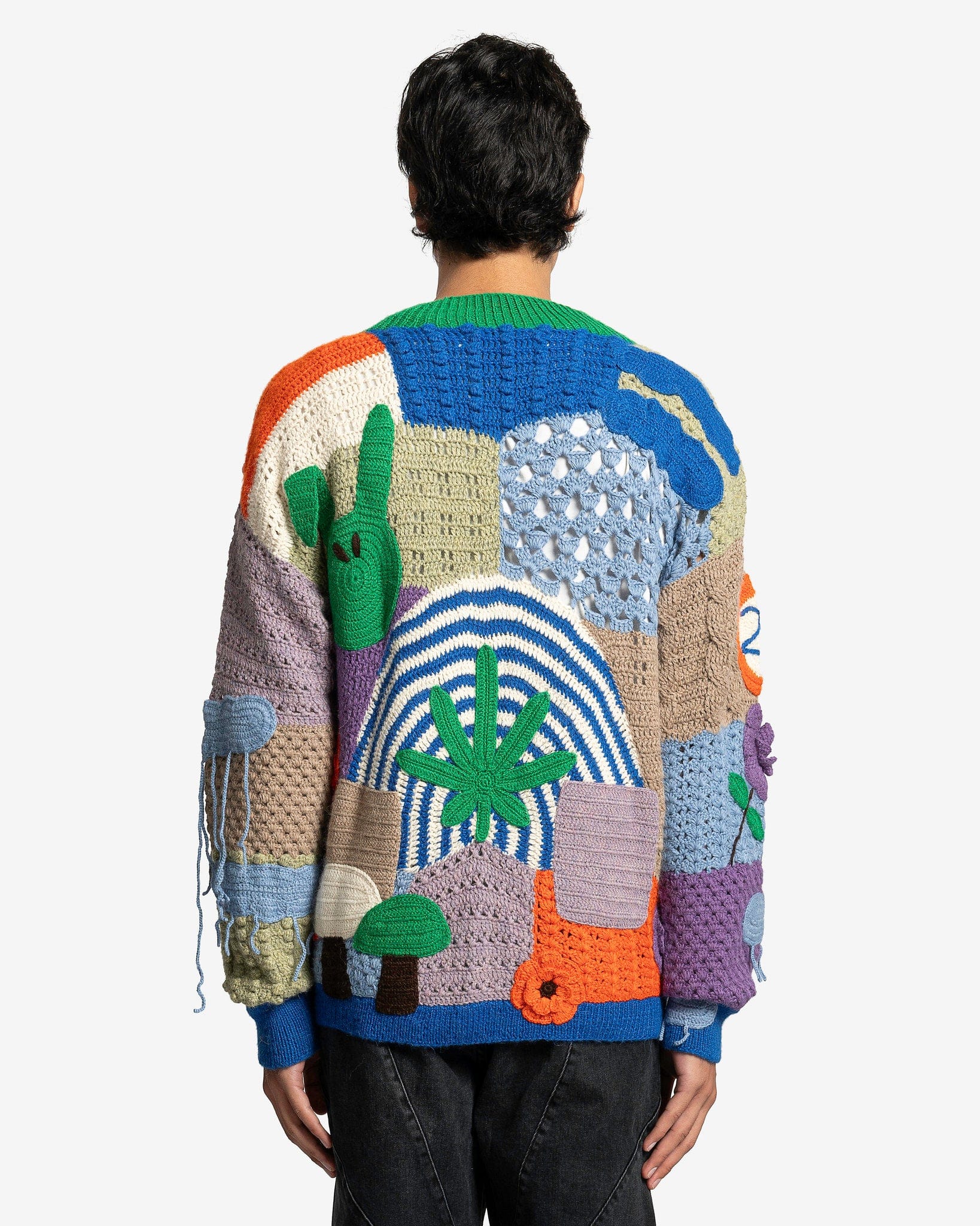 Nahmias men's crocheted paneled sweater in rainbow. This sweater is made of multiple colorful patches and has graphic appliques throughout the body.