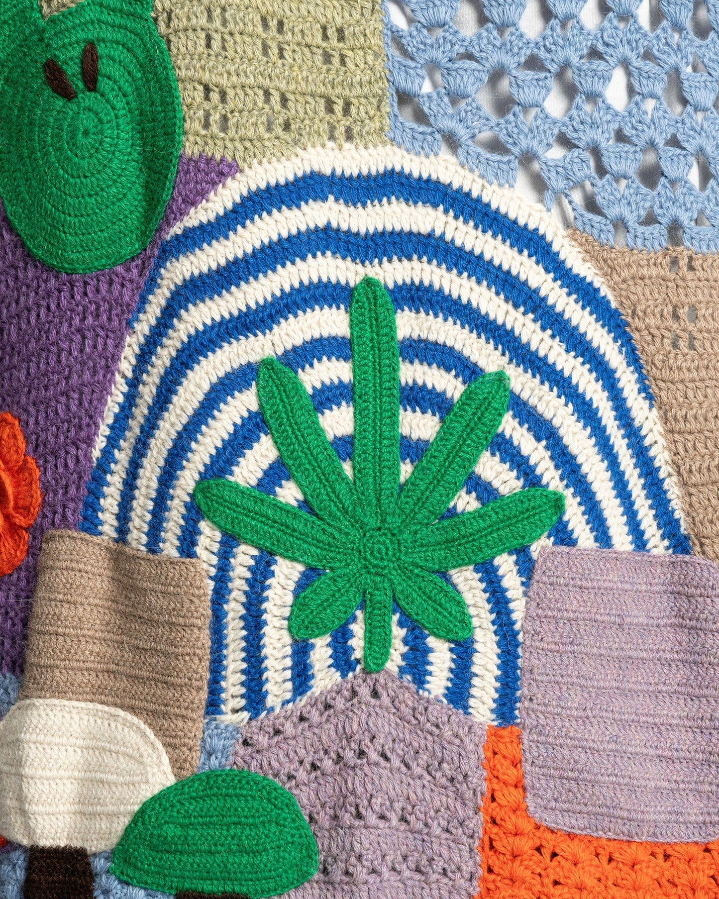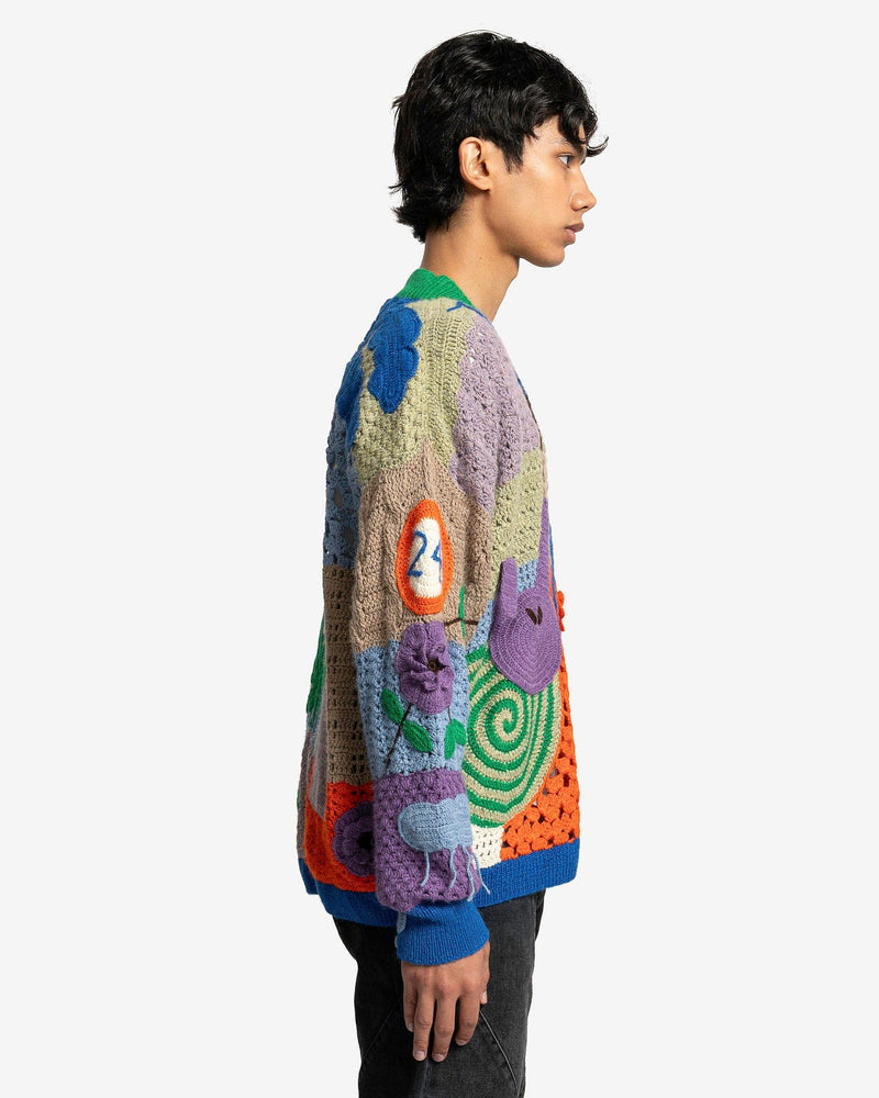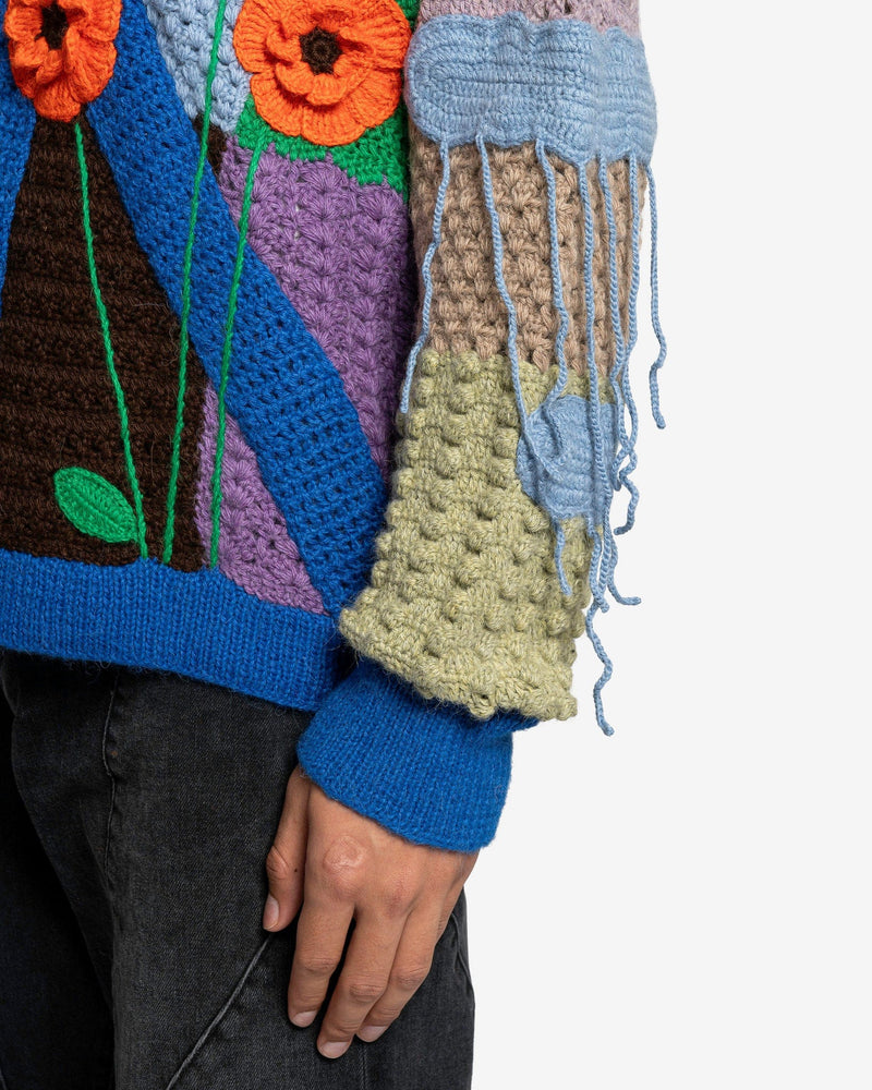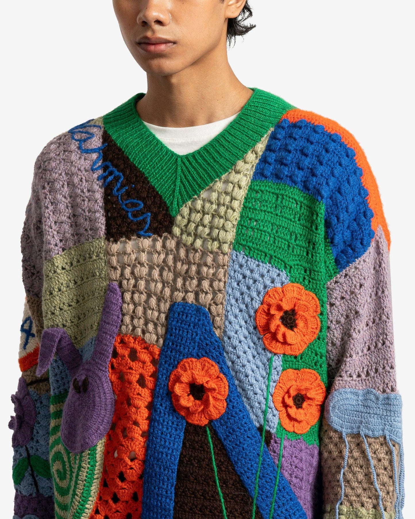 Nahmias men's crocheted paneled sweater in rainbow. This sweater is made of multiple colorful patches and has graphic appliques throughout the body.