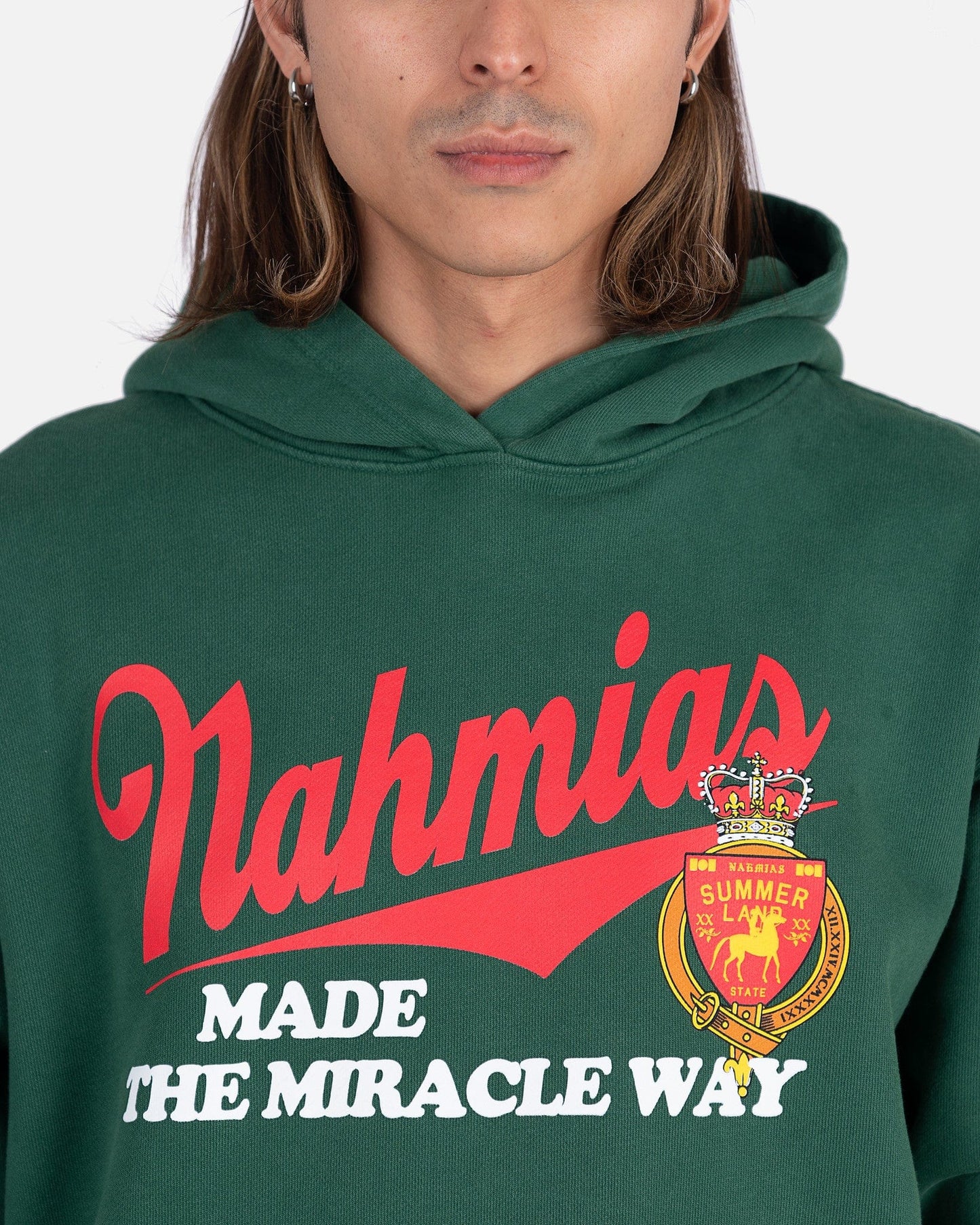 Nahmias men's graphic hoodie in green. This hoodie features the Nahmias logo in red along the chest with the text 'MADE THE MIRACLE WAY' underneath.