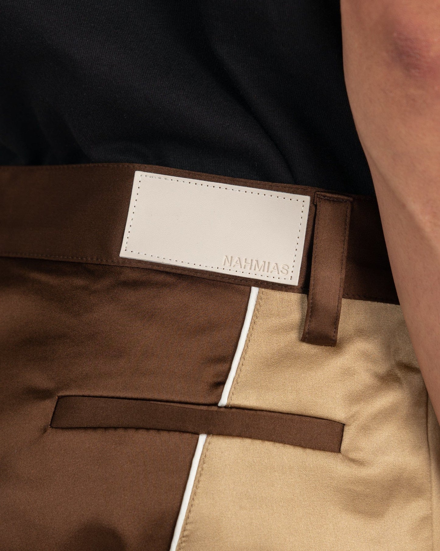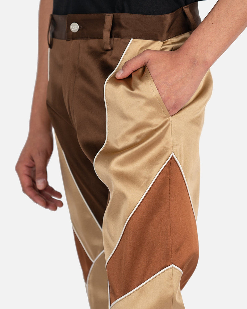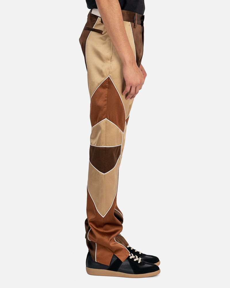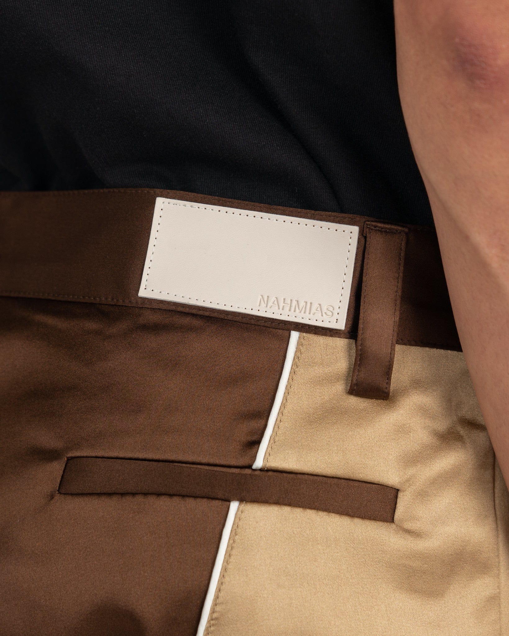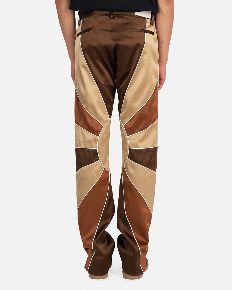 Nahmias men's silk sunshine pants in brown. These pants have a paneled design of the sun along the legs and a leather logo patch on the back.