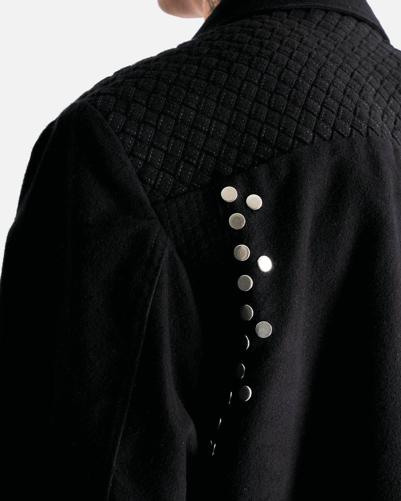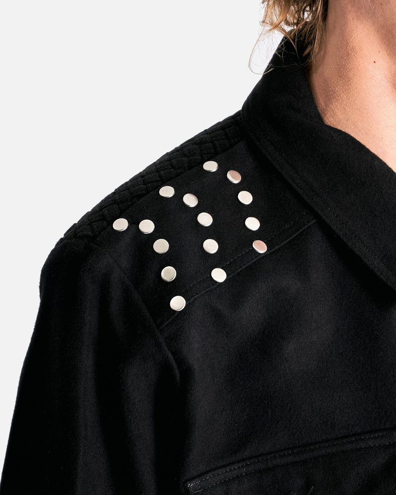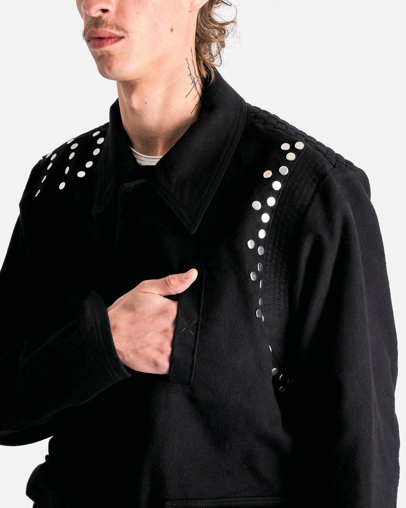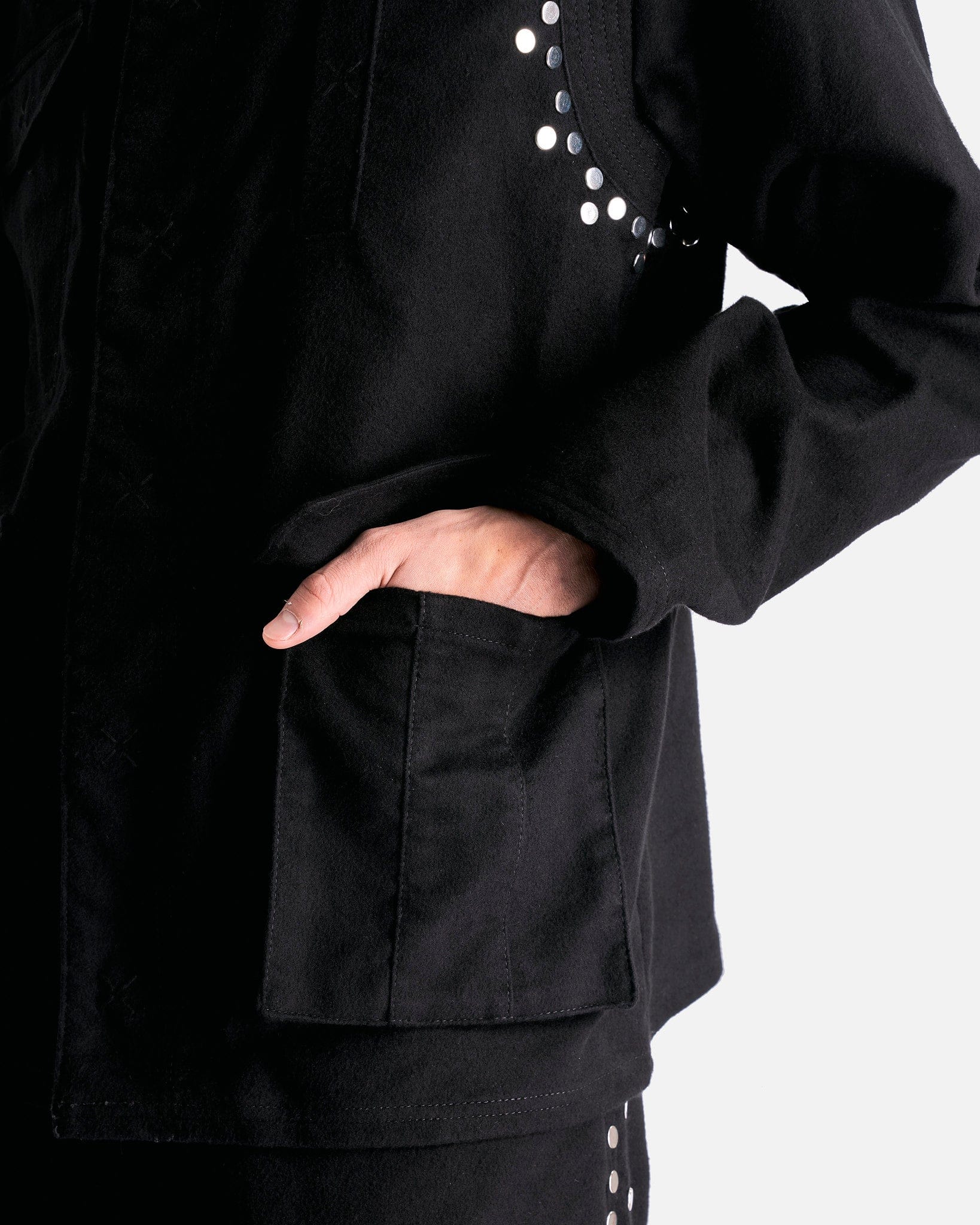NAMACHEKO Braided Yoke Jacket in Black. This jacket is constructed from a brushed moleskin fabric with a soft hand feel. It features a classic collar, concealed snap button placket, silver rivet embellishment and a braided design at the back yoke.