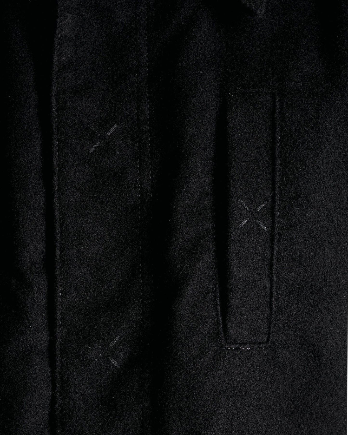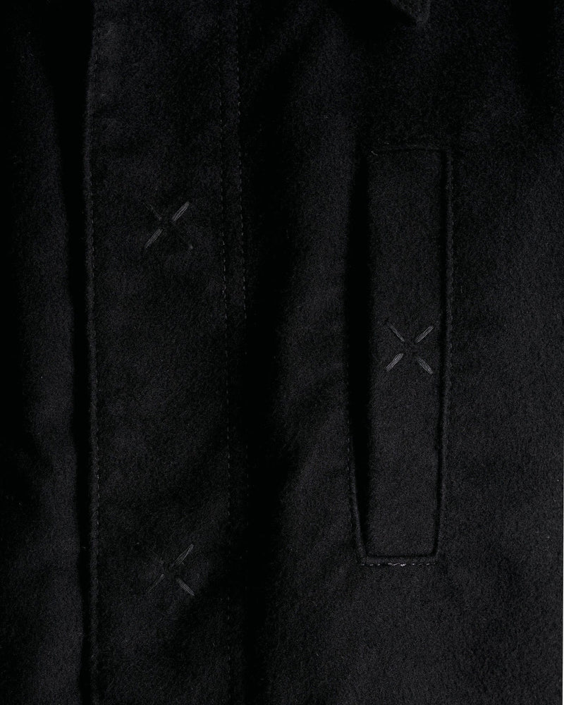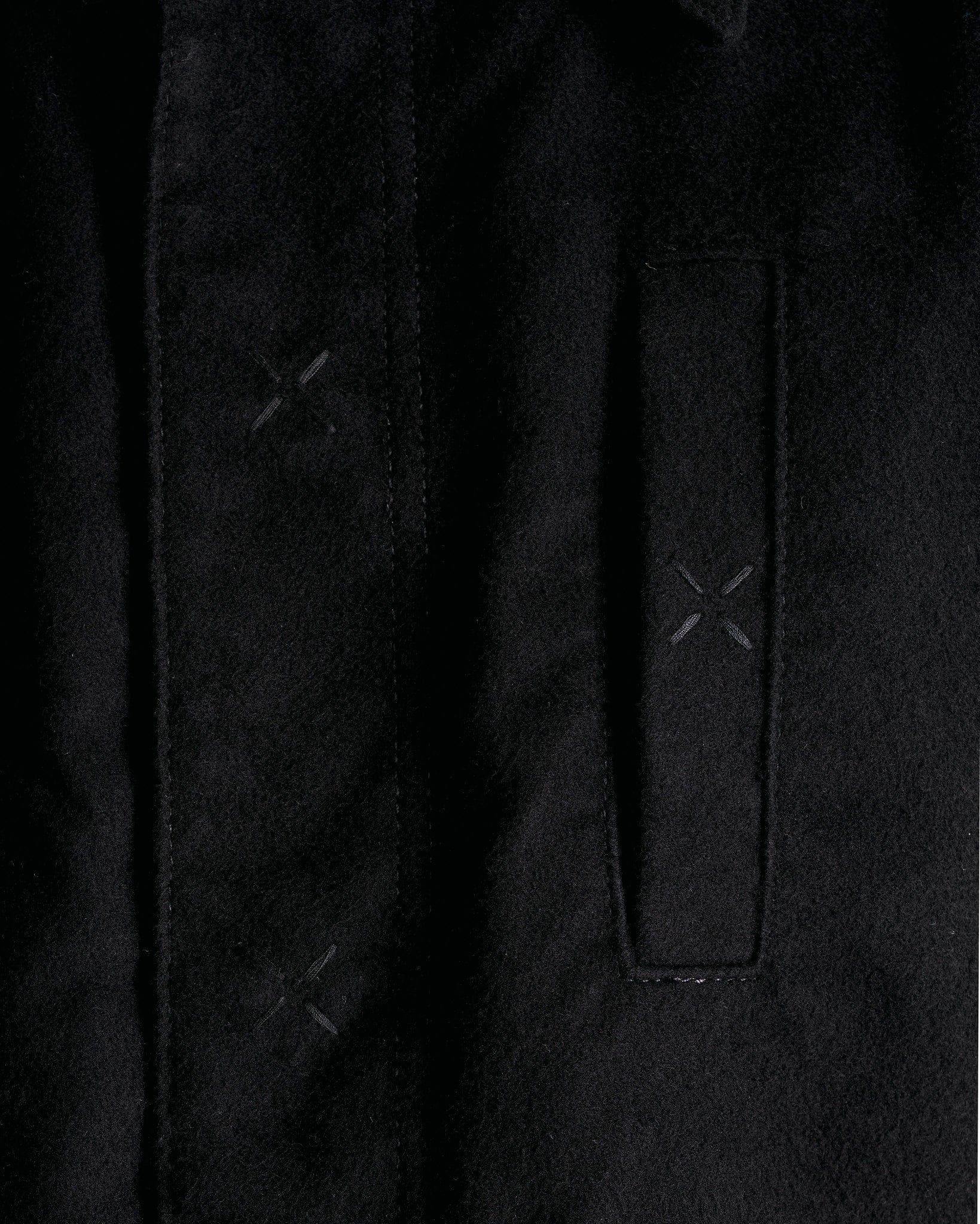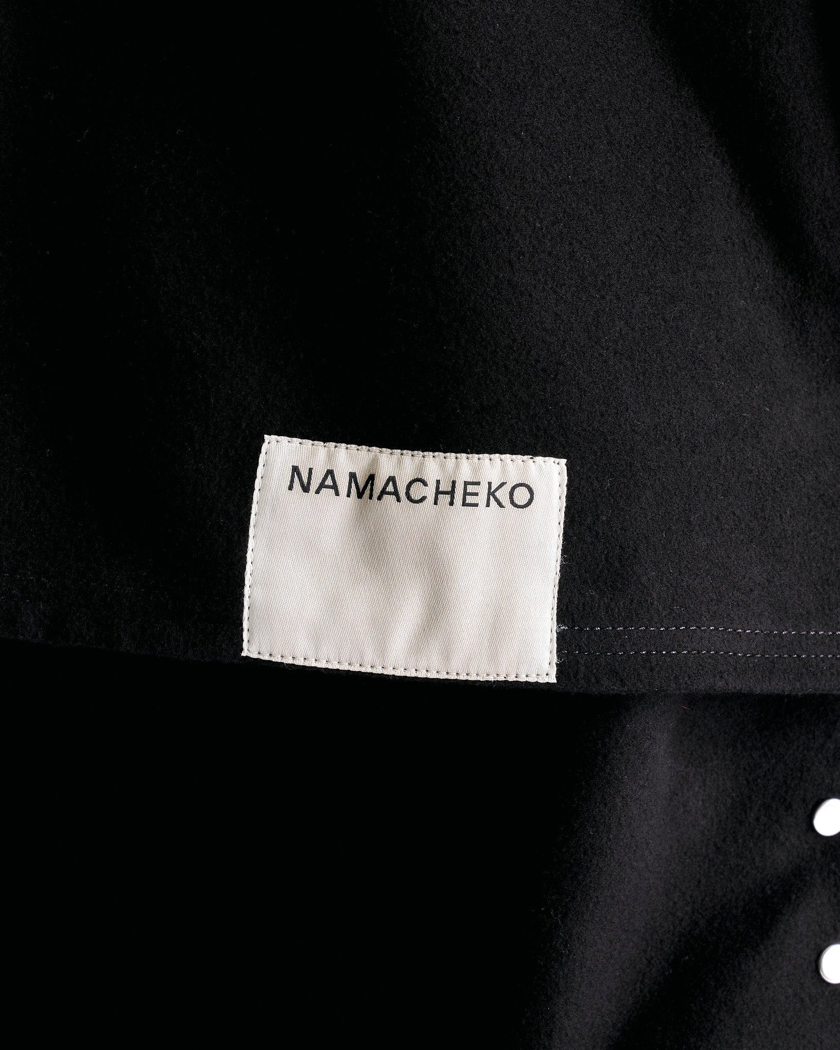 NAMACHEKO Braided Yoke Jacket in Black. This jacket is constructed from a brushed moleskin fabric with a soft hand feel. It features a classic collar, concealed snap button placket, silver rivet embellishment and a braided design at the back yoke.