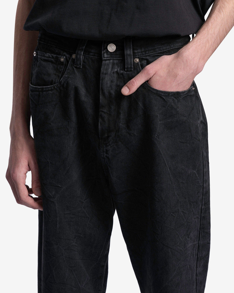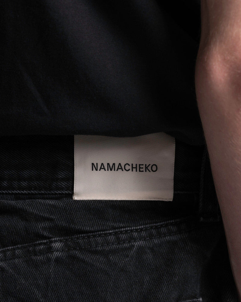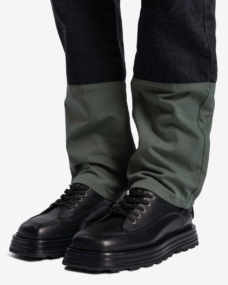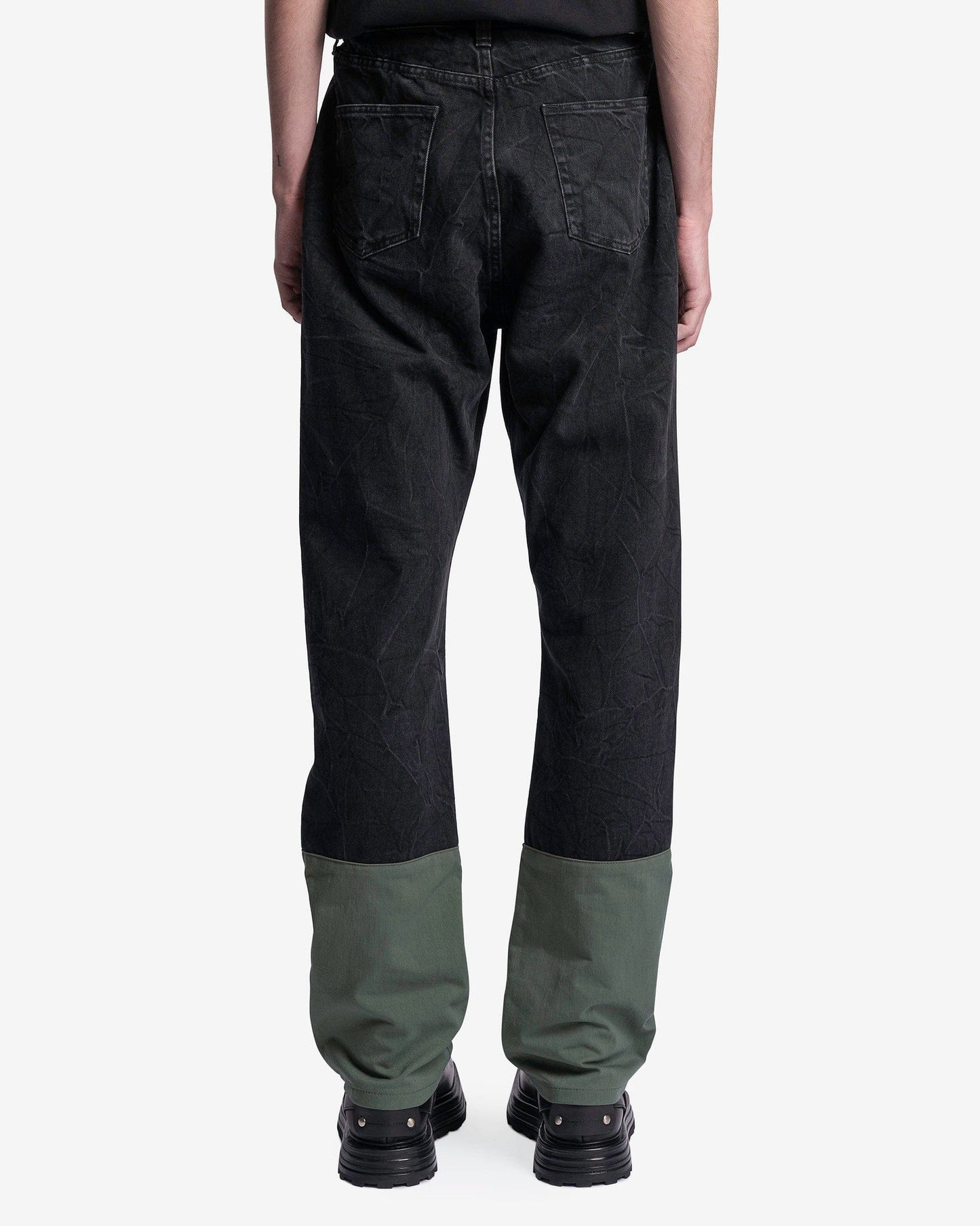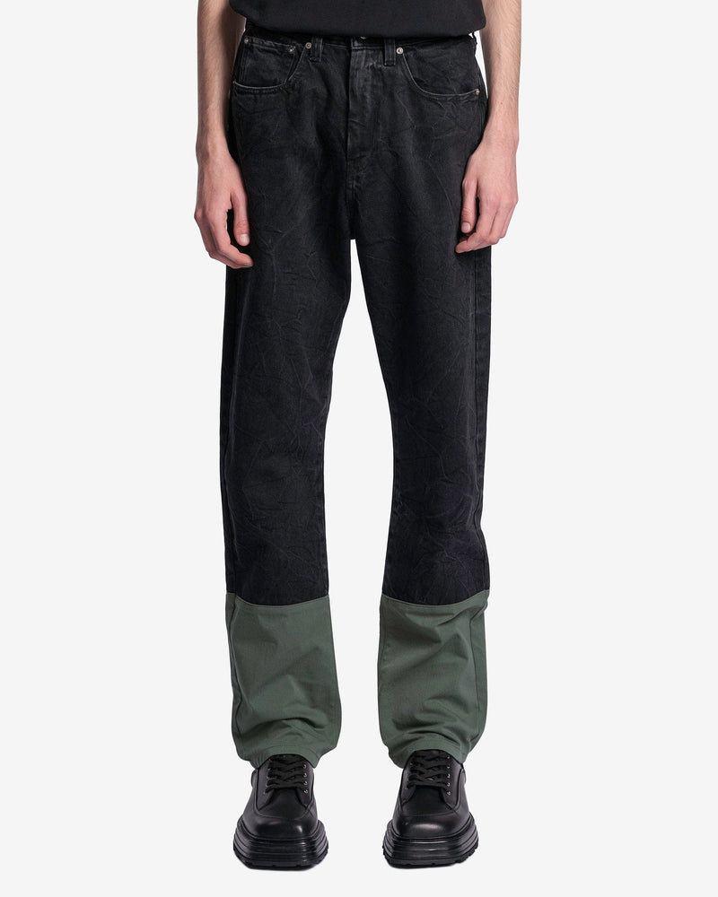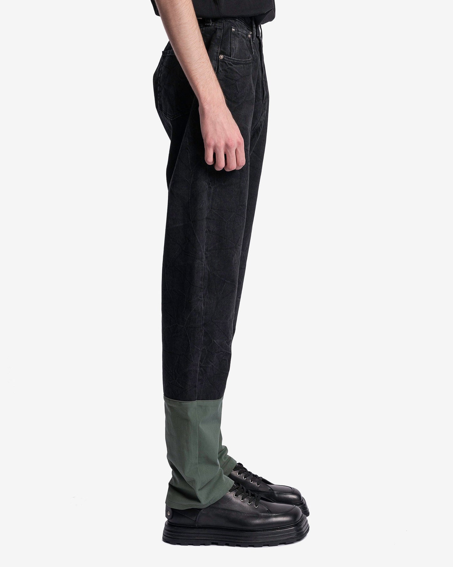NAMACHEKO men's paneled denim jeans in black and green. These pants feature a five pocket composition and green panel at the cuffs.