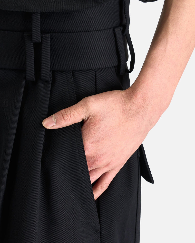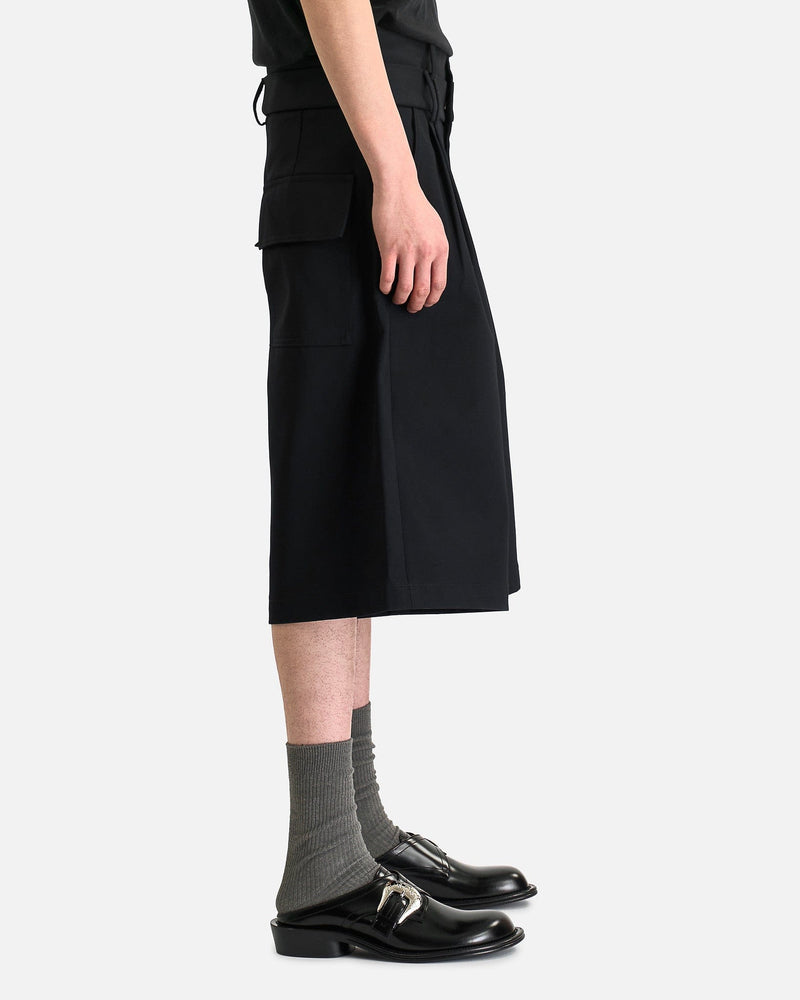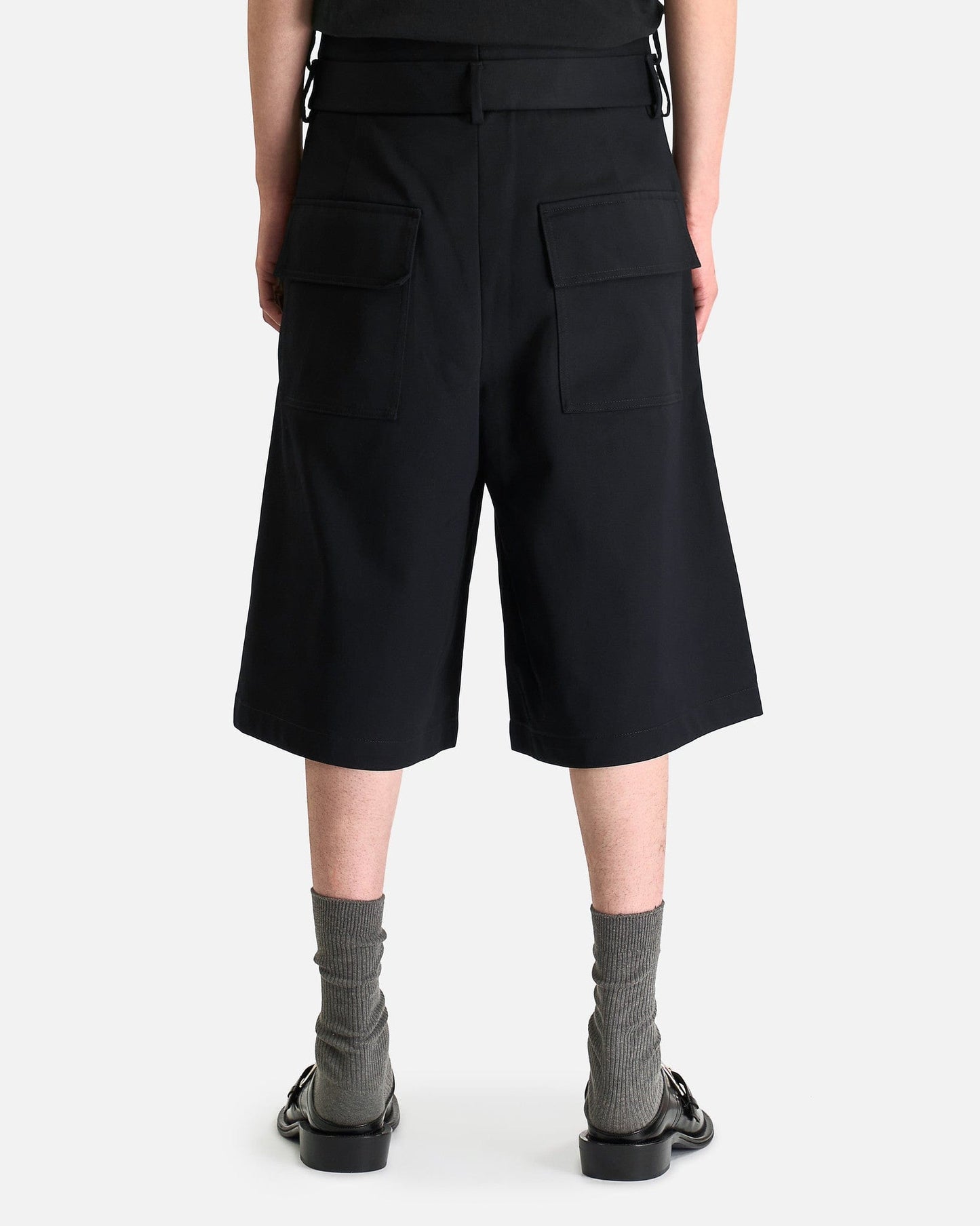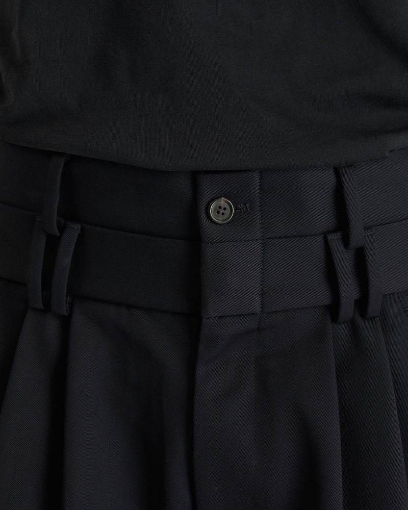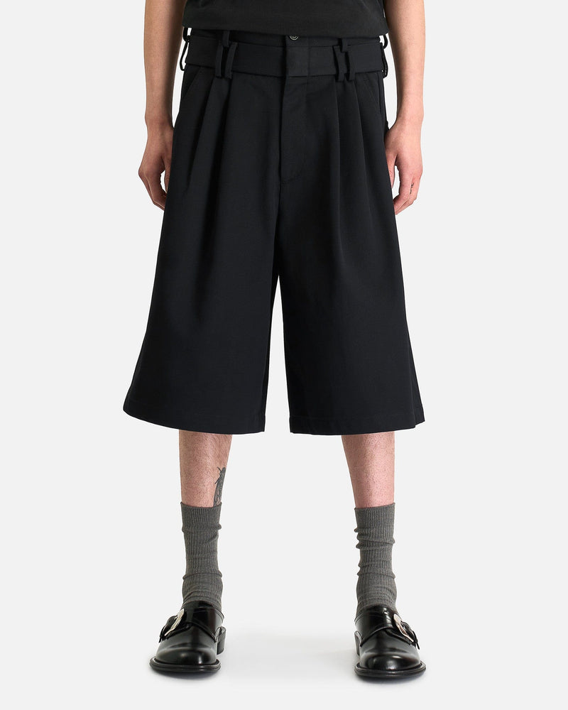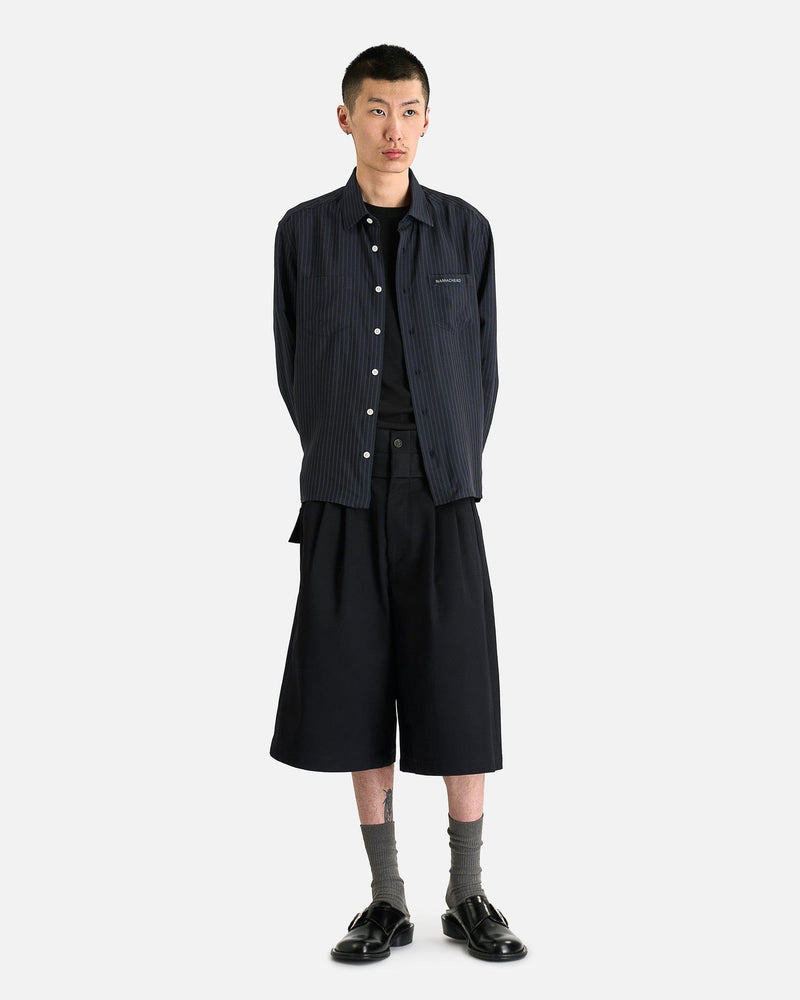 NAMACHEKO Double Waistband Shorts in Dark Navy. These shorts are crafted from cotton and feature a double layered waistband, zip fly and button closure, 4-pocket styling and a pleated front.