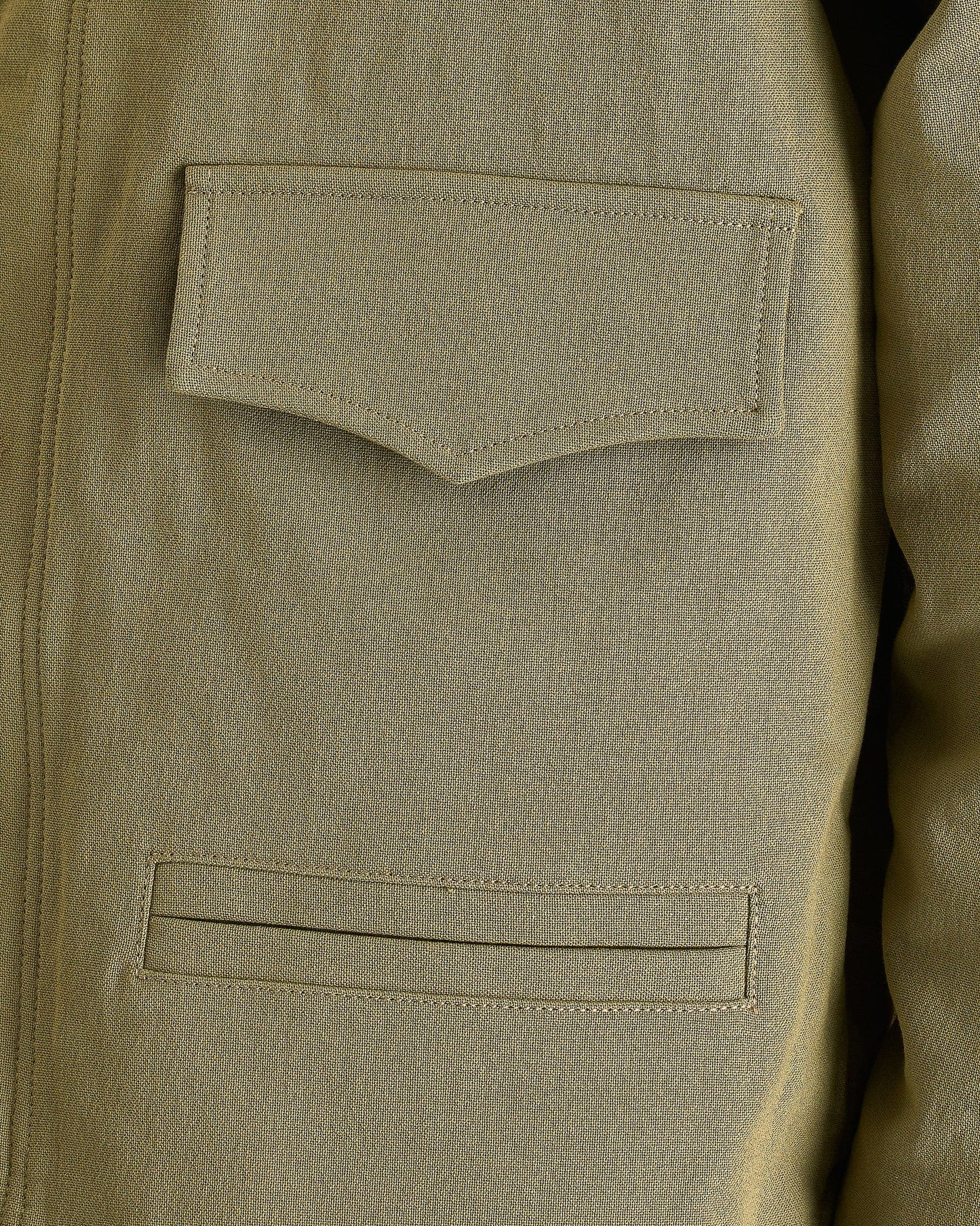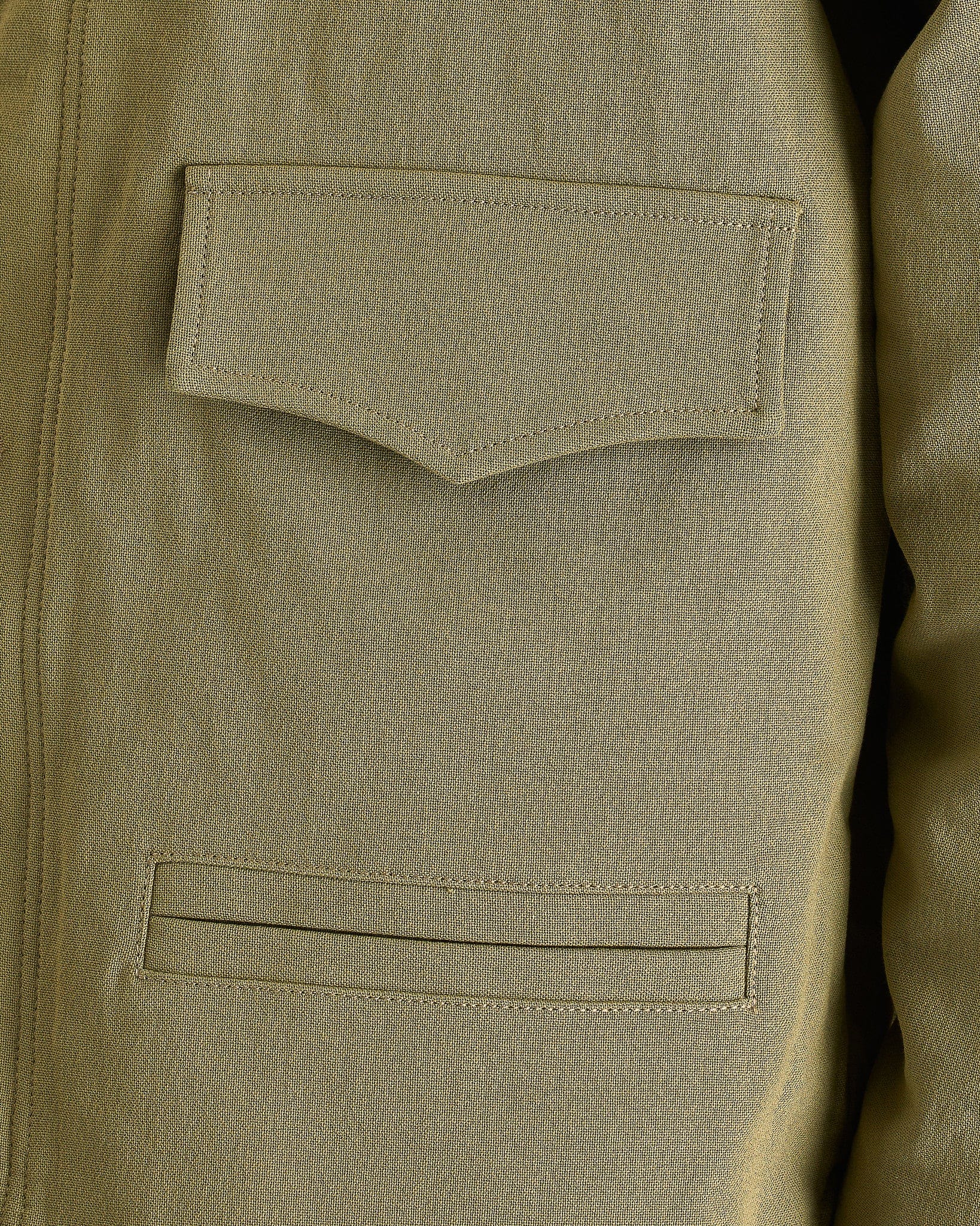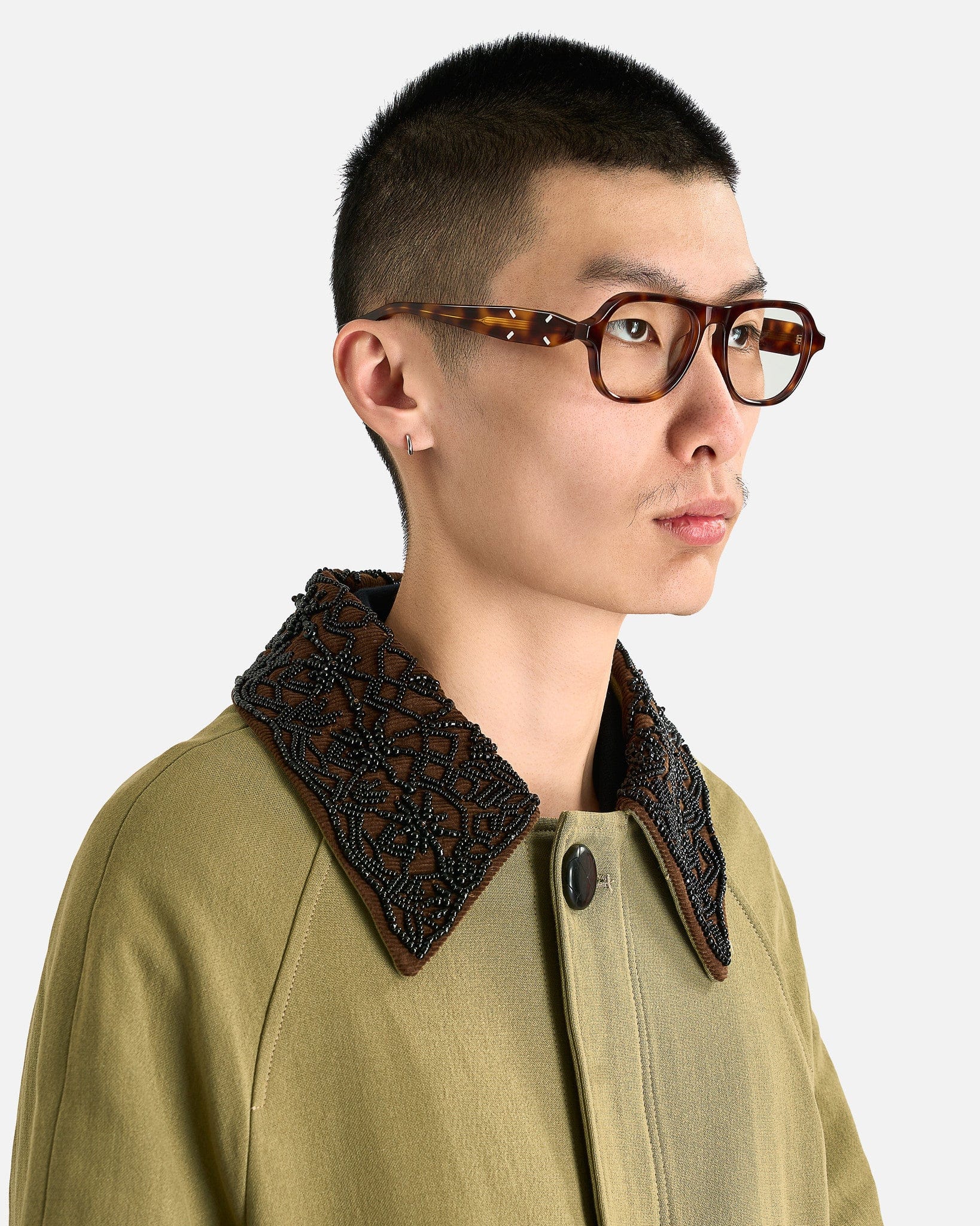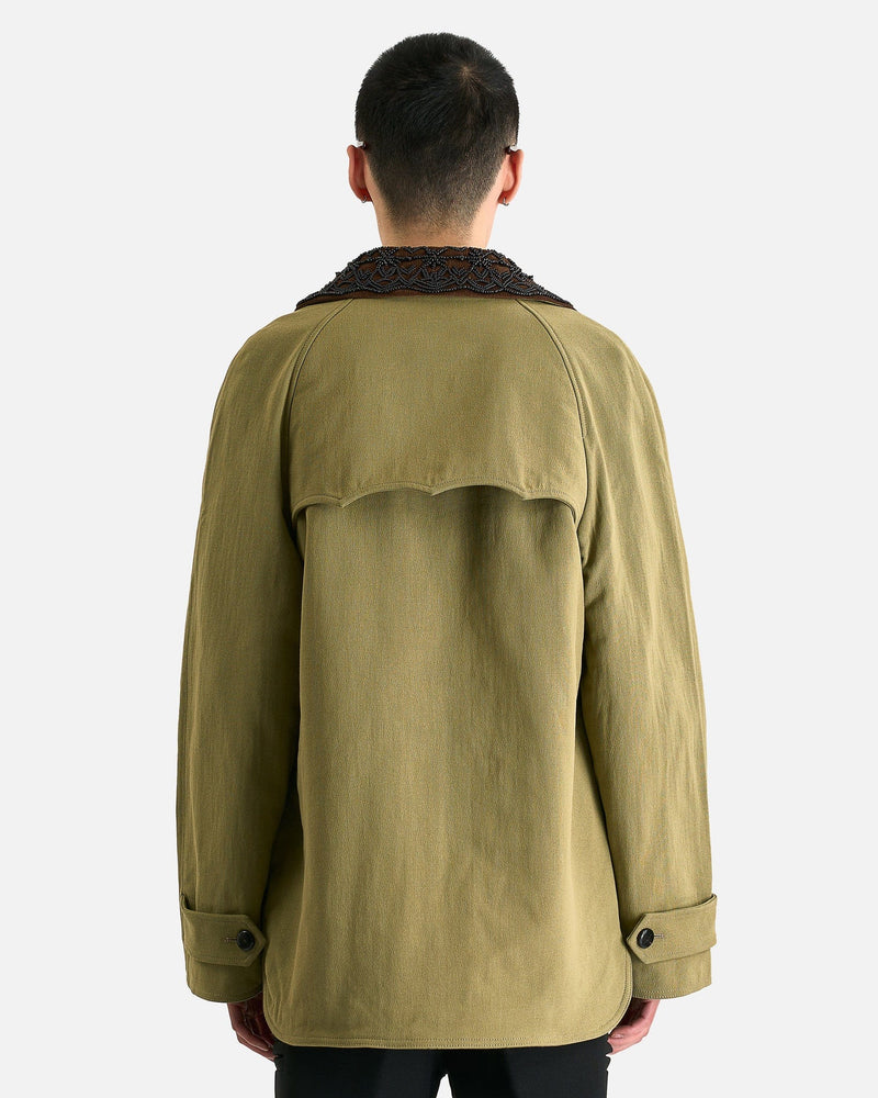 NAMACHEKO Embroidered Collar Jacket in Pistachio. This jacket is crafted from a luxurious cotton blend and features a spread collar with handmade embroidered black beaded detail, patch and welt pockets at the front and placket with button fastening with concealed zip closure.