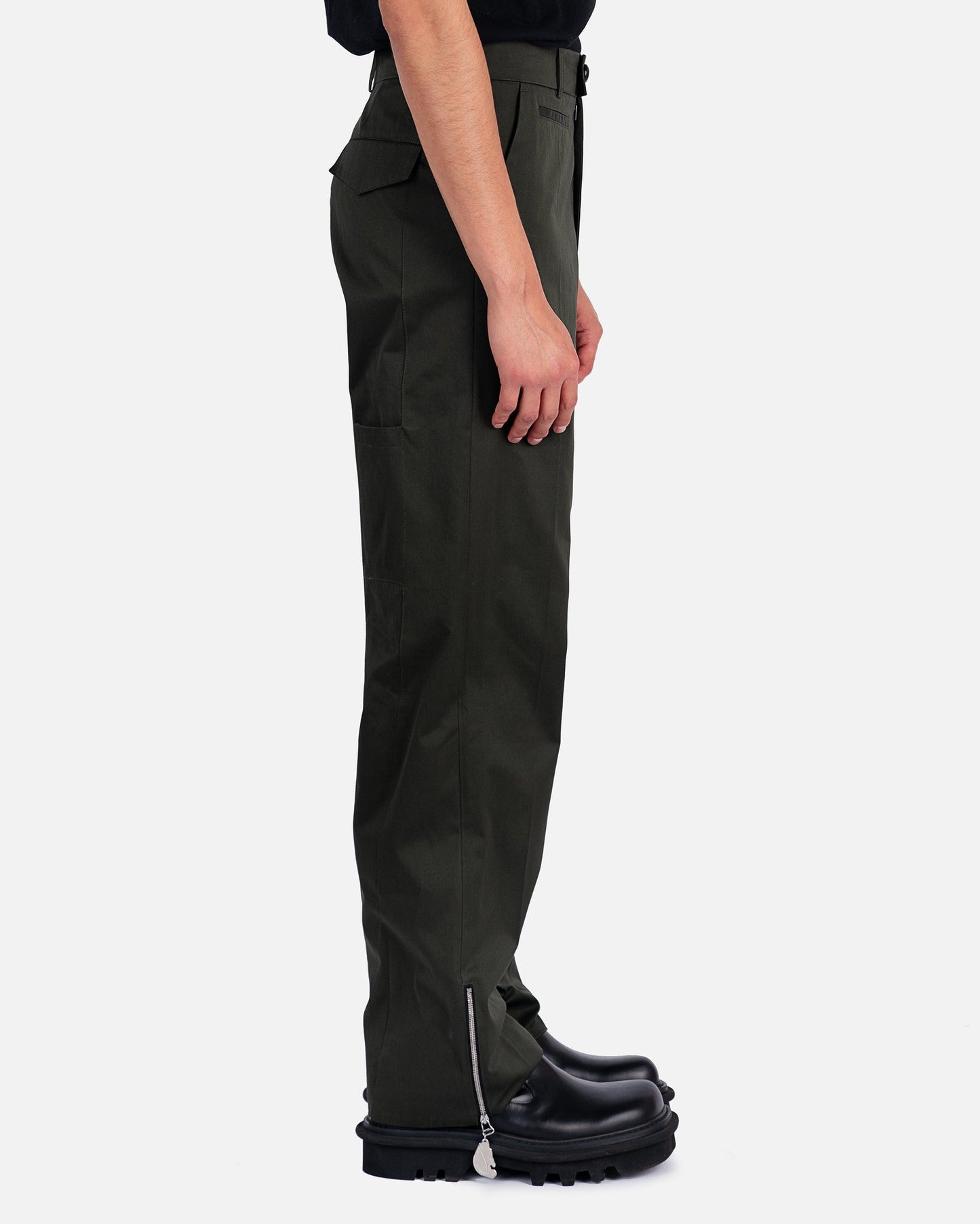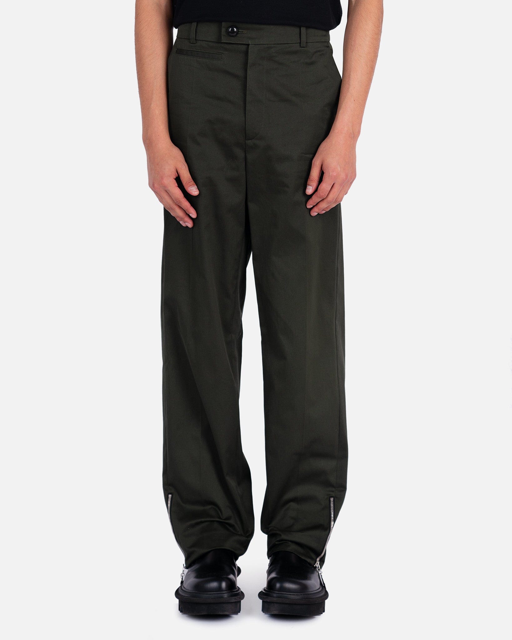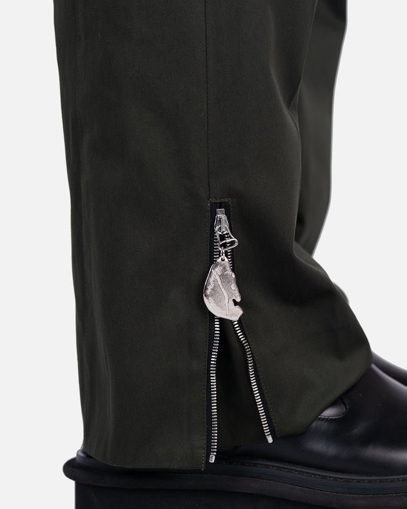 NAMACHEKO men's zip detail trousers in green. These pants are high-waisted and use front zip and button closure. There are short side zippers at the hem.