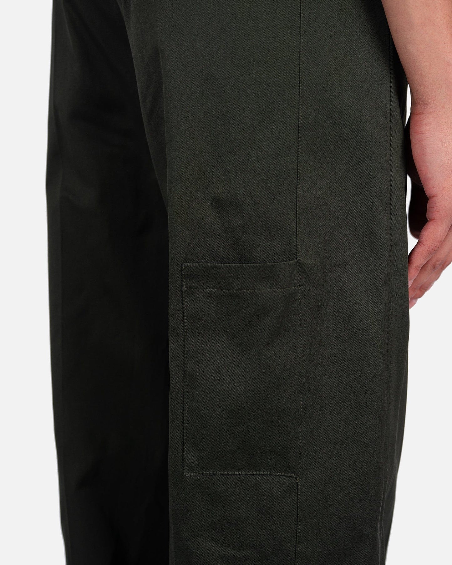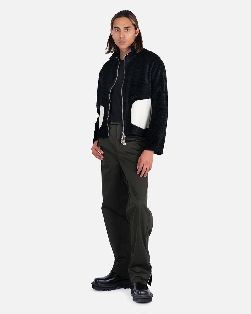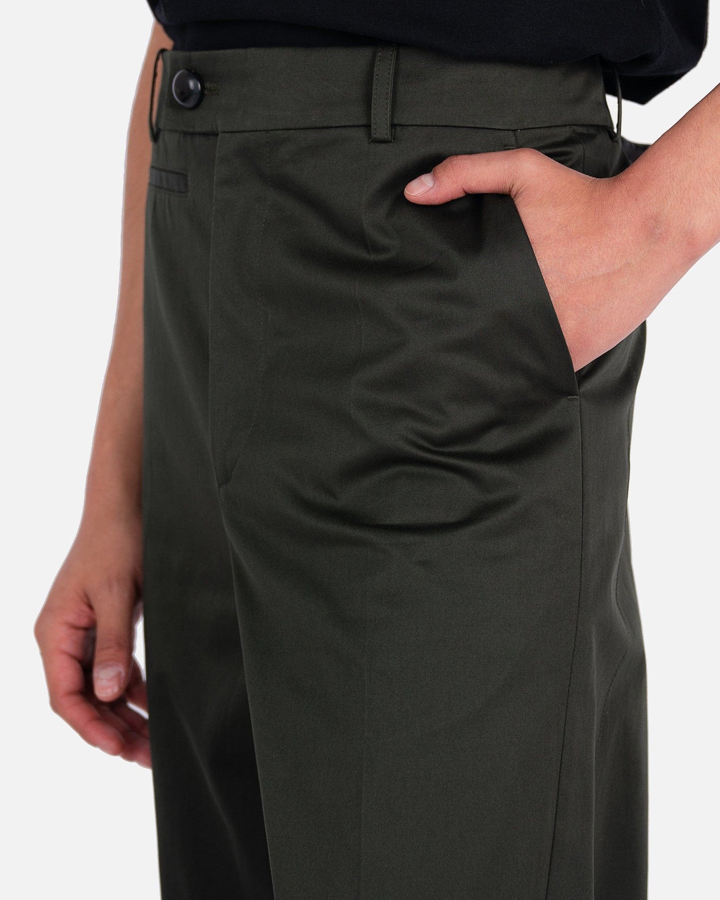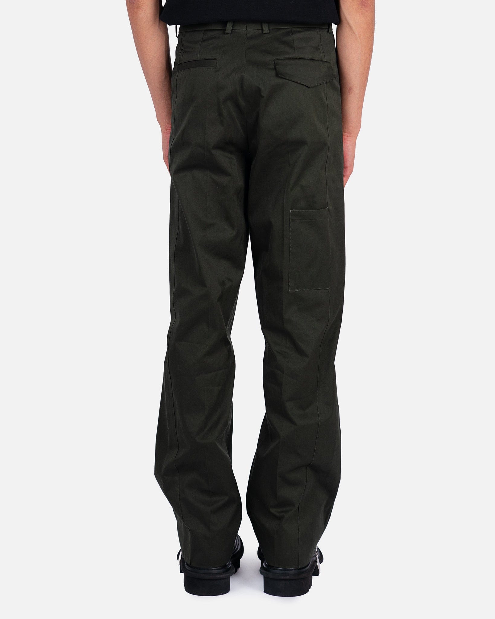 NAMACHEKO men's zip detail trousers in green. These pants are high-waisted and use front zip and button closure. There are short side zippers at the hem.
