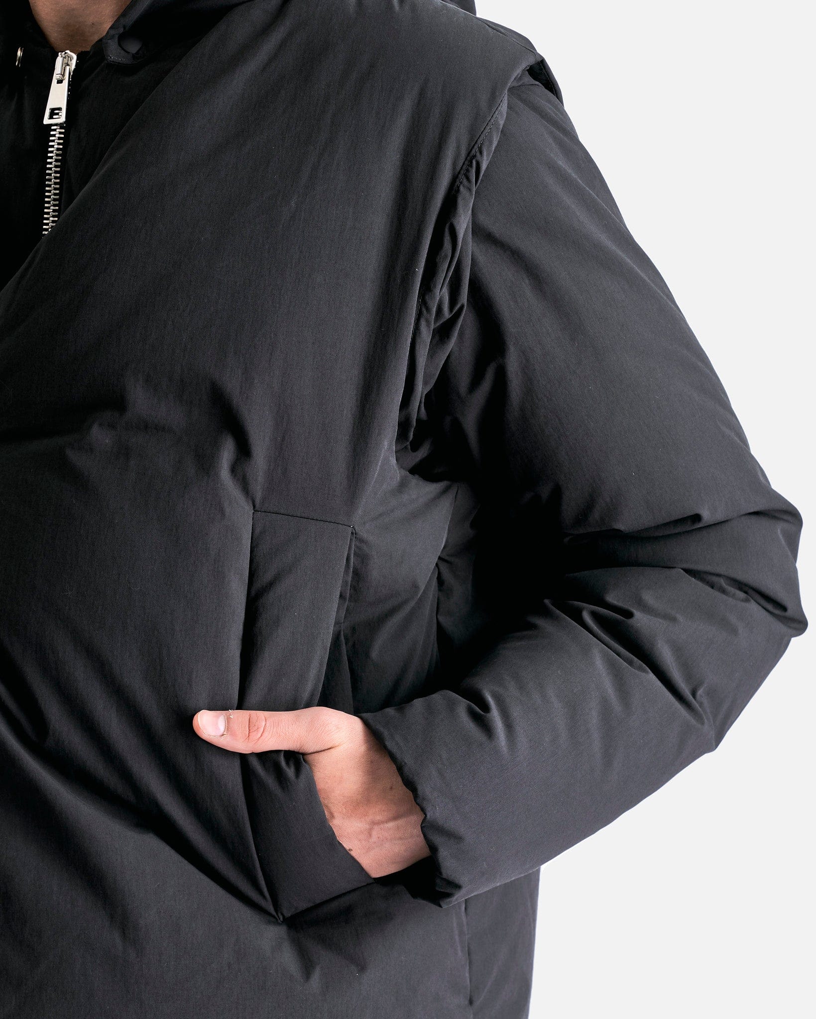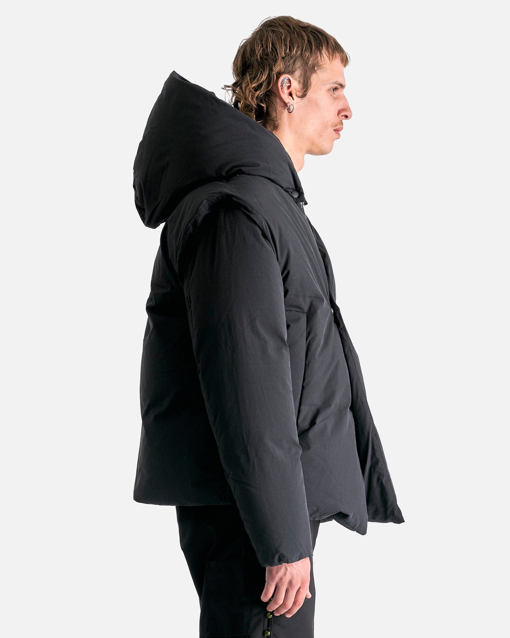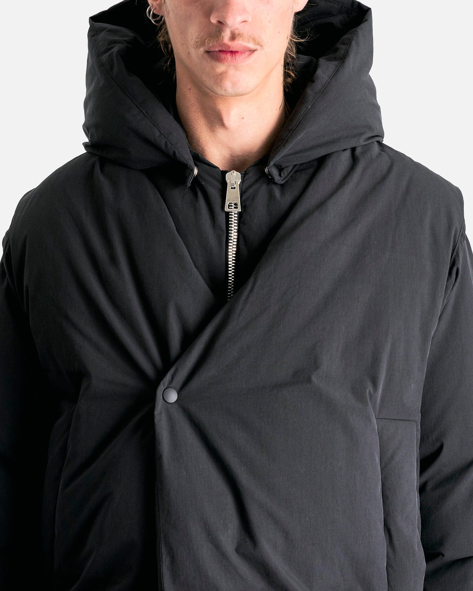 NAMACHEKO Gifford Down Jacket in Black. This jacket features a layered design, front snap button cover with two-way zip closure underneath, detachable padded hood, side welt pockets and a straight hem.