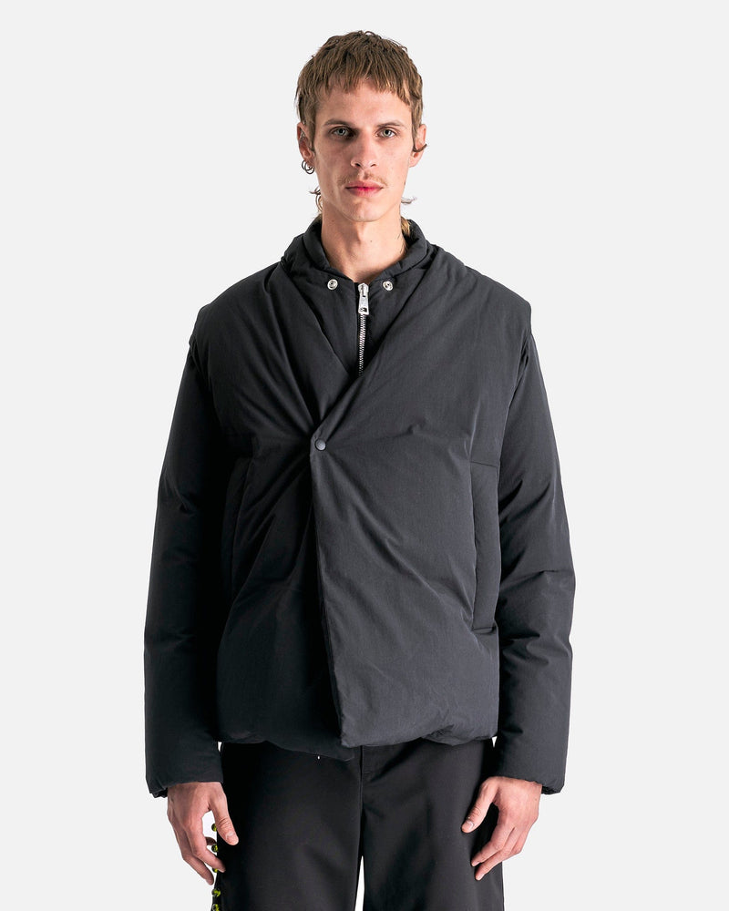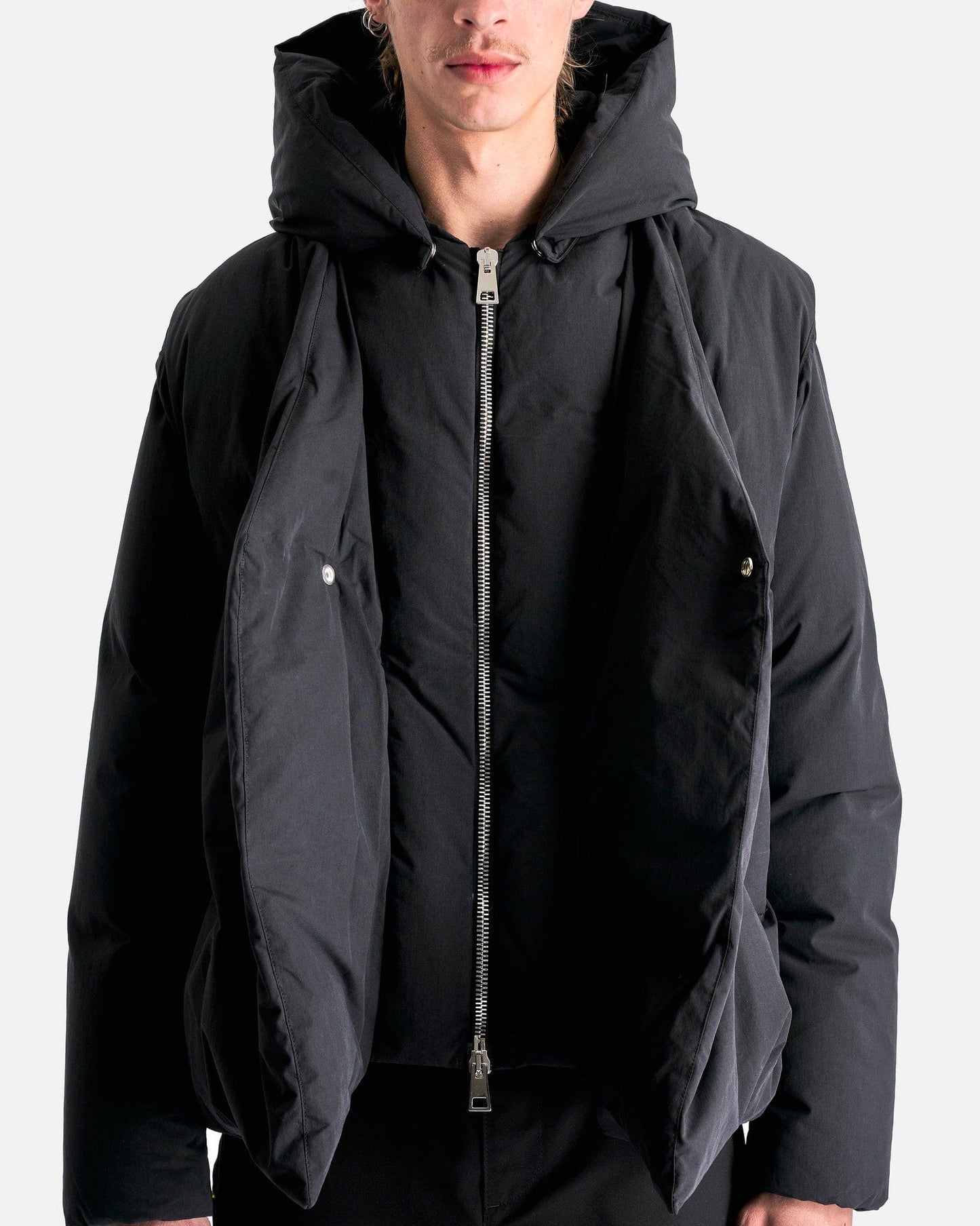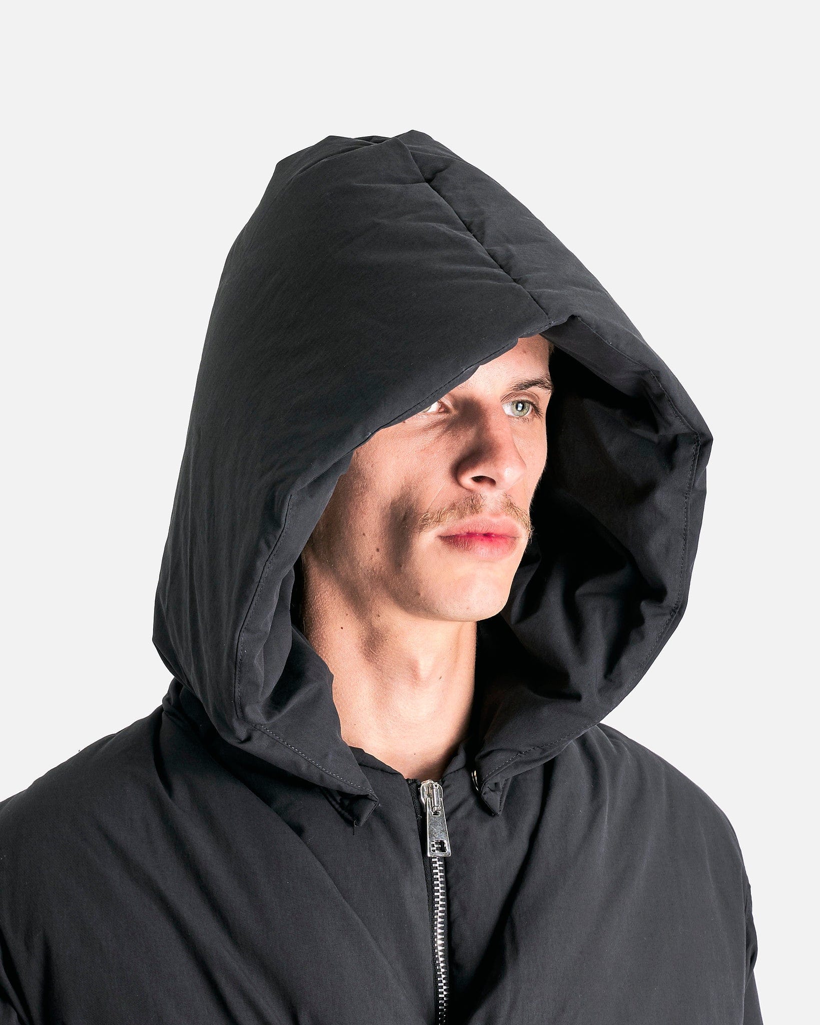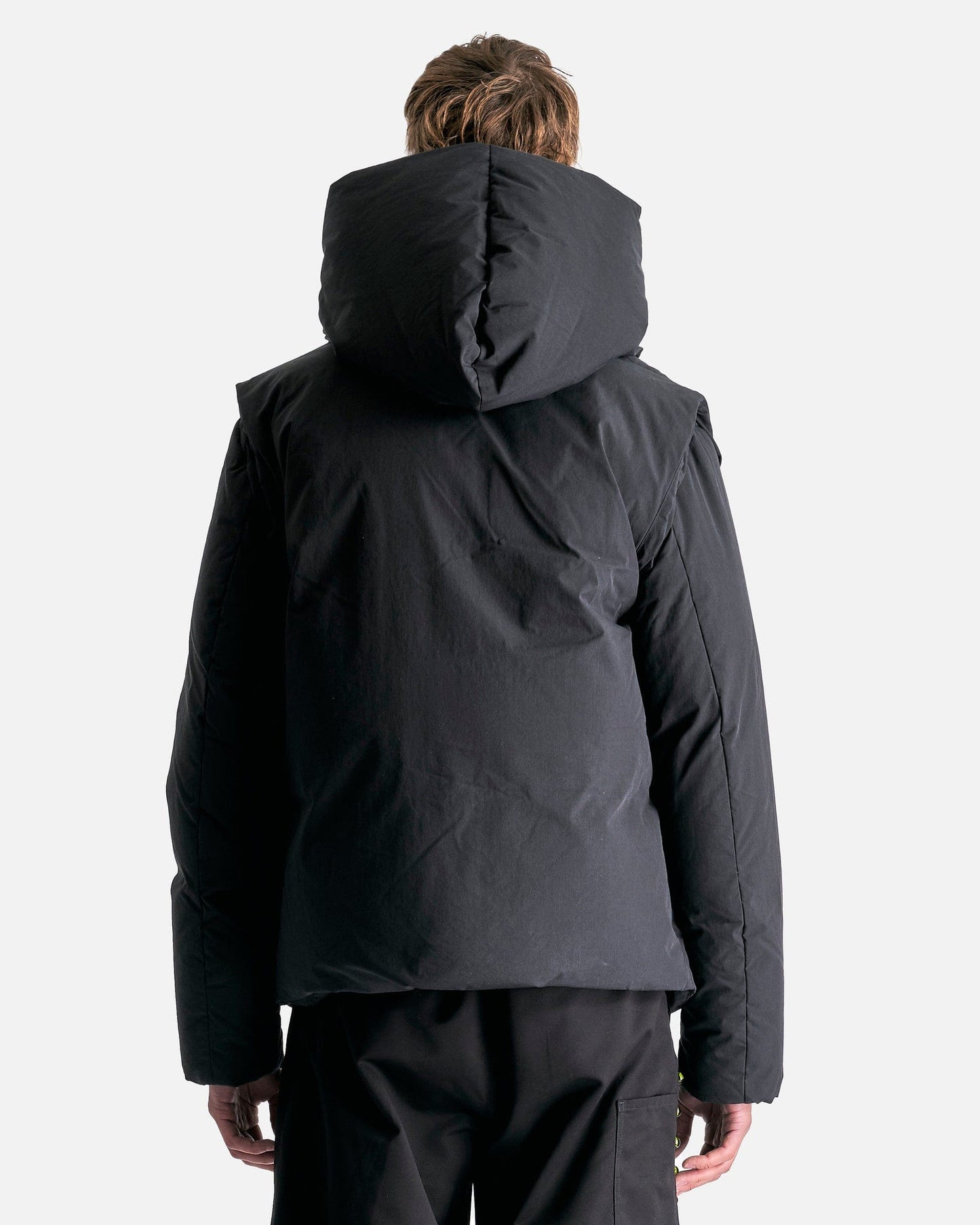NAMACHEKO Gifford Down Jacket in Black. This jacket features a layered design, front snap button cover with two-way zip closure underneath, detachable padded hood, side welt pockets and a straight hem.