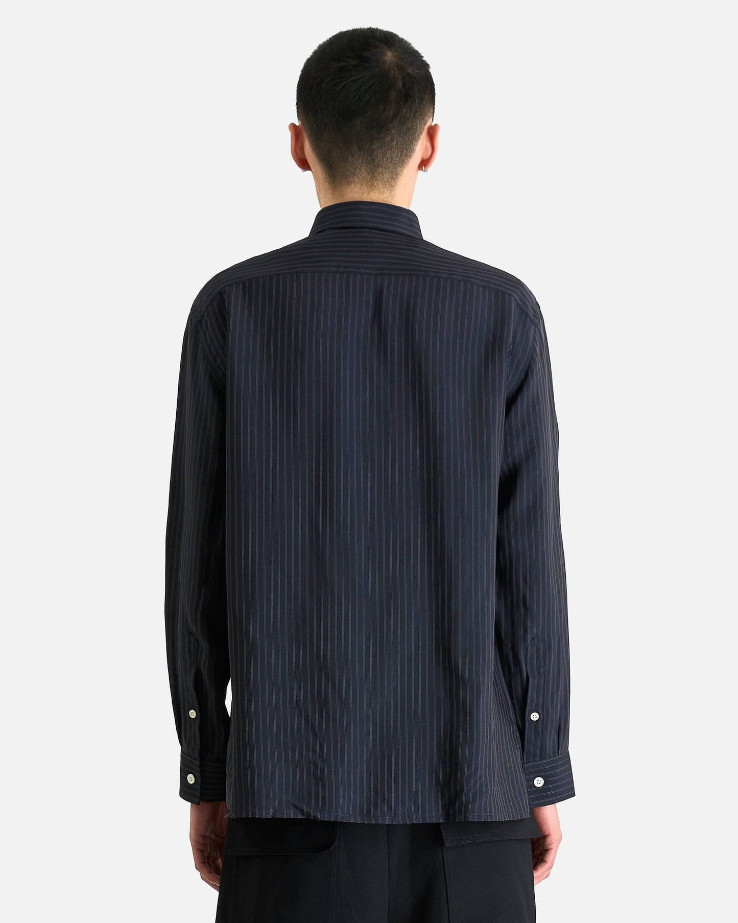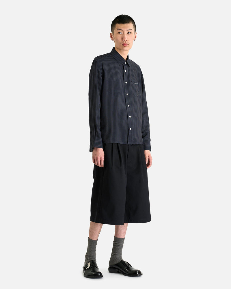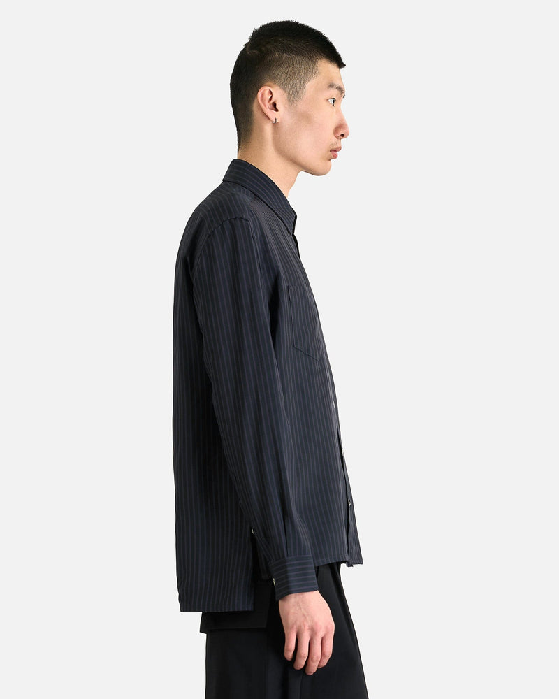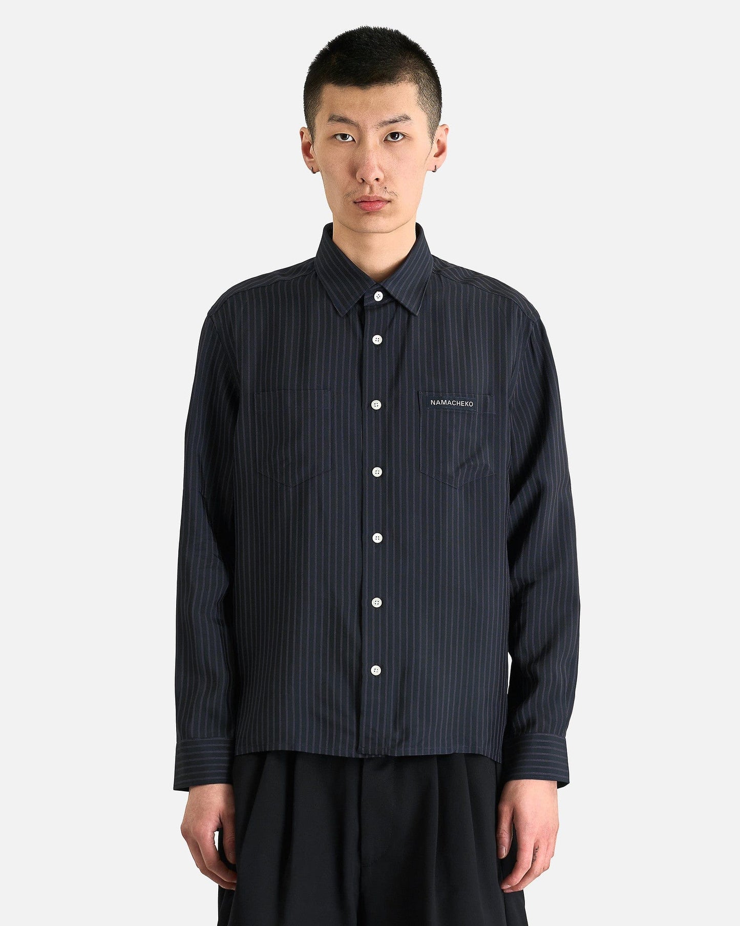 NAMACHEKO Guardia Shirt in Midnight Blue. This shirt is constructed from a rich viscose blend and features a classic collar, center-front button closure and two patch pockets at the chest.
