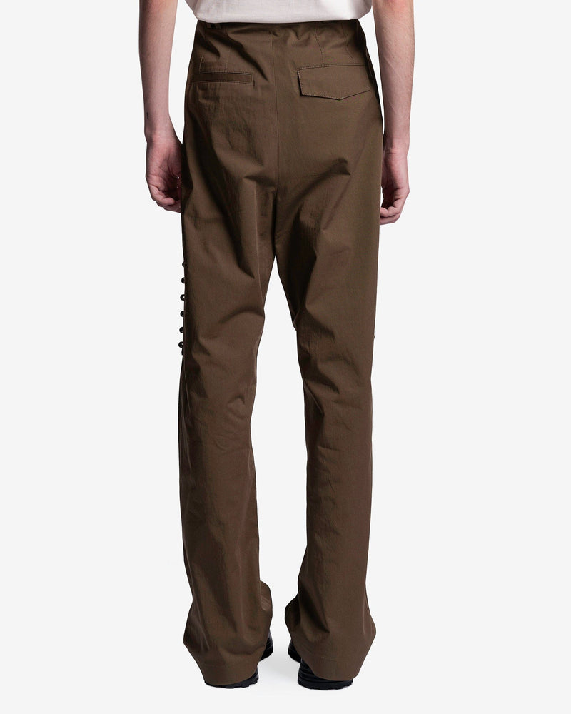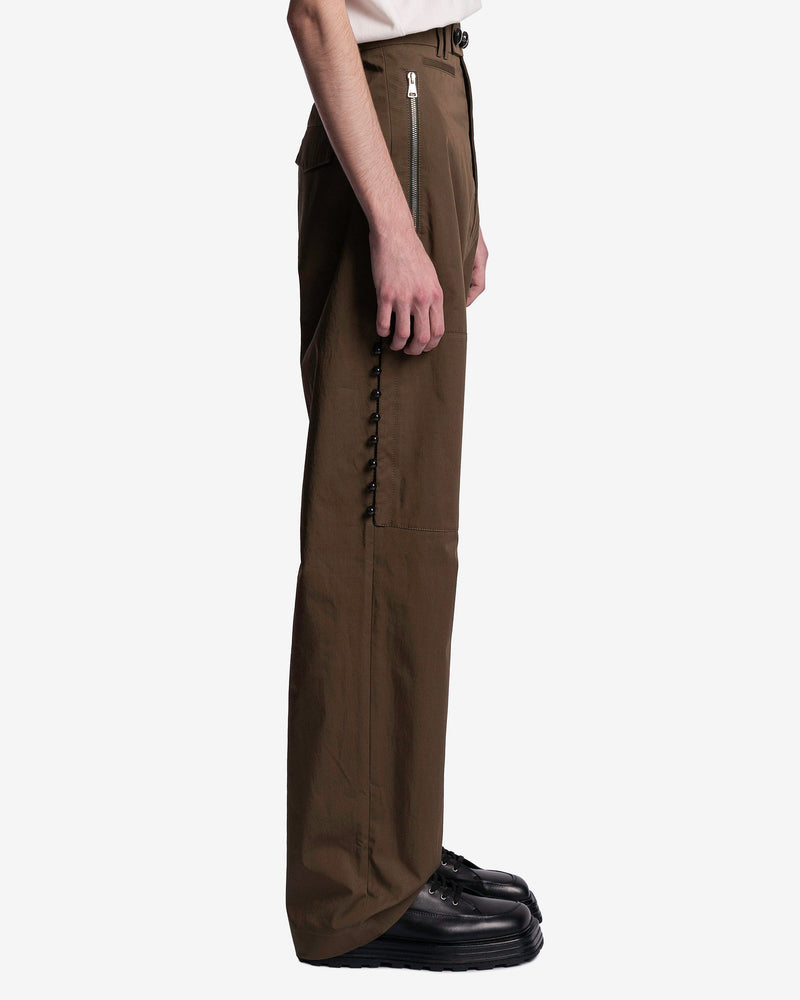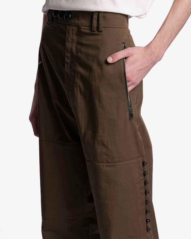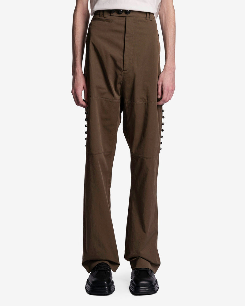 NAMACHEKO men's button detail trousers in green-khaki. These pants feature off-center front button fastening and beaded button details along the legs.