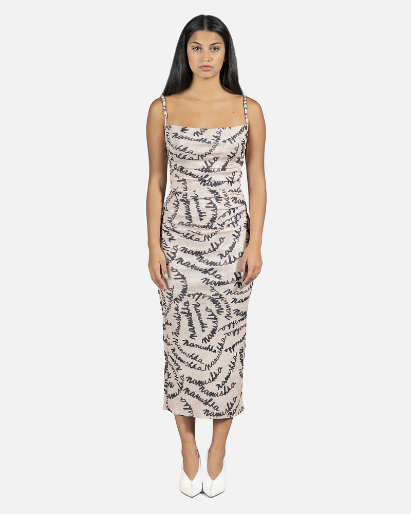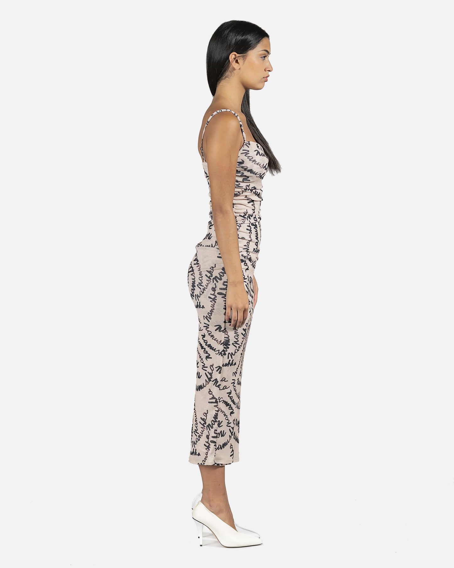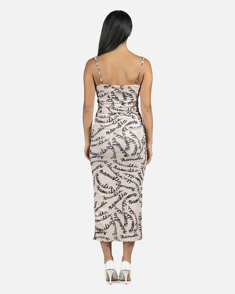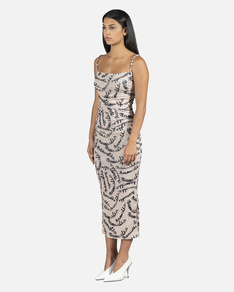 The natural Alexa dress is made from our signature mesh jersey, a lightweight, breathable fabric made entirely from recycled polyester. A ‘90s-inspired style, it falls from thin straps into a flattering ruched silhouette with side slits for ease. It’s finished with a handwritten version of our logo.