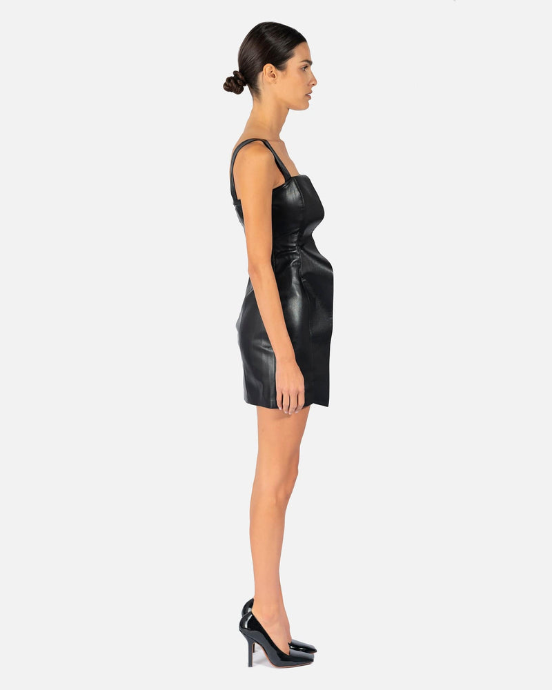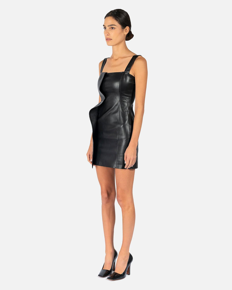 Nanushka women's peplum dress in black. This mini dress features wide straps and a waterfall peplum attachment on the right side. It has a square neckline and concealed back zip closure.