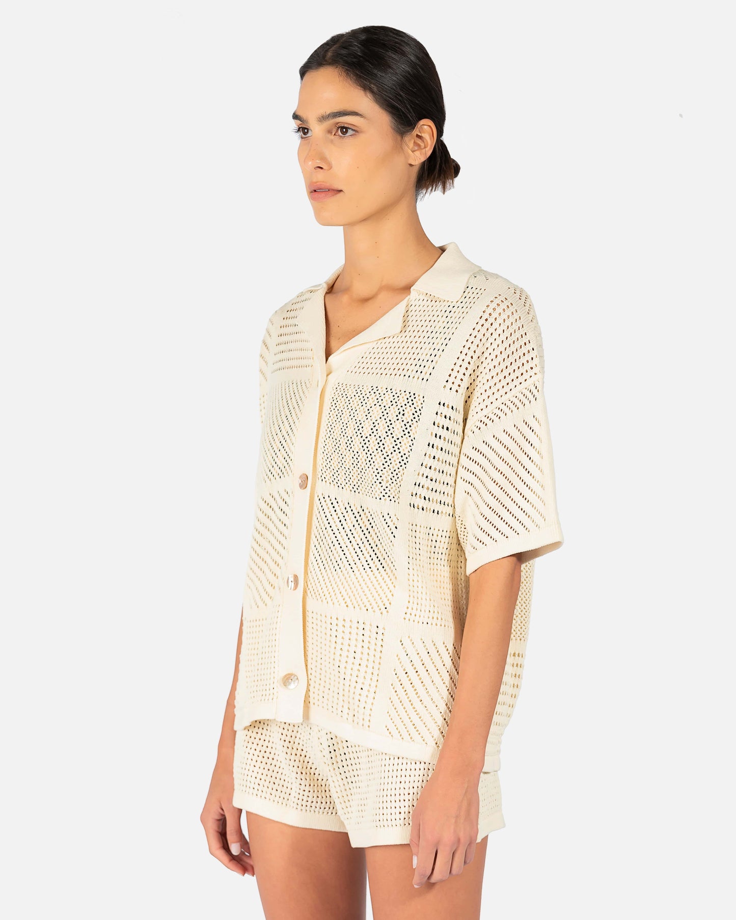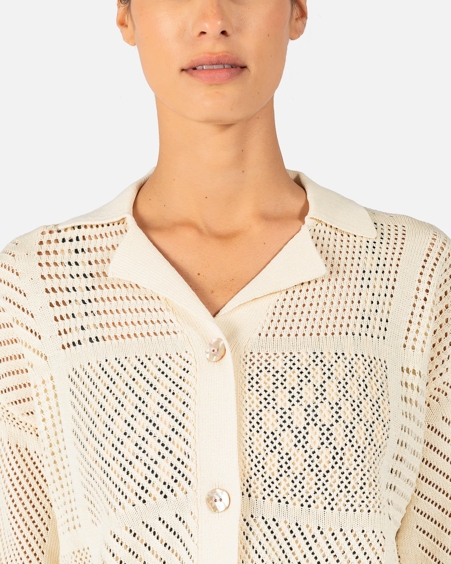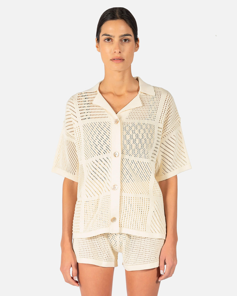 Nanushka women's paper crochet textured shirt. This collared Talissa top is the perfect coverup for a beach day. Featuring light, crocheted panels and oversized sleeves, this sheer top features button closure along the front. There is ribbed detailing along the hems.