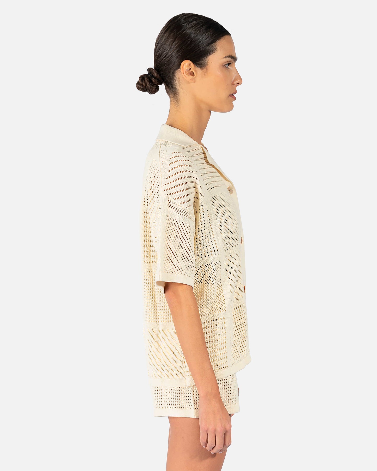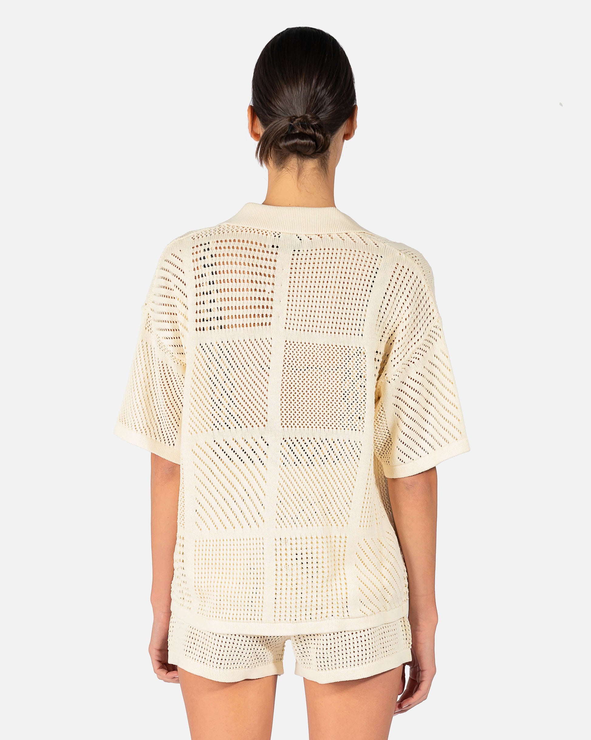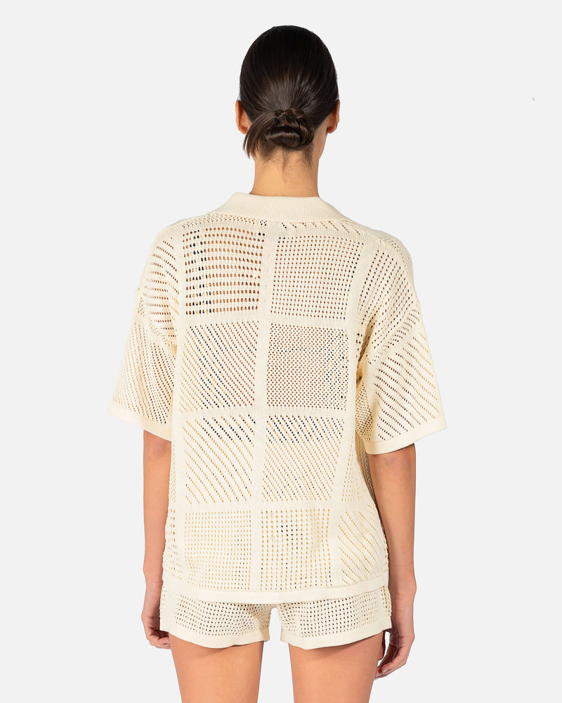 Nanushka women's paper crochet textured shirt. This collared Talissa top is the perfect coverup for a beach day. Featuring light, crocheted panels and oversized sleeves, this sheer top features button closure along the front. There is ribbed detailing along the hems.