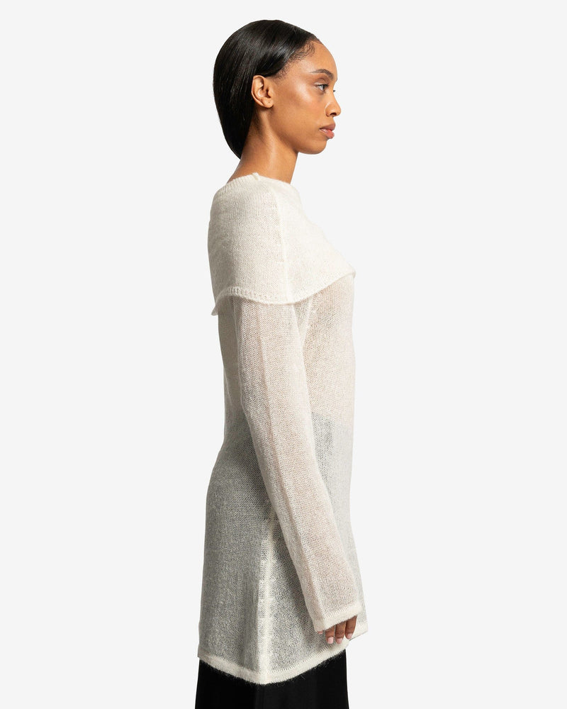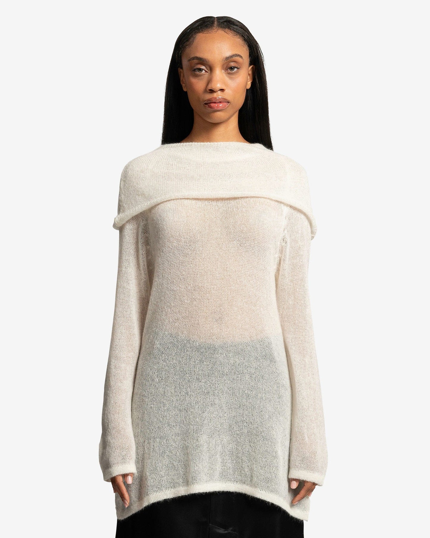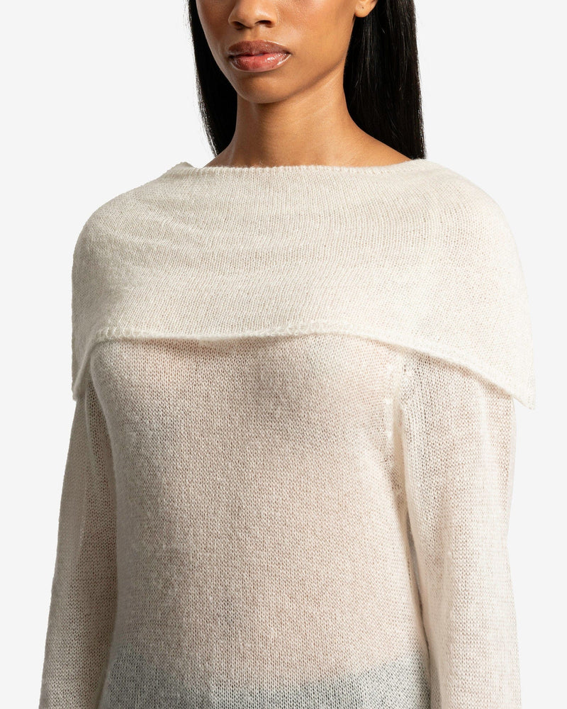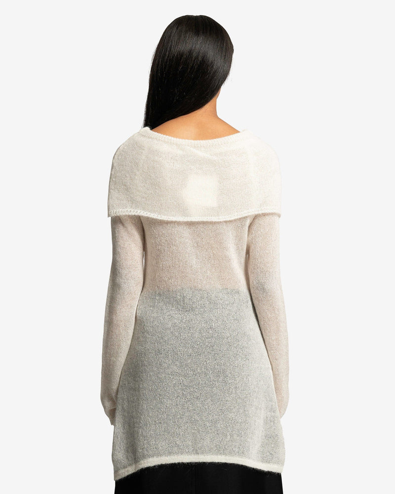 Niccolò Pasqualetti women's fold over sweater in white. This sweater has a layered fold over piece on the shoulders and a semi-sheer finish.