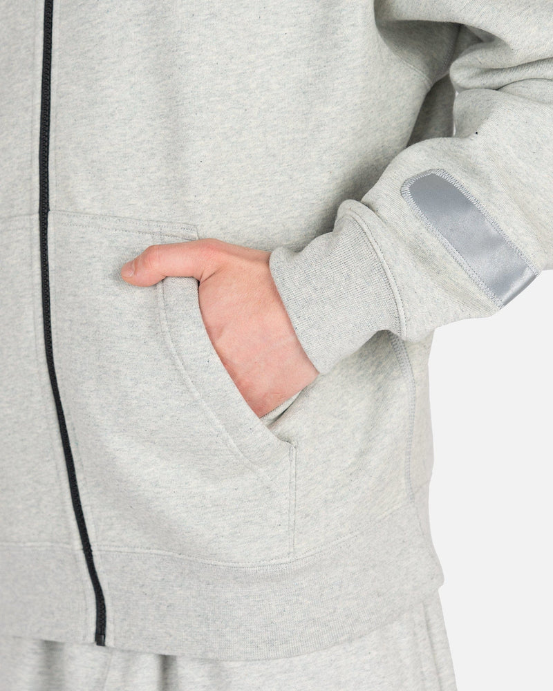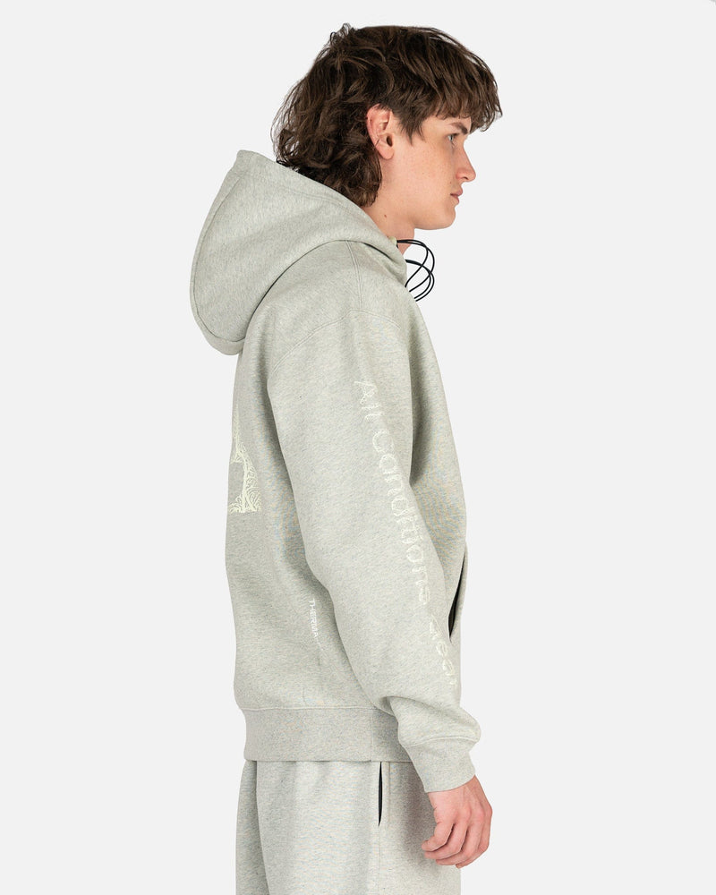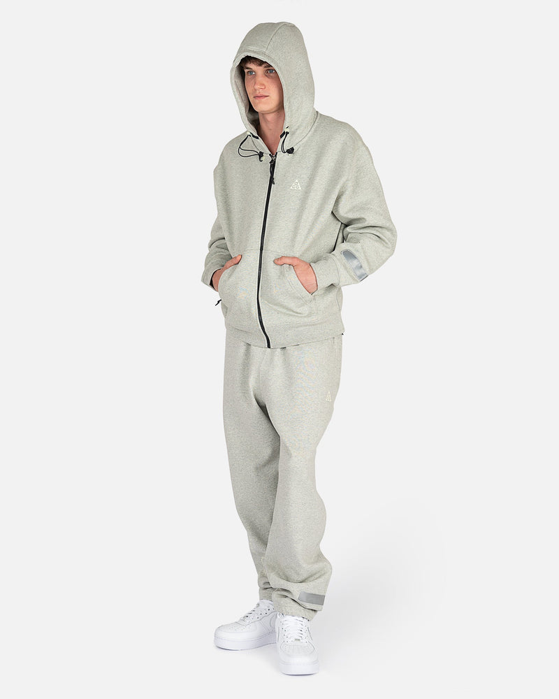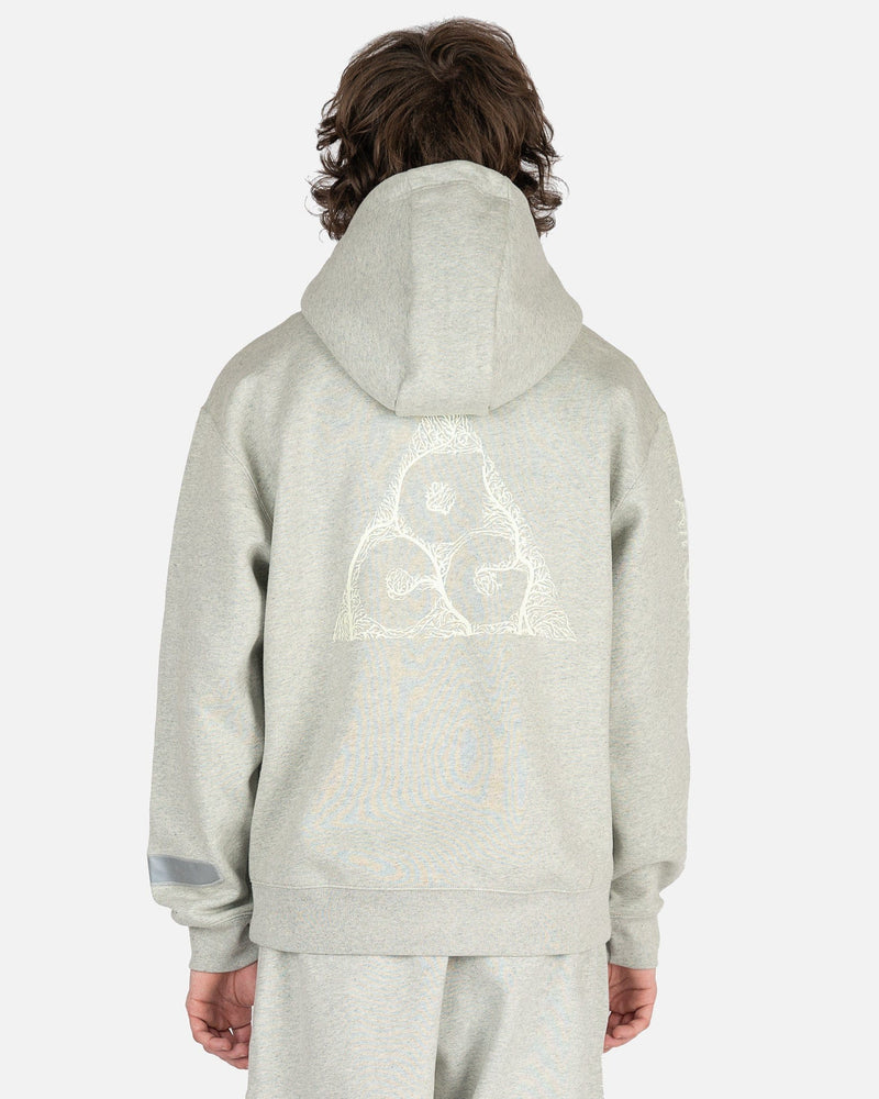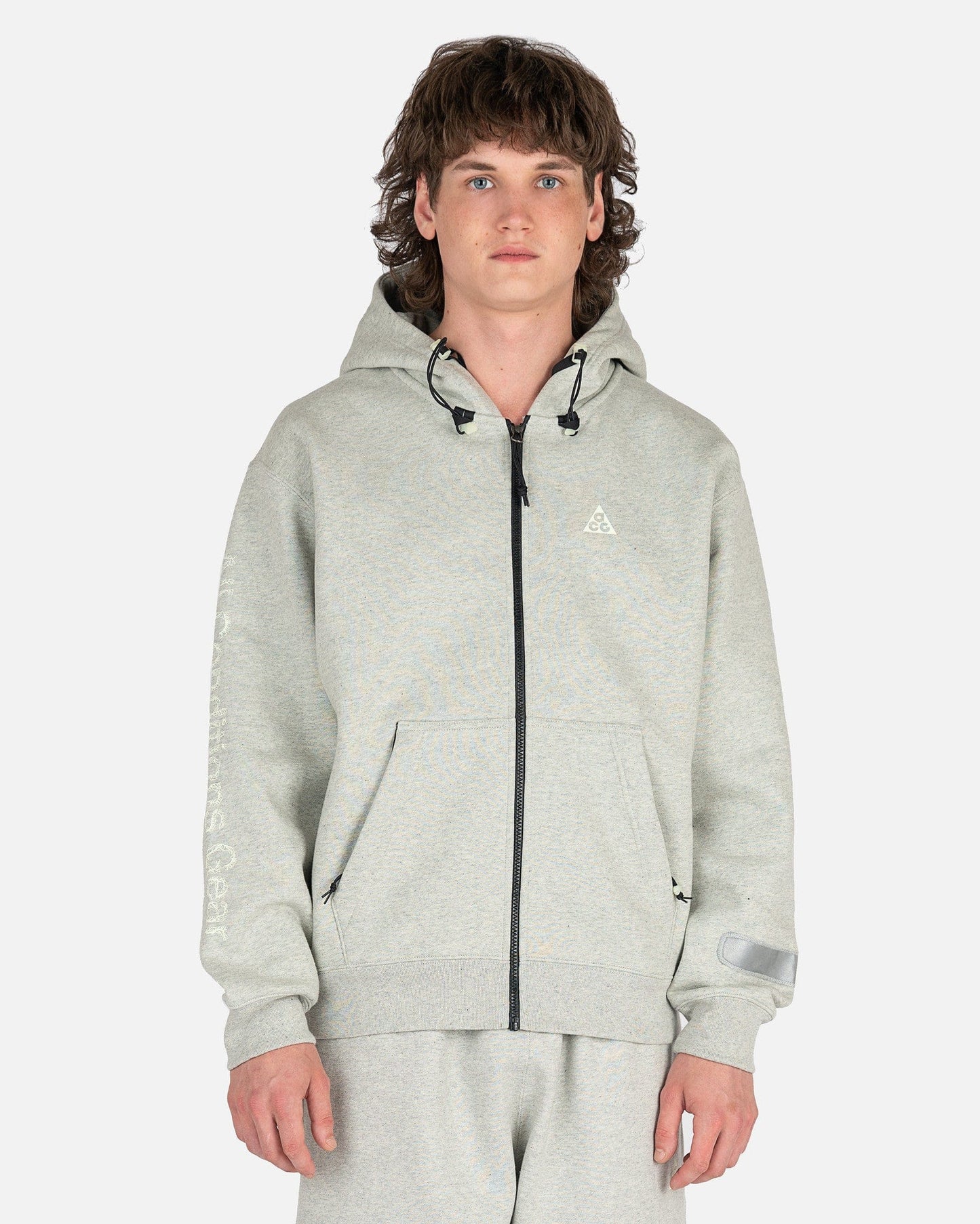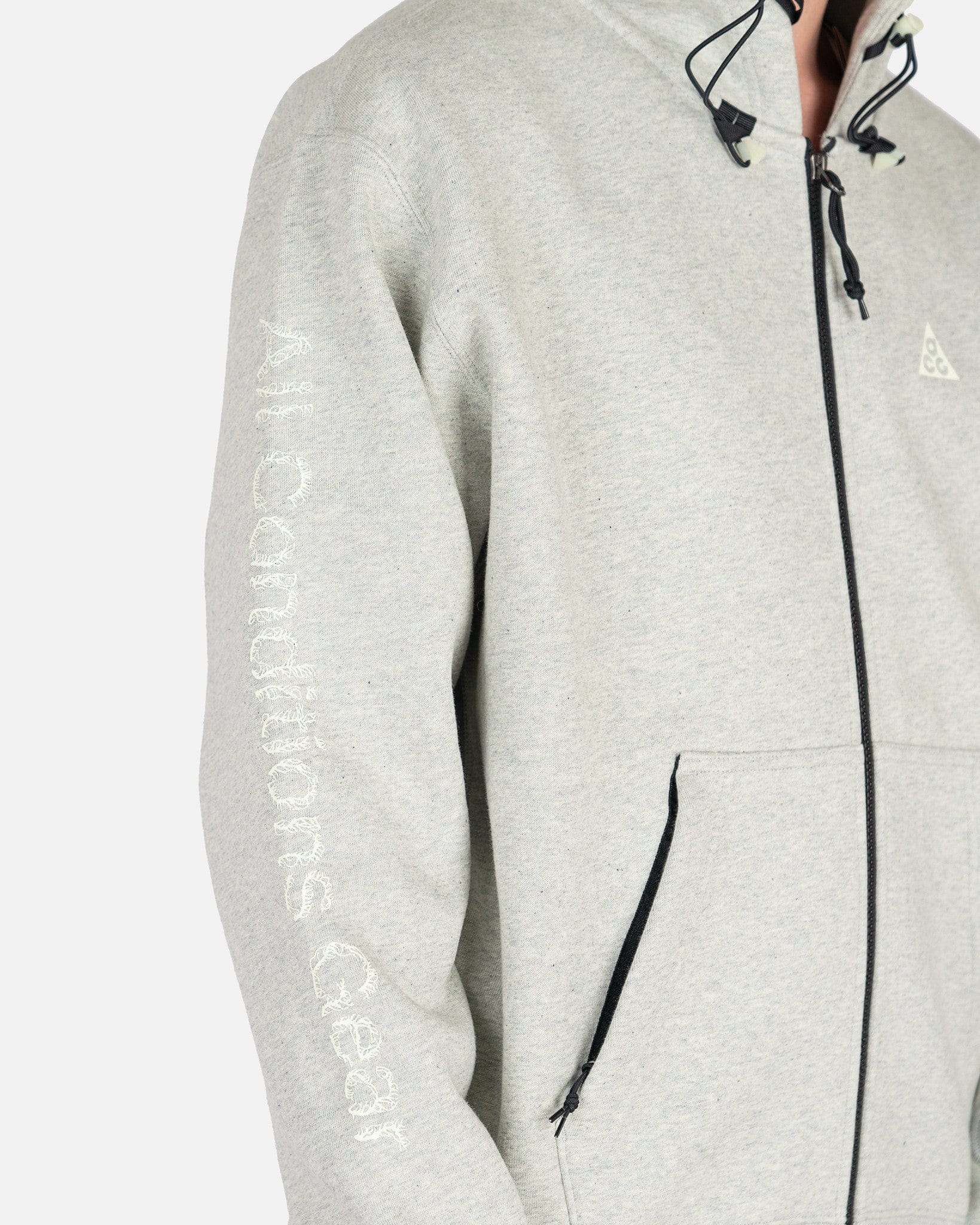 Nike ACG men's zip up fleece hoodie in heather grey. This hoodie features the ACG logo printed on the chest and enlarged on the back. There is printed text on the right sleeve that reads 'All Conditions Gear.' All prints are glow in the dark. Therma-FIT technology regulates your body heat in different temperatures.