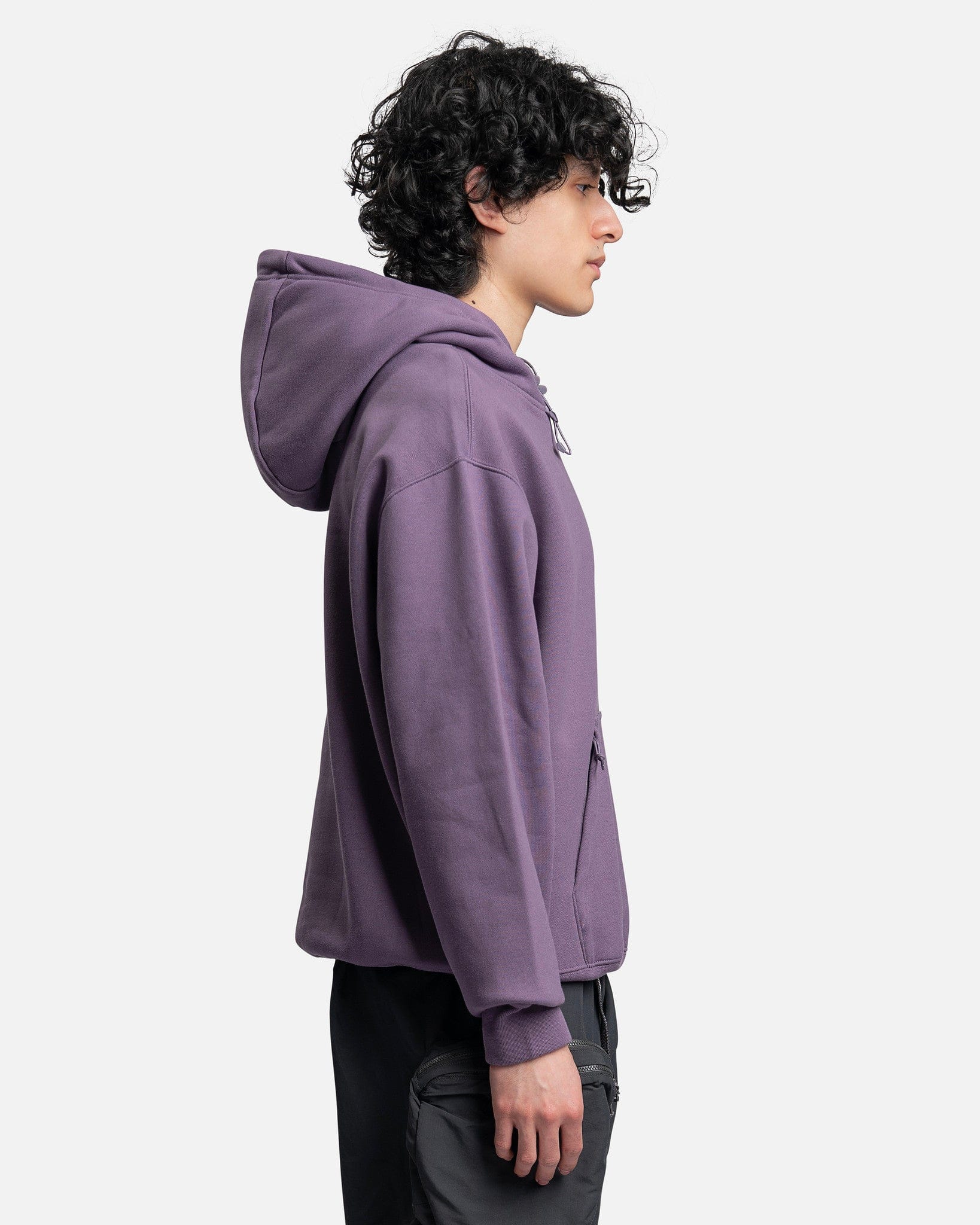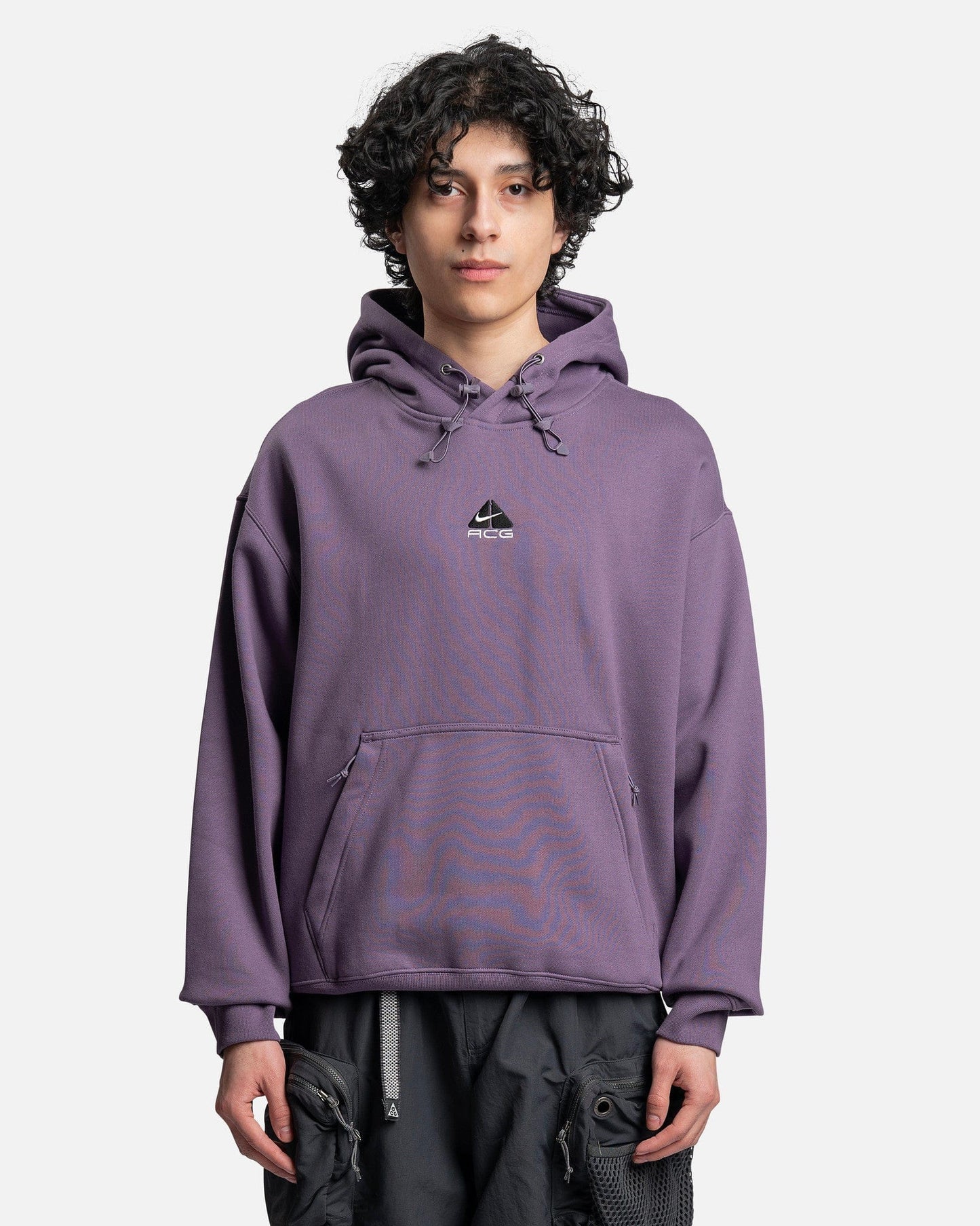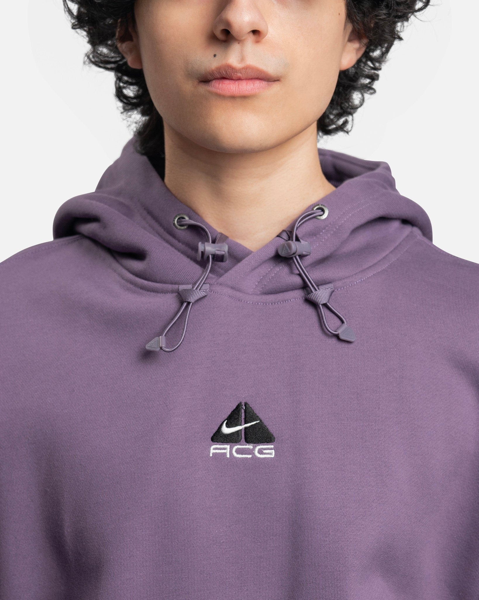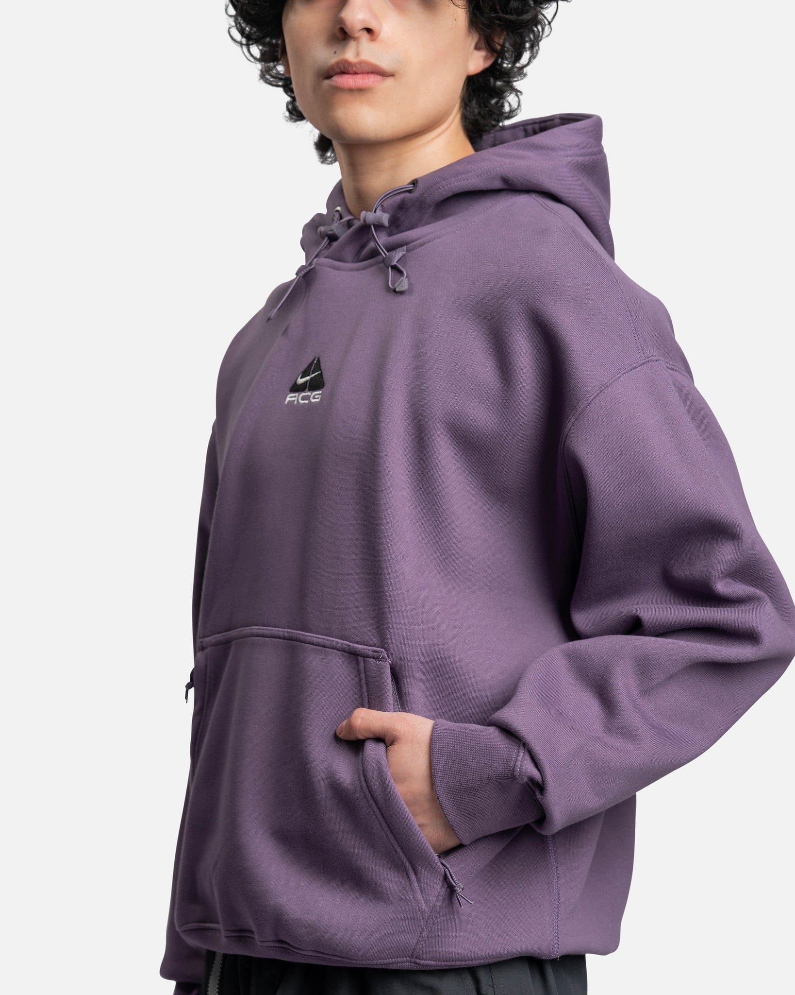 Nike ACG fleece hoodie in purple. This pullover features the Nike ACG logo embroidered on the front center chest. It has a hood with drawstring closure and ribbed cuffs and hem.