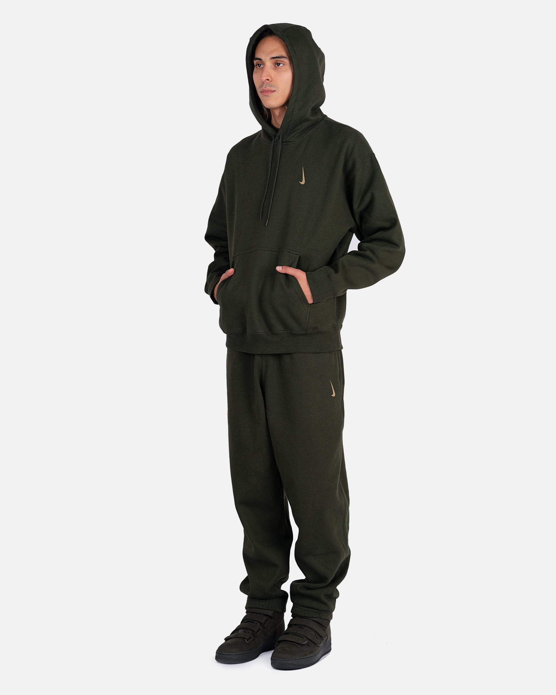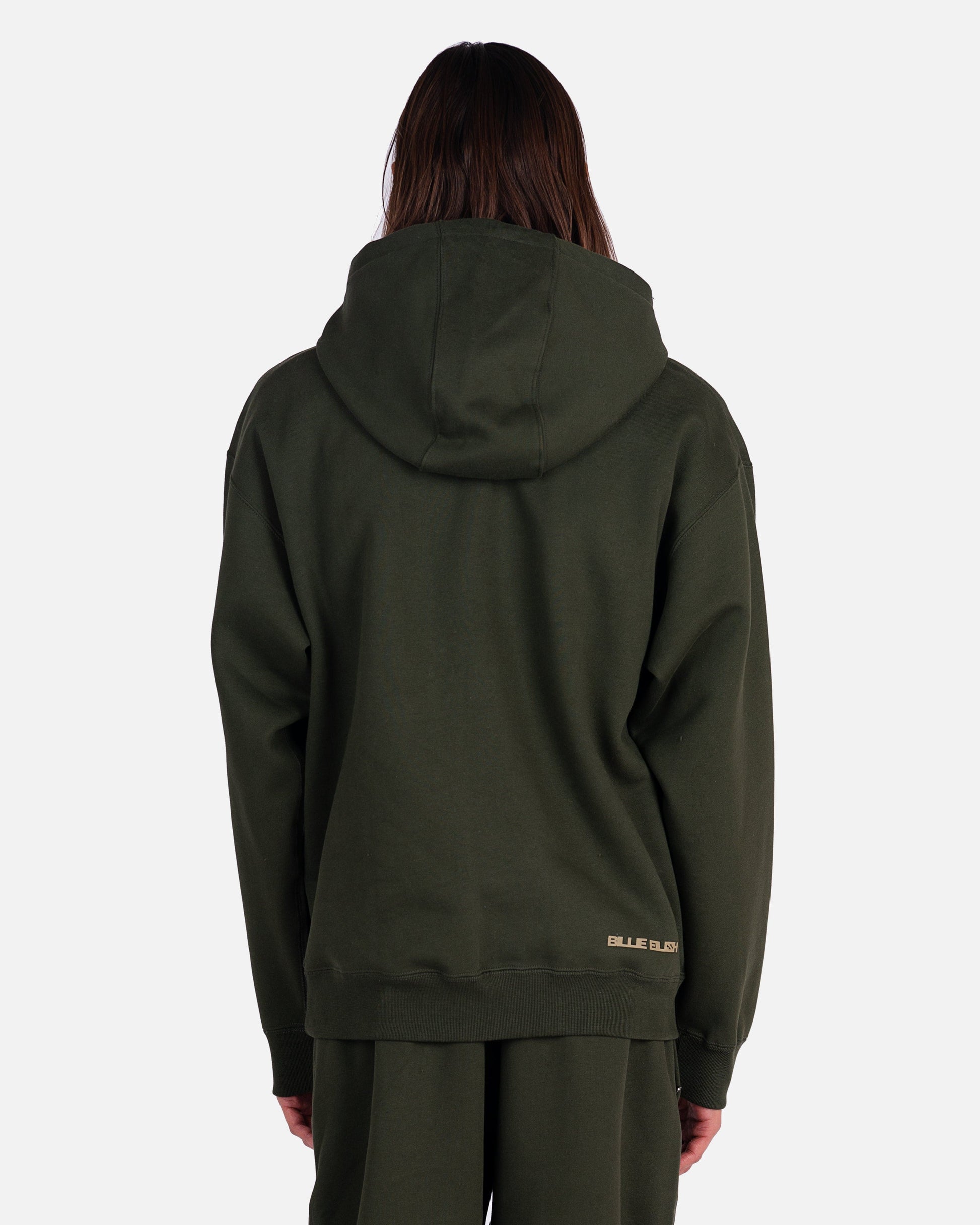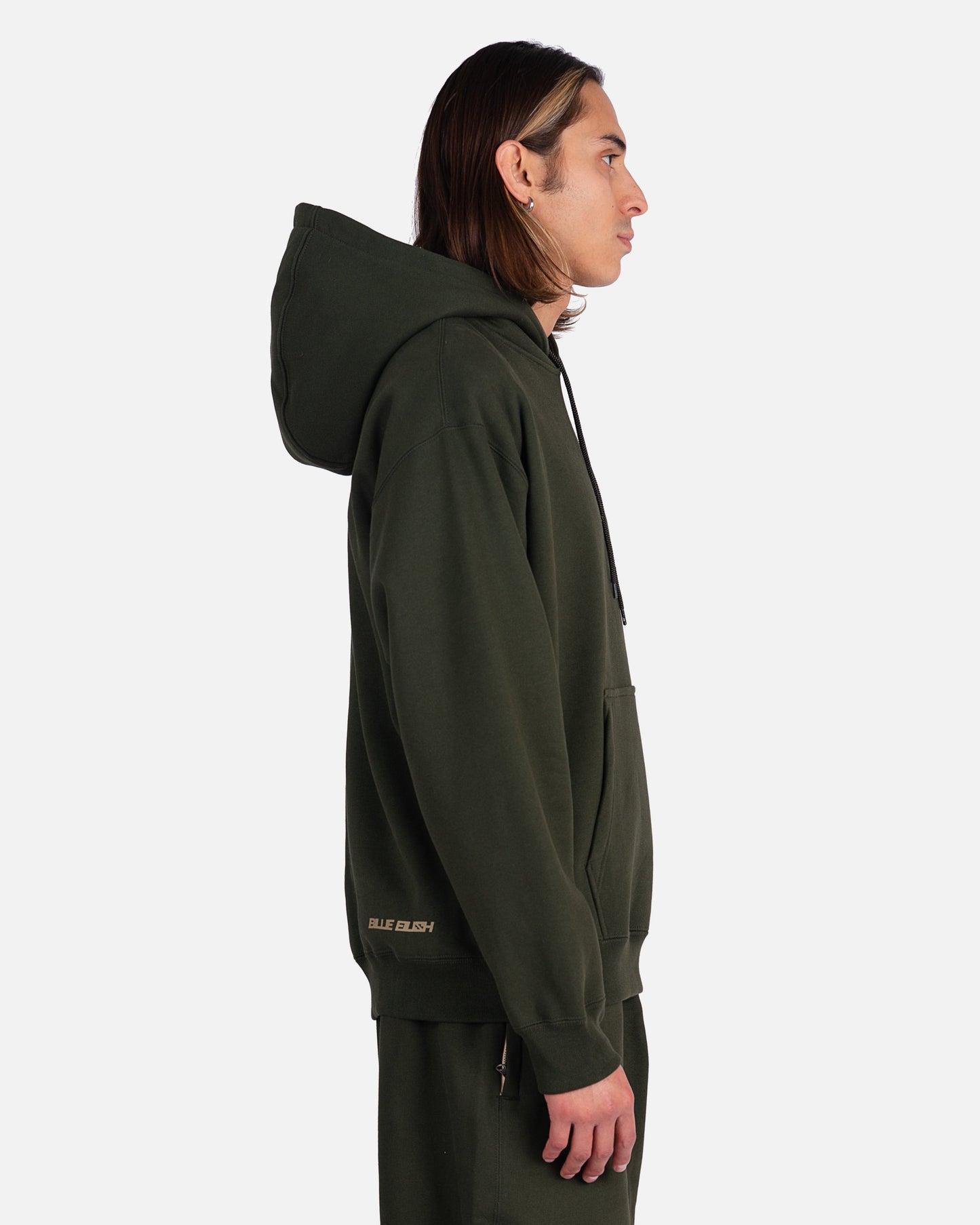 "Billie Eilish" graphics are printed on a Sequoia colored heavyweight cotton brushed-back fabric for soft warmth and a premium feel. A kangaroo pocket doubles as a hand warmer with ample storage.