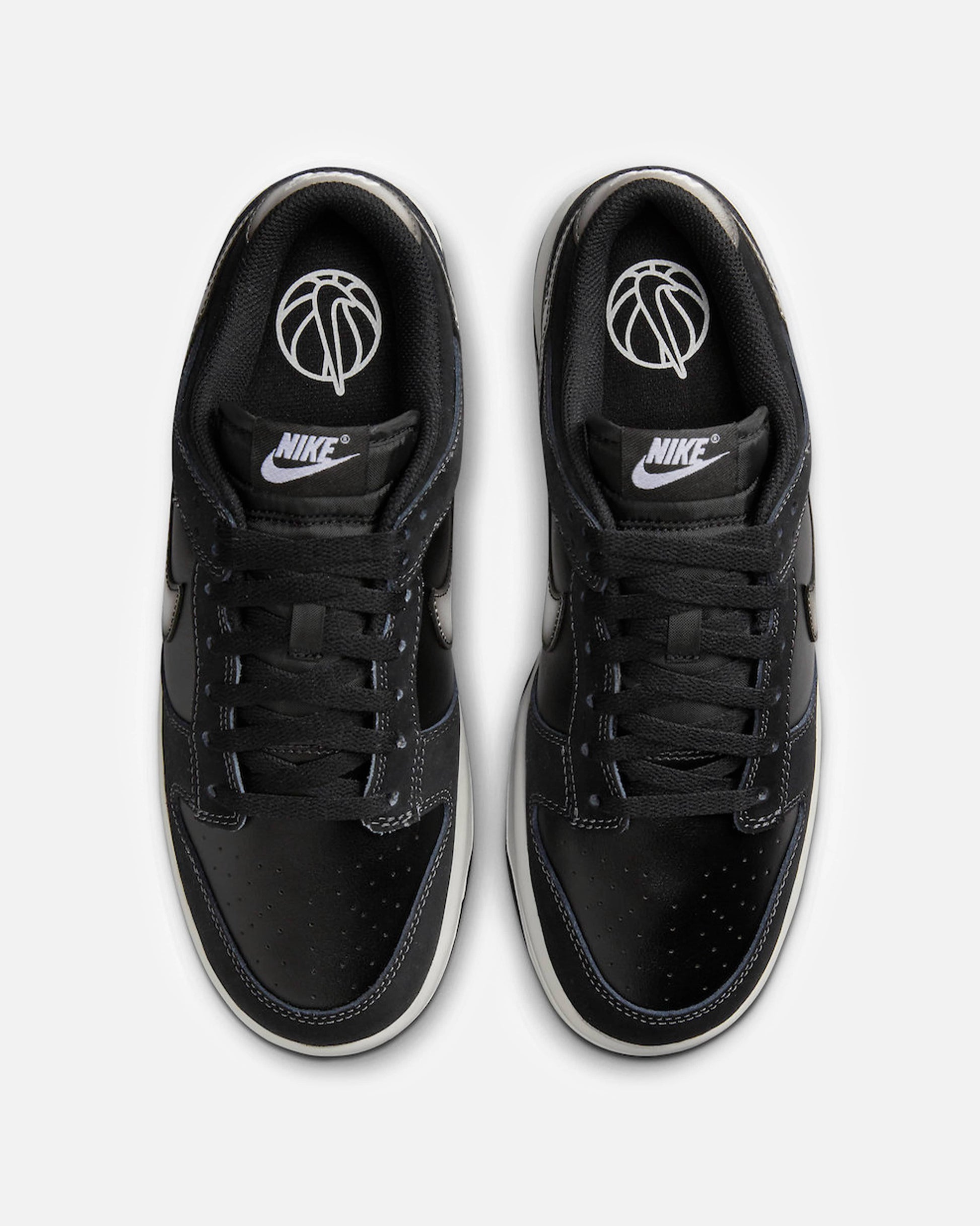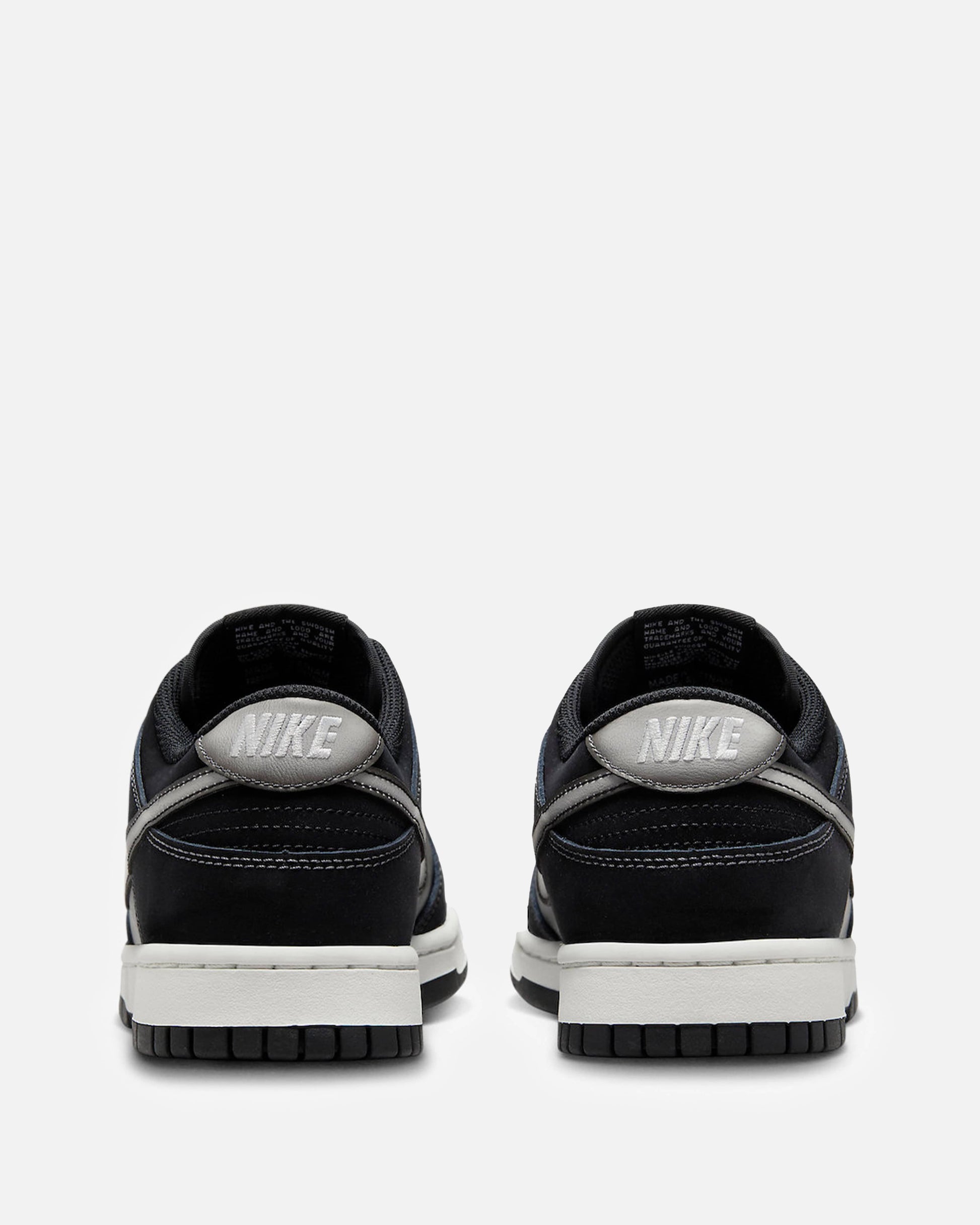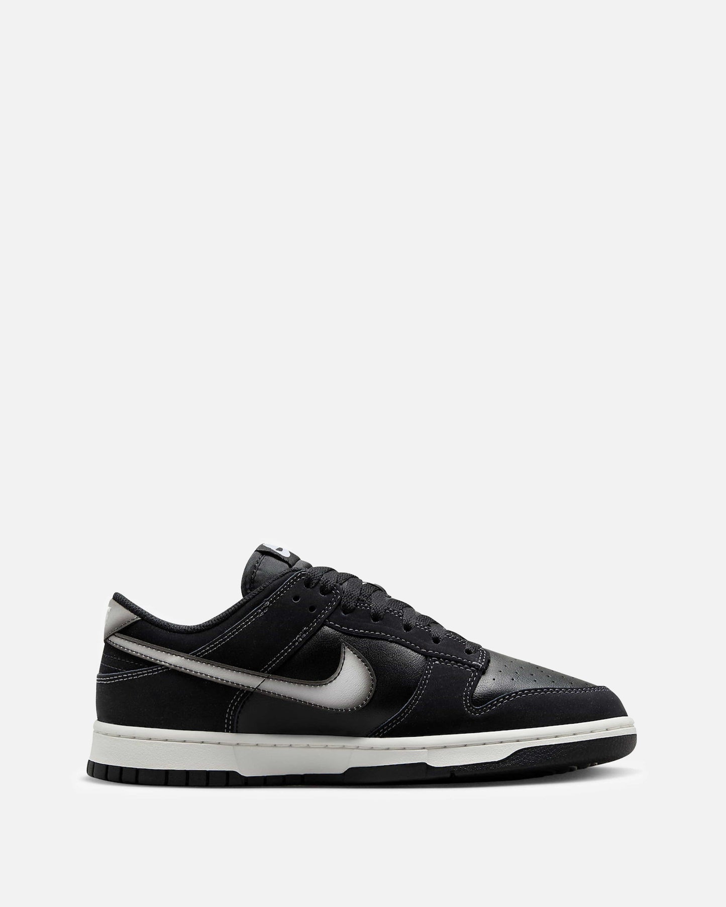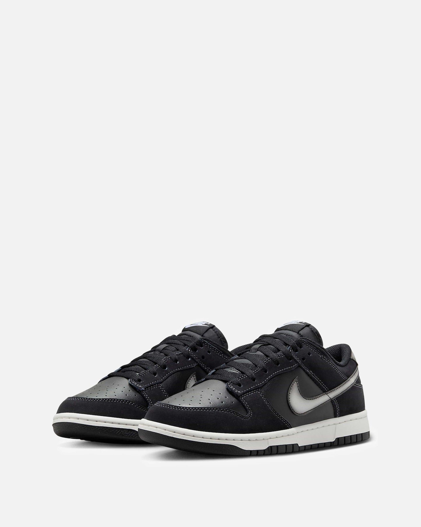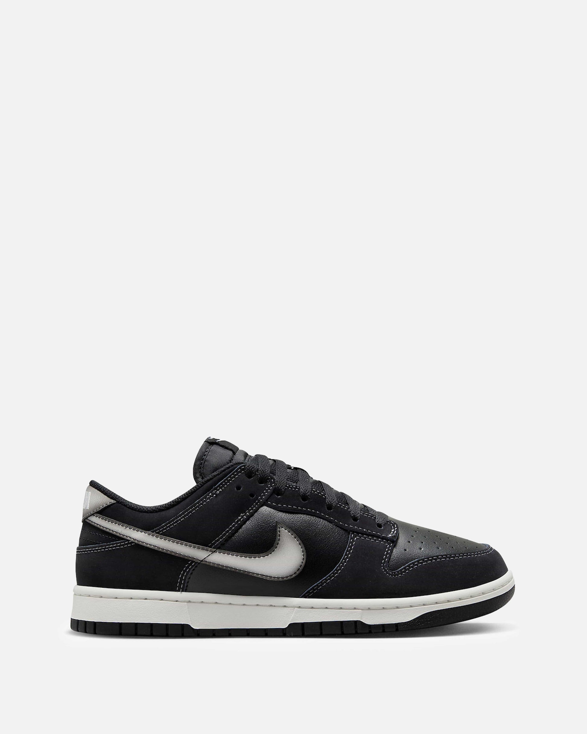 Men's Nike Dunk Low in Black and Anthracite. This low-top sneaker features a leather base with leather overlays on the upper. Airbrushed graphic effects are included on the swooshes. Branding is included on the tongue and heel.