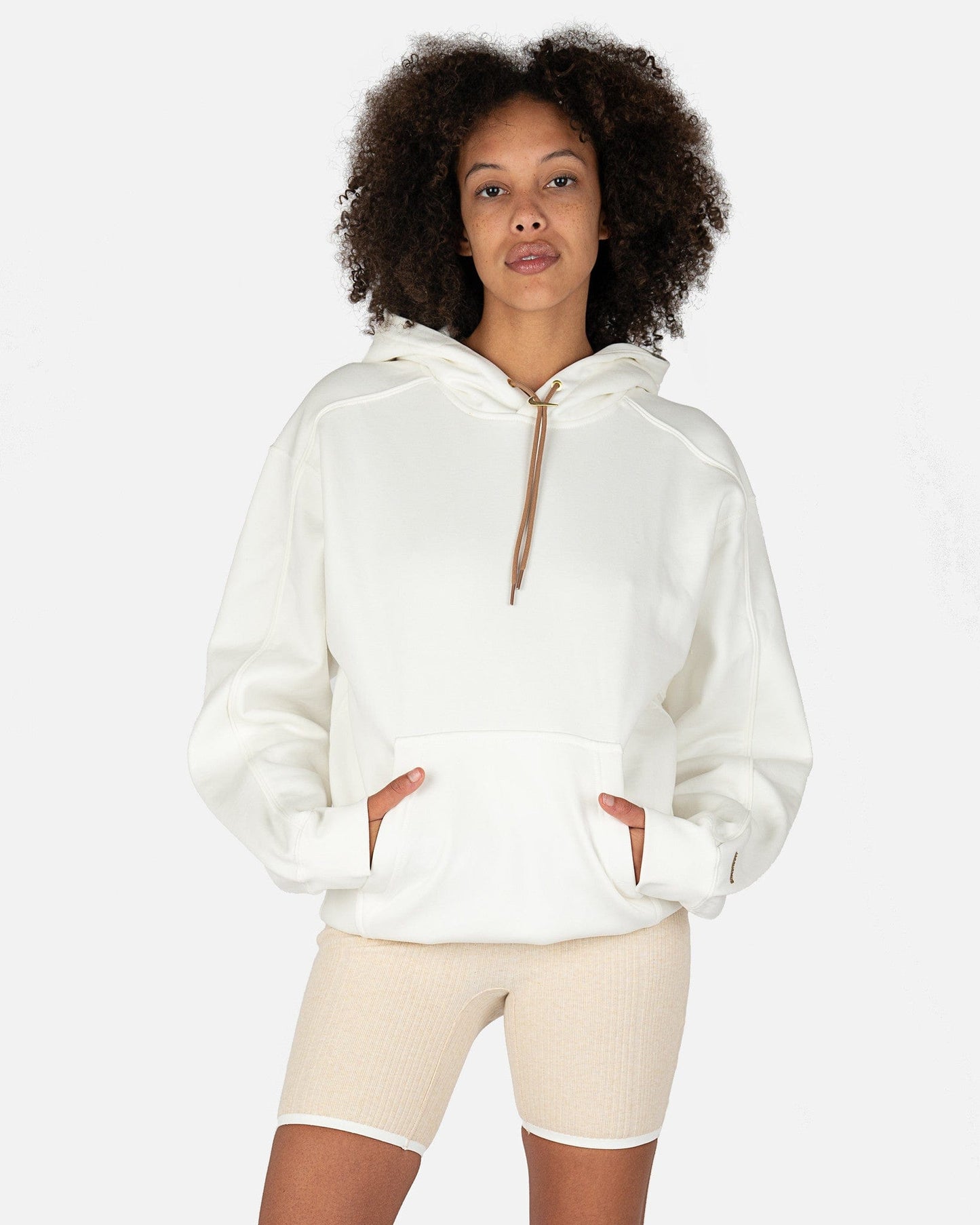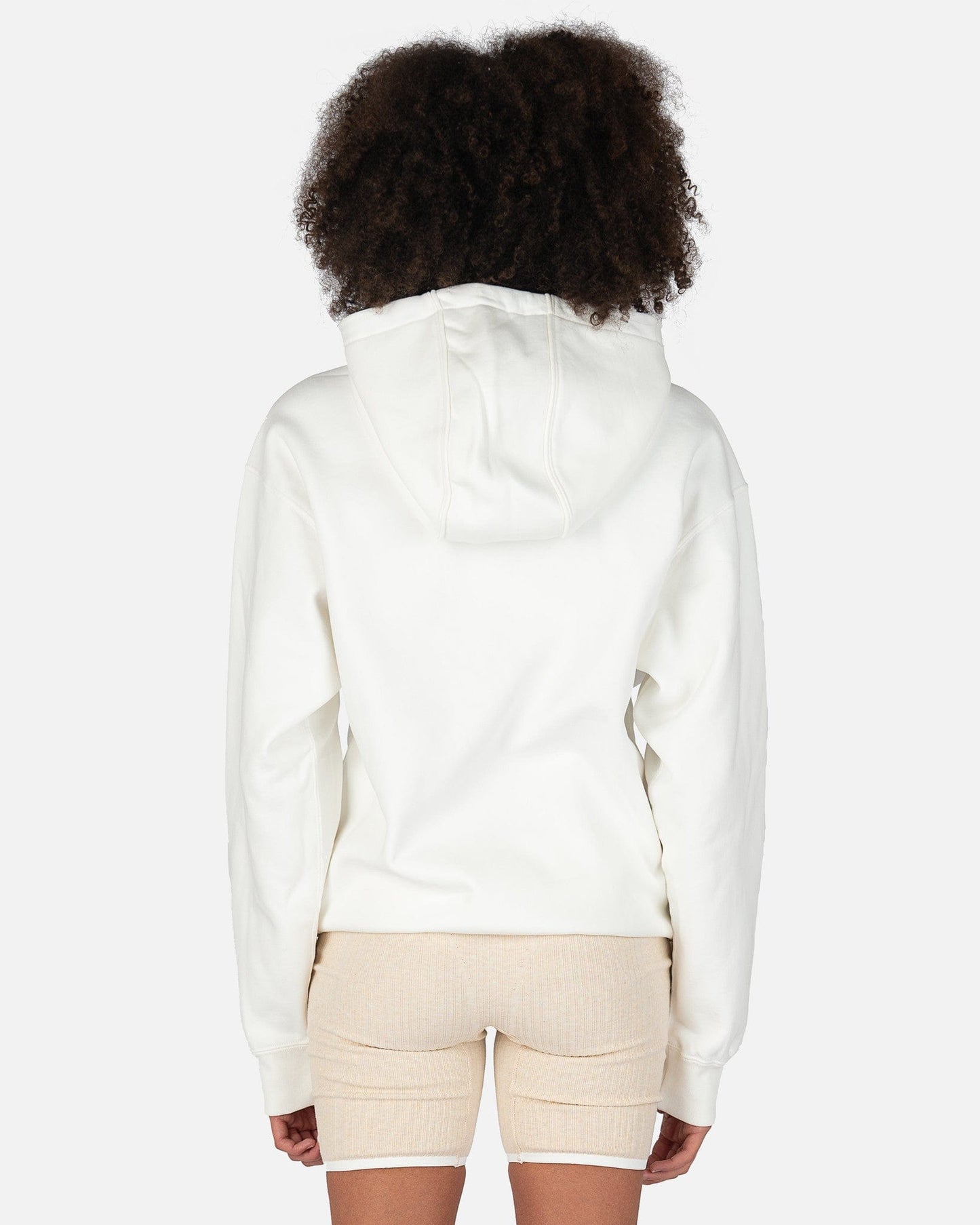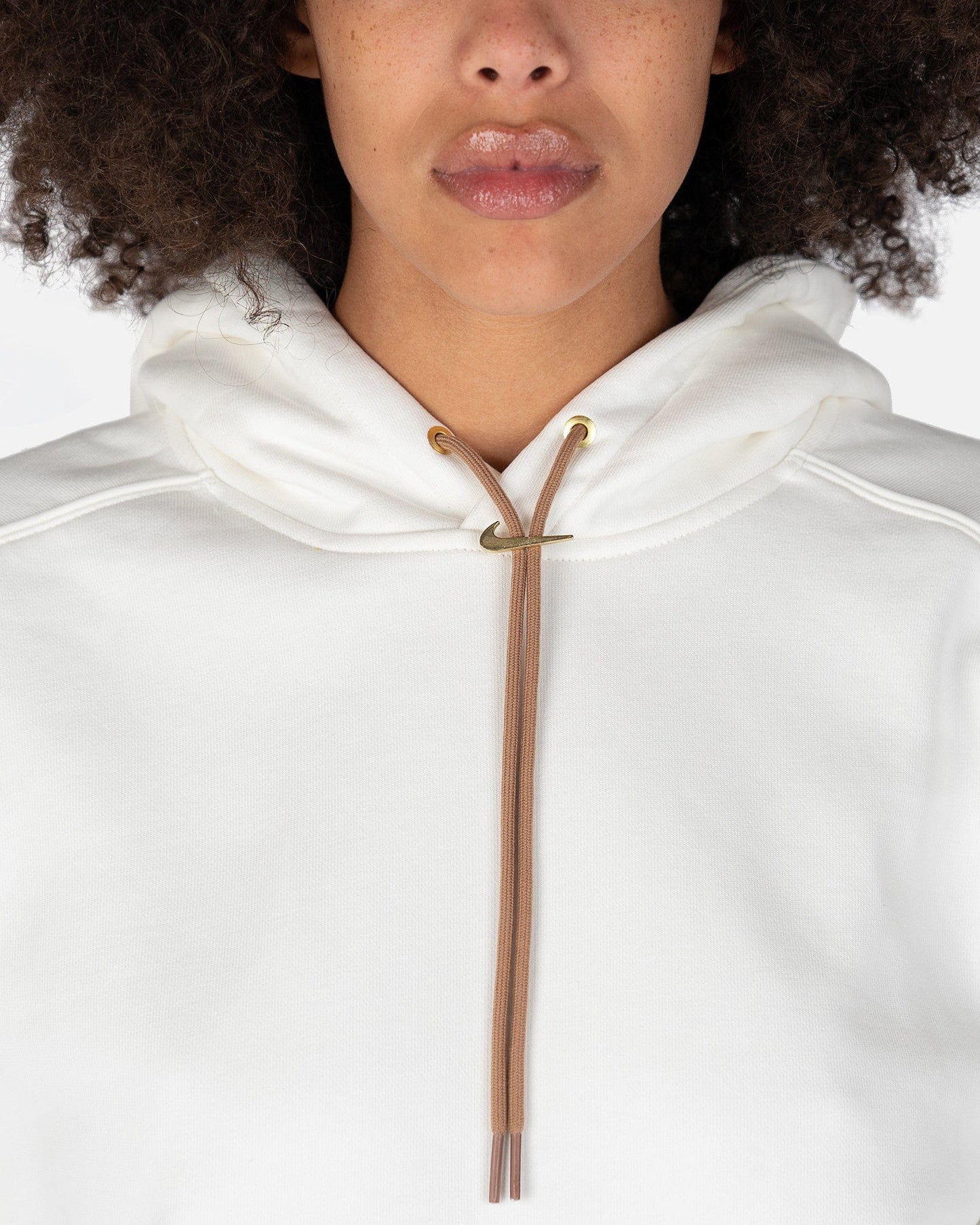 Nike x Jacquemus fleece hoodie in white. This hoodie has drawstring closure with a gold Swoosh pendant. There is a Jacquemus logo above the left cuff.