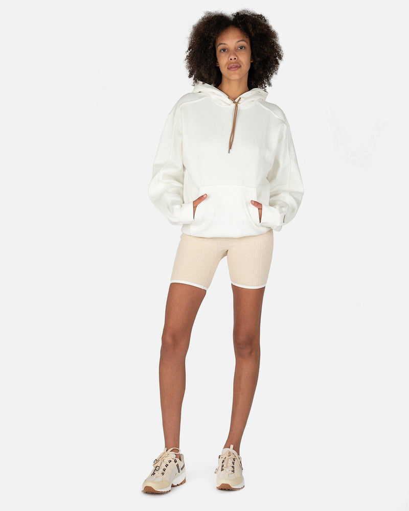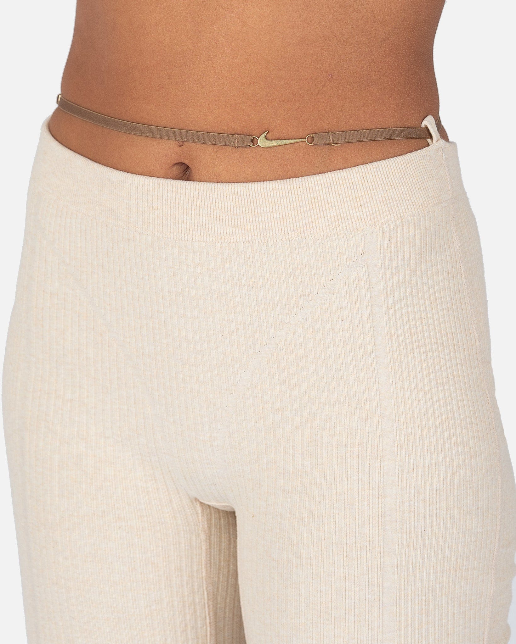 Nike x Jacquemus fitted biker shorts in creme and white. These shorts are soft and stretchy. The knit fabric gets refreshed with ribbed detailing. There is a brown waistband string with a gold Nike Swoosh pendant above the shorts' waistline.