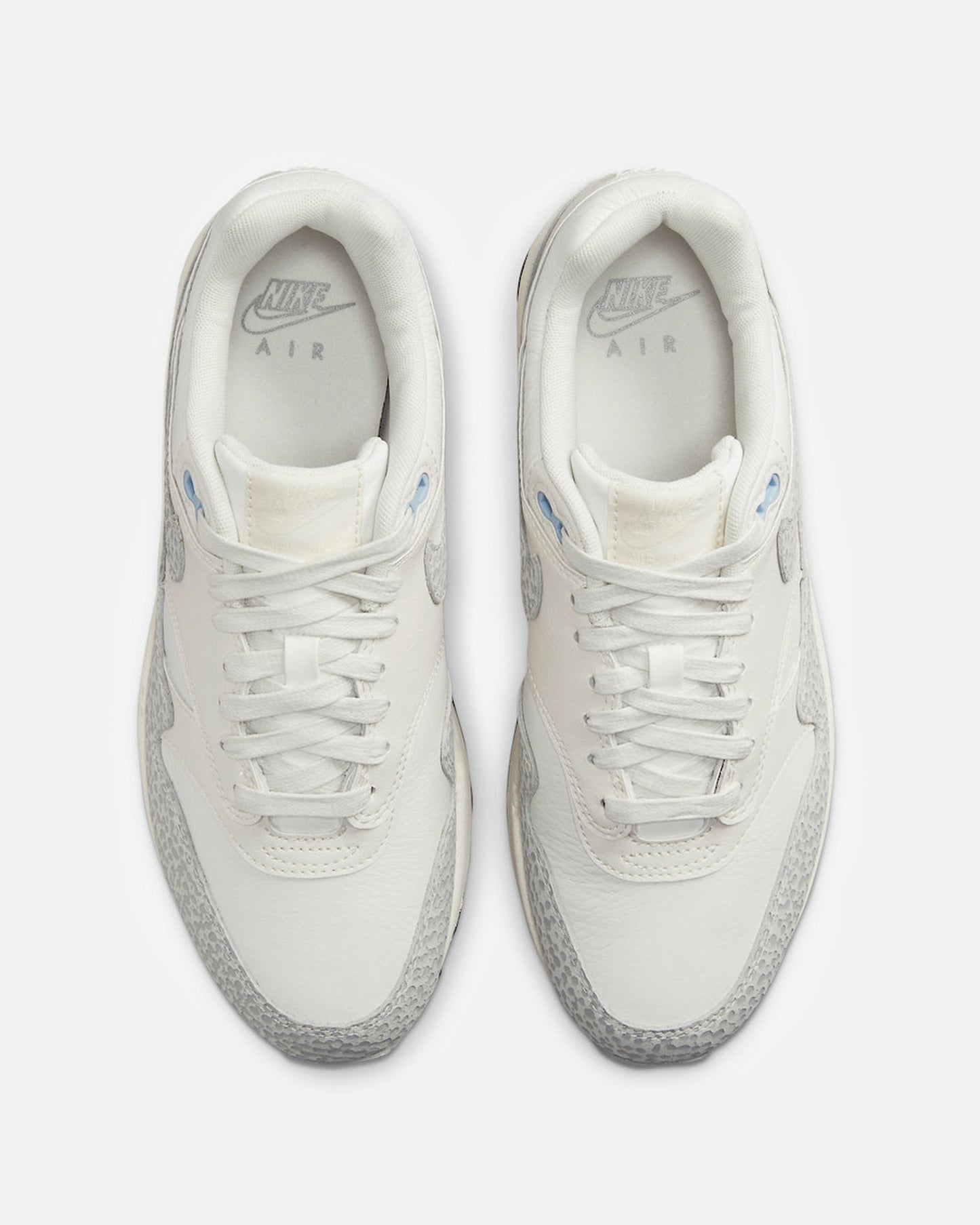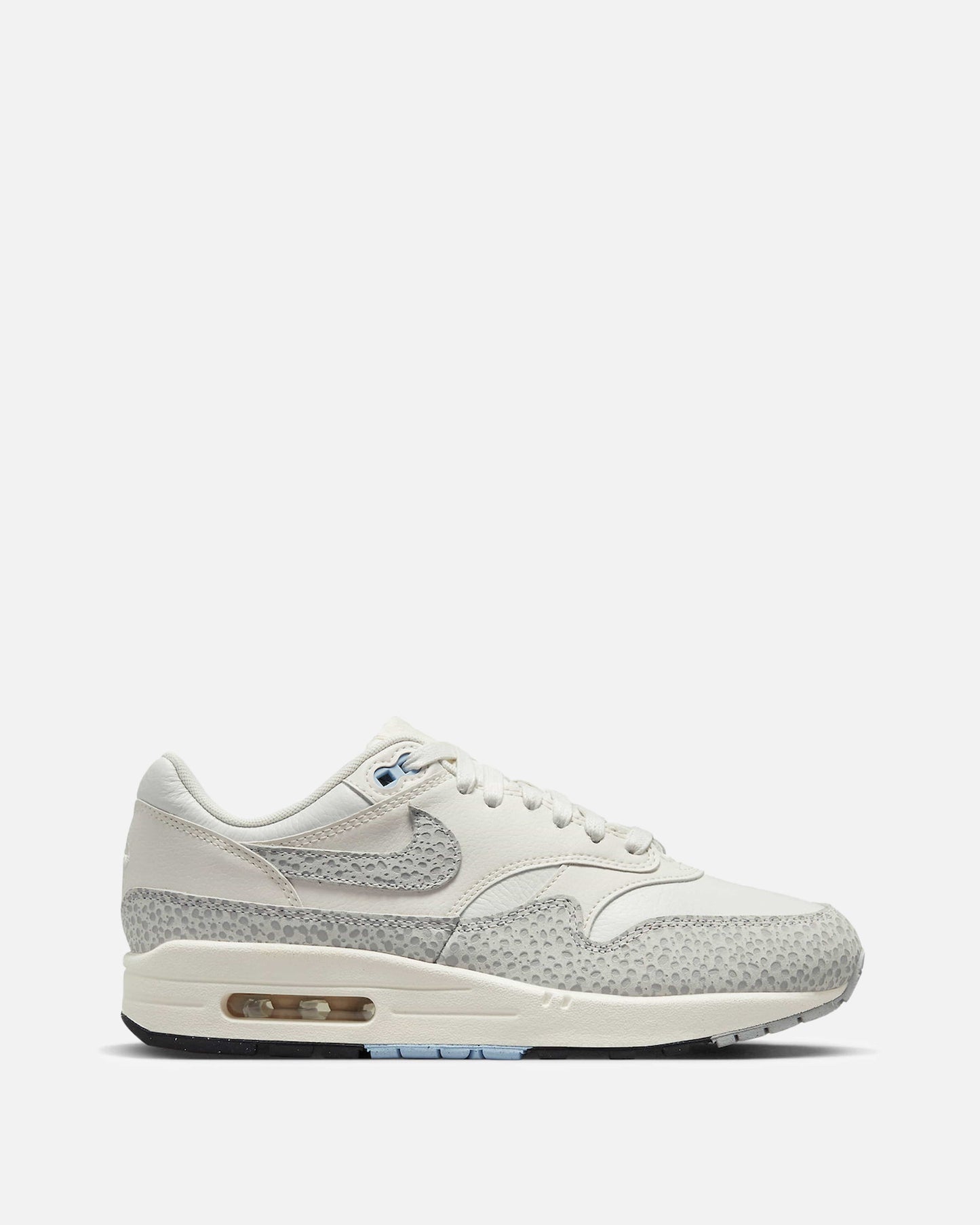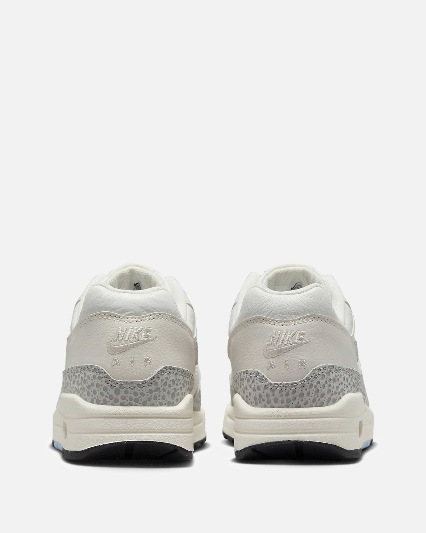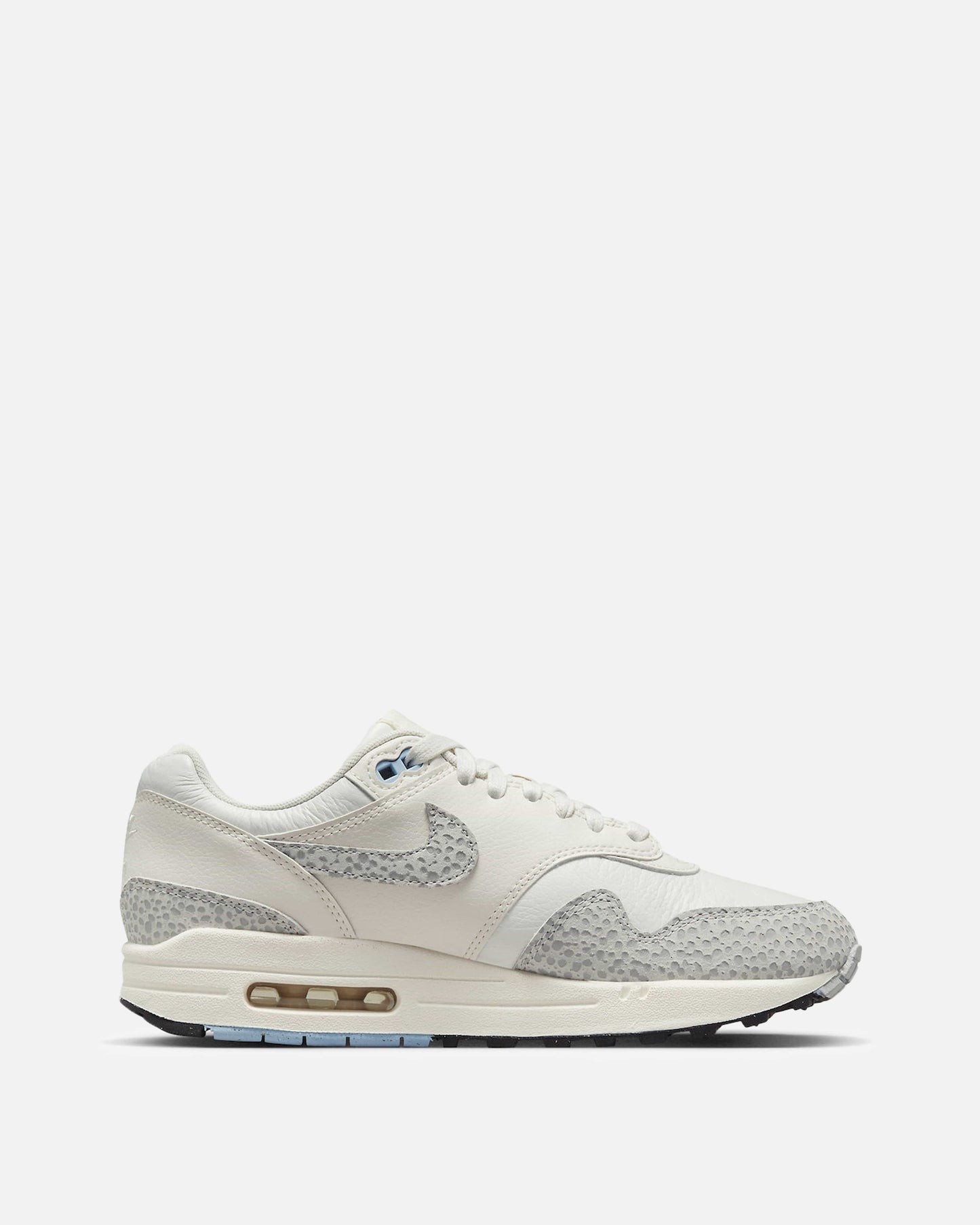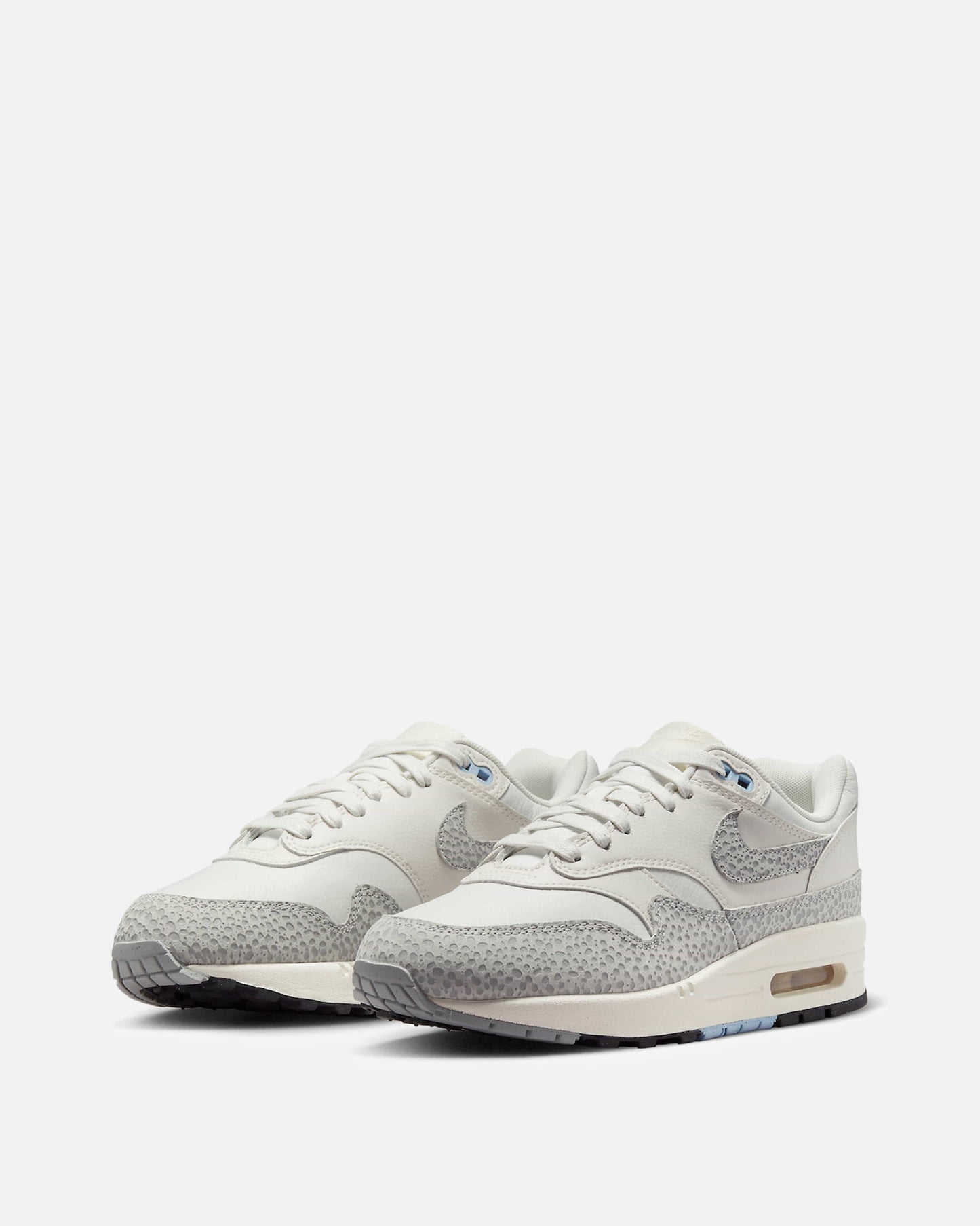 Women's Air max 1 '87 in Summit White. The Tinker Hatfield designed sneaker returns with a Summit White leather and mesh upper accented by safari prints on the swoosh and mudguard.
