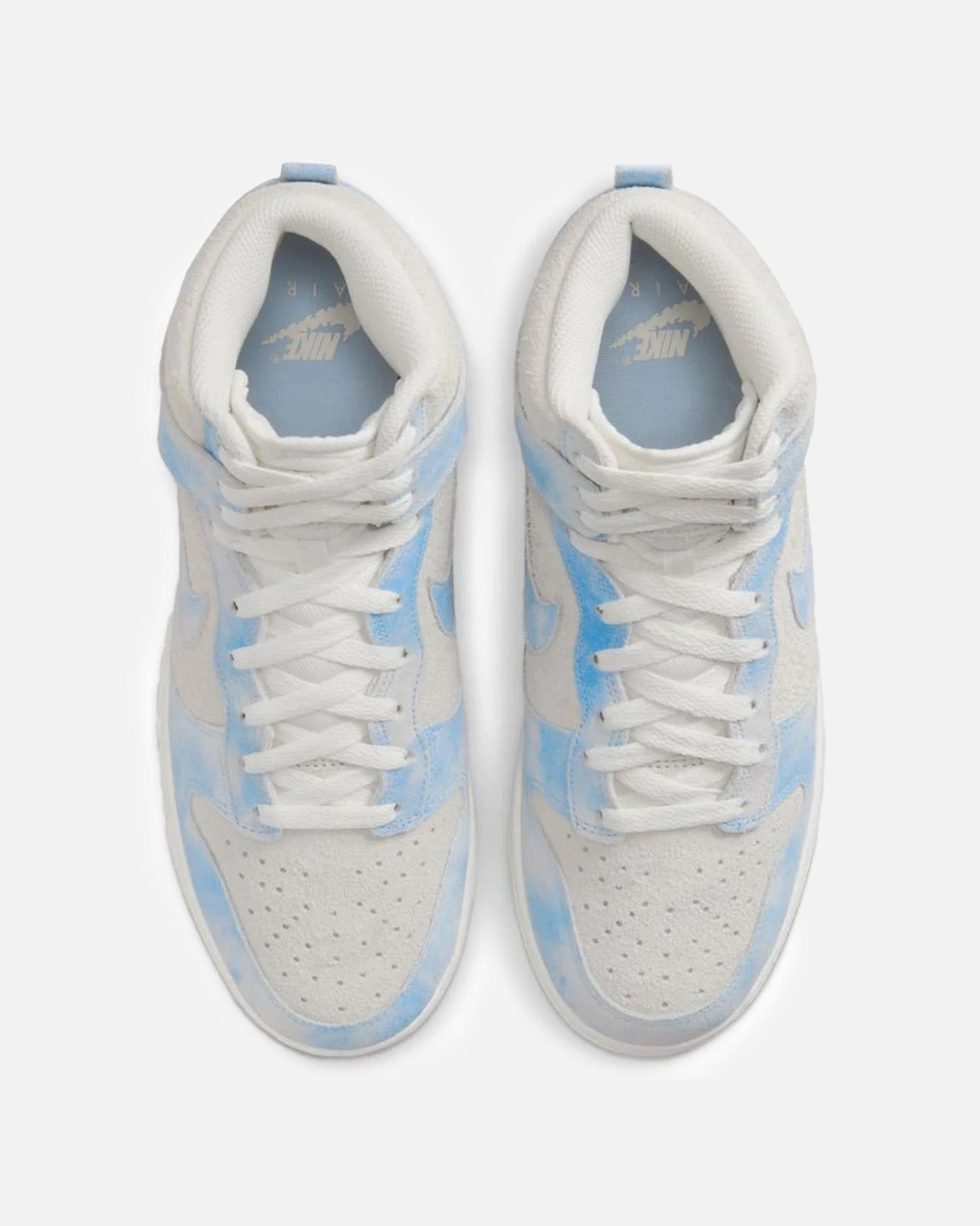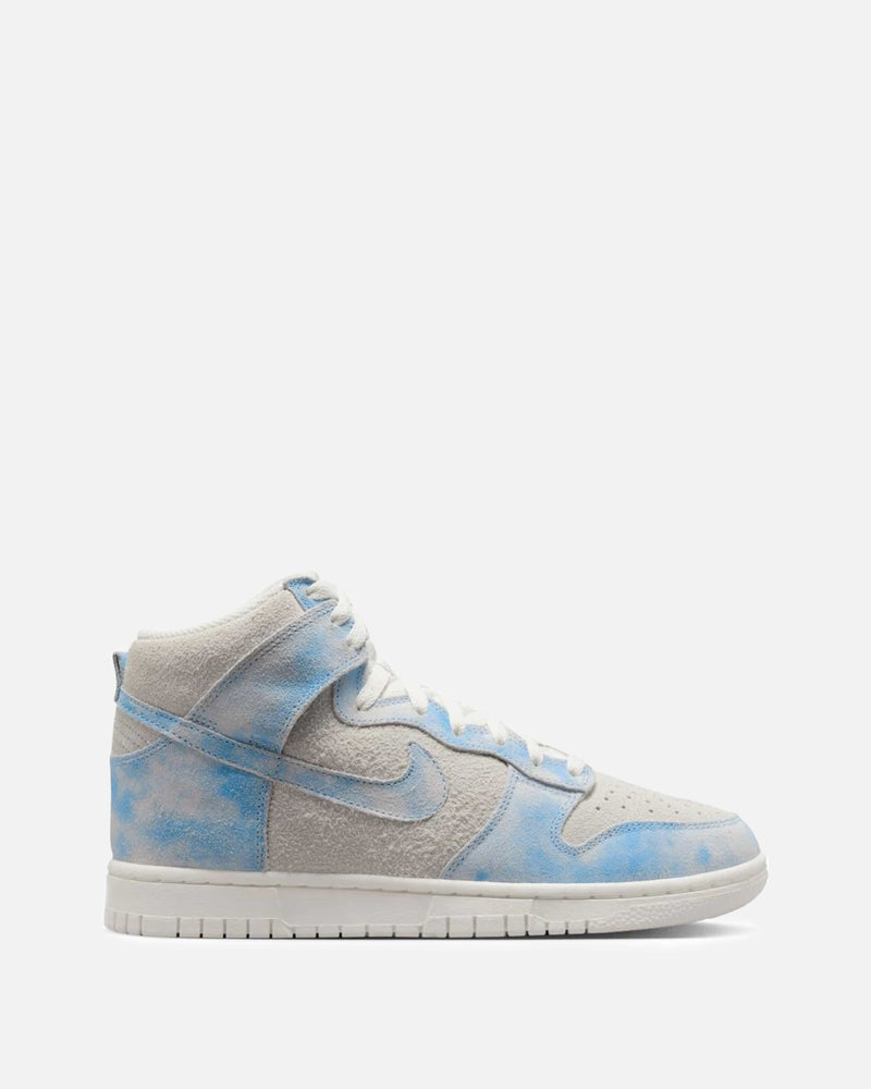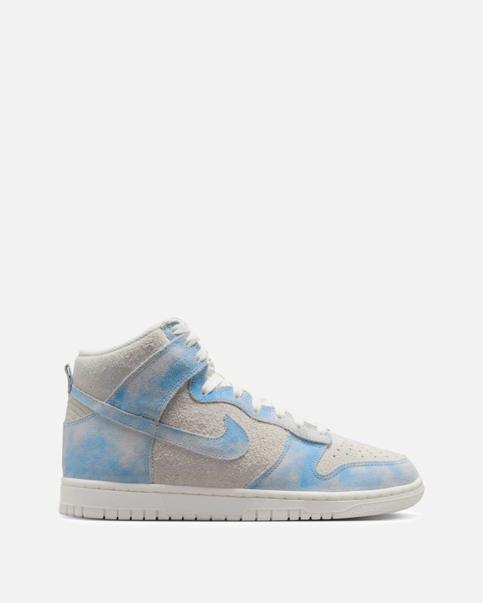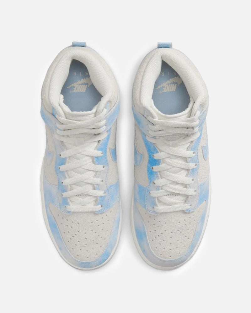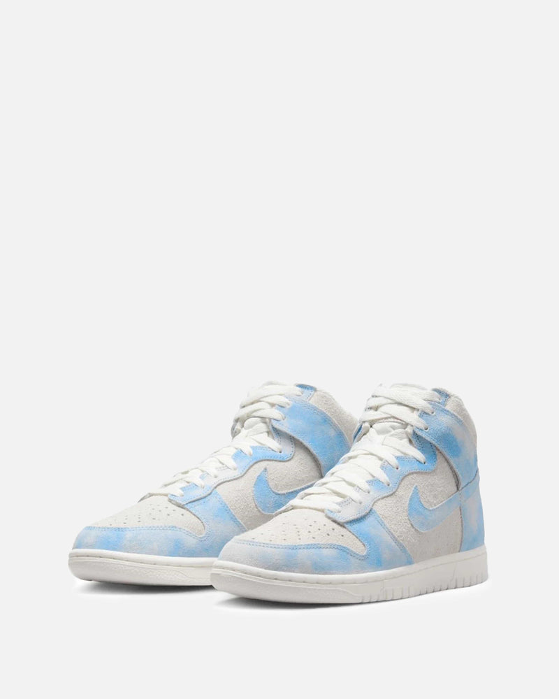 Women's Nike Dunk High Special Edition in Celestine Blue. Using textile to create an illusion, this sneaker features an all suede paneled upper with a mesh tongue, perforated toe box and rubber midsole. The worn effect across the celestine blue panels give this sneakers the appearance of clouds forming in the sky.