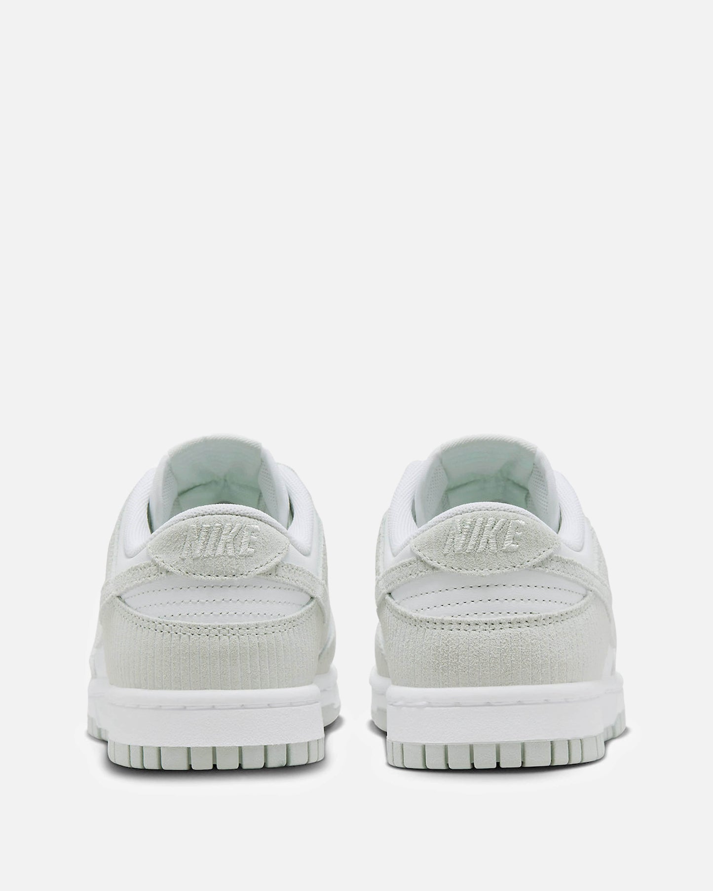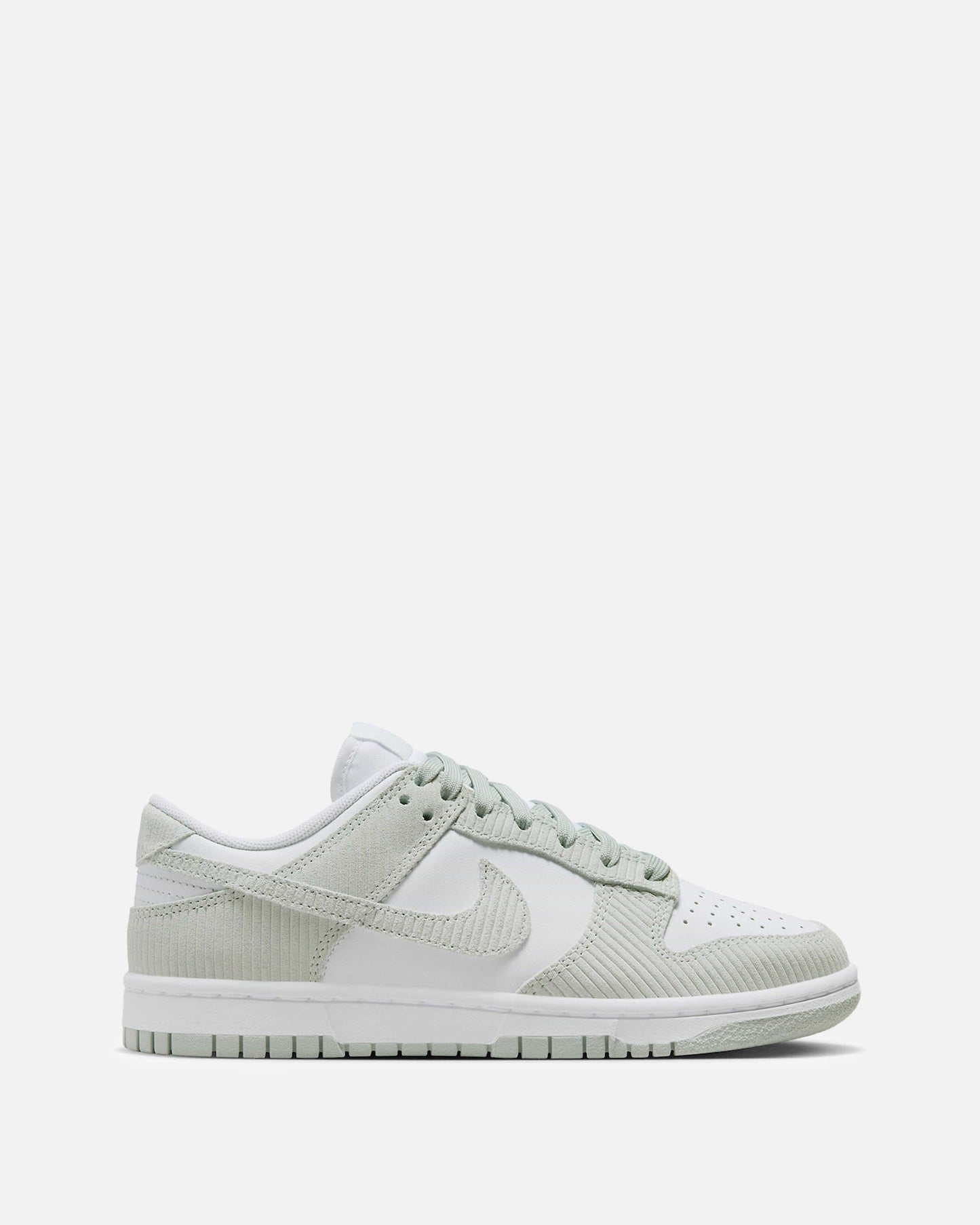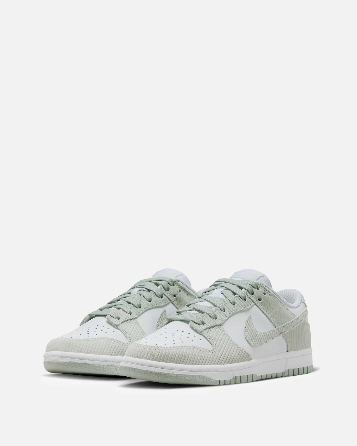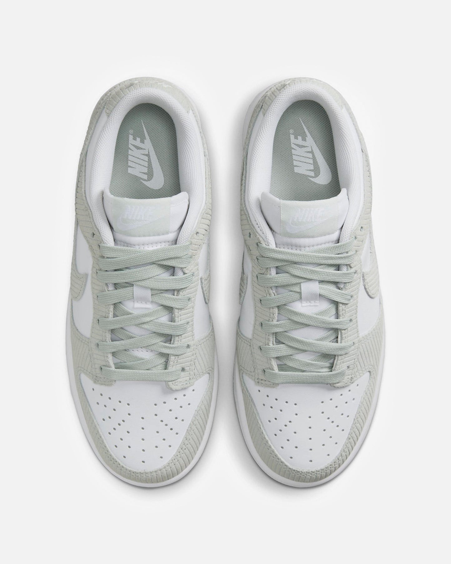 Women's Nike Dunk Low in White and Light Silver. This low-top sneaker features a leather base with corduroy overlays on the upper. Branding is included on the tongue and heel.