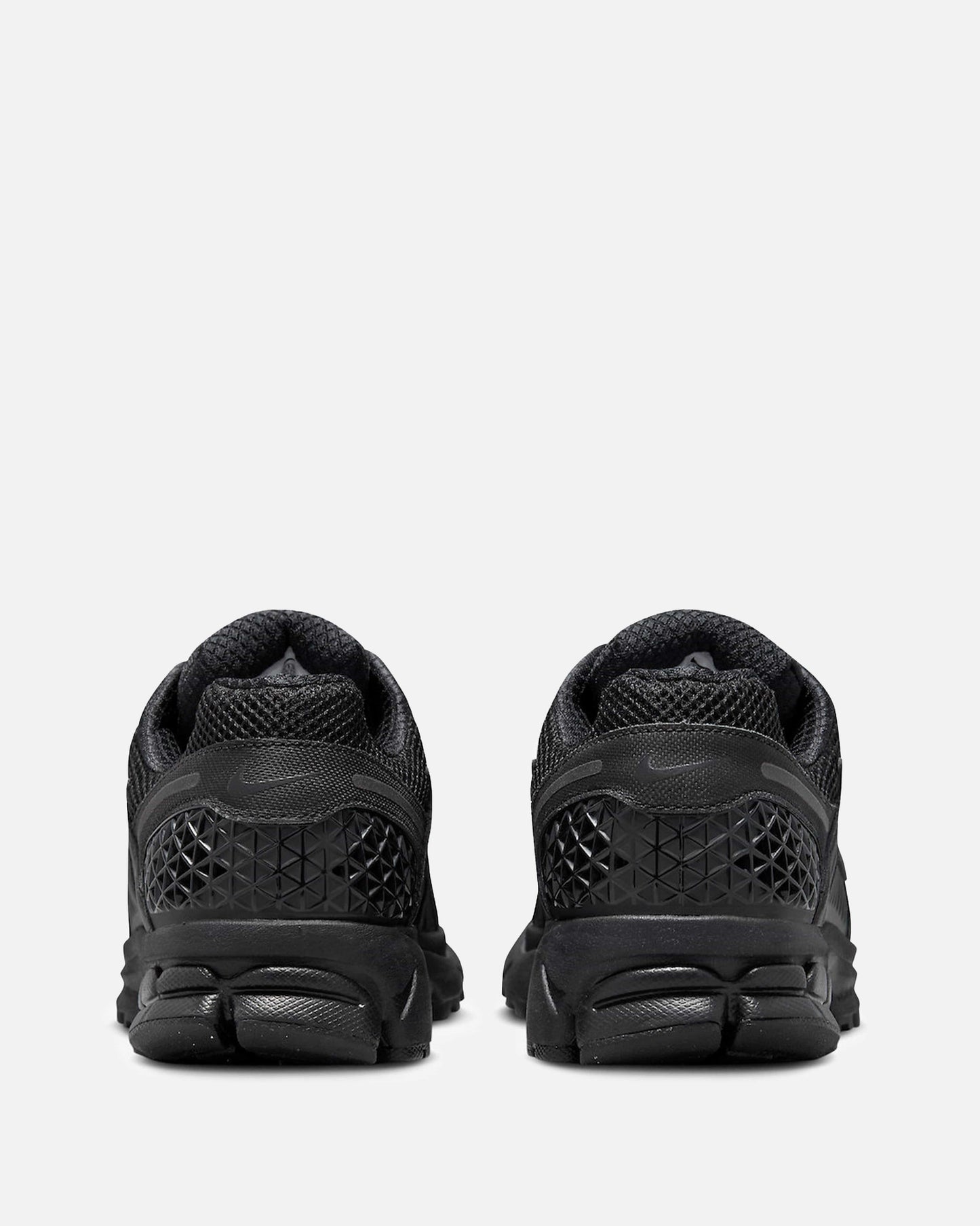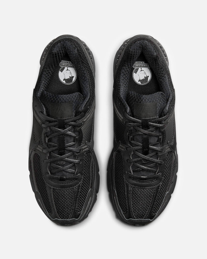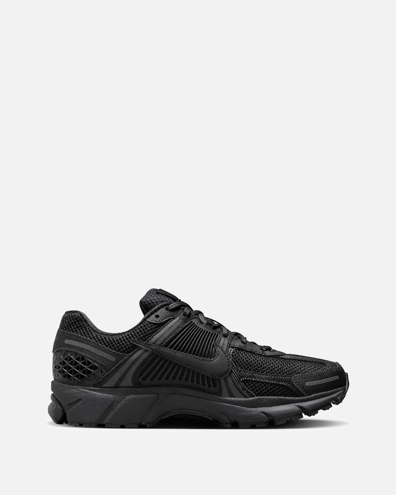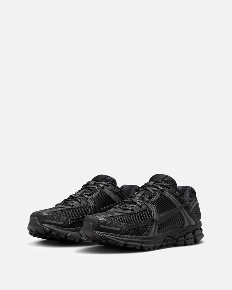 Men's Nike Zoom Vomero 5 in Black and Black. This low-top sneaker features a mesh base with leather overlays on the upper, a synthetic TPU cage on the side panels and heel. A jacquard nylon logo patch is stitched on the tongue with additional branding embroidered on the heel.