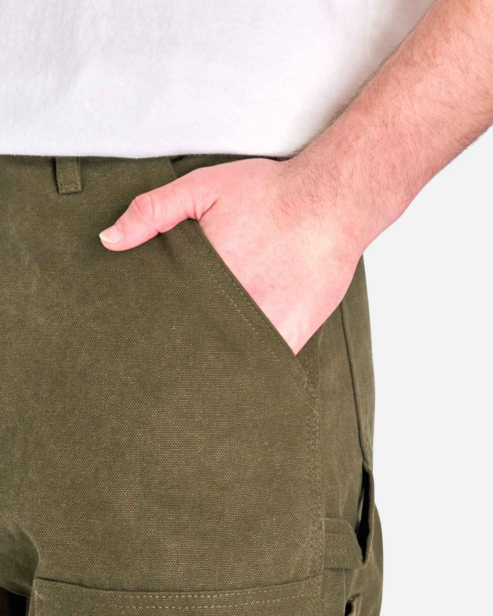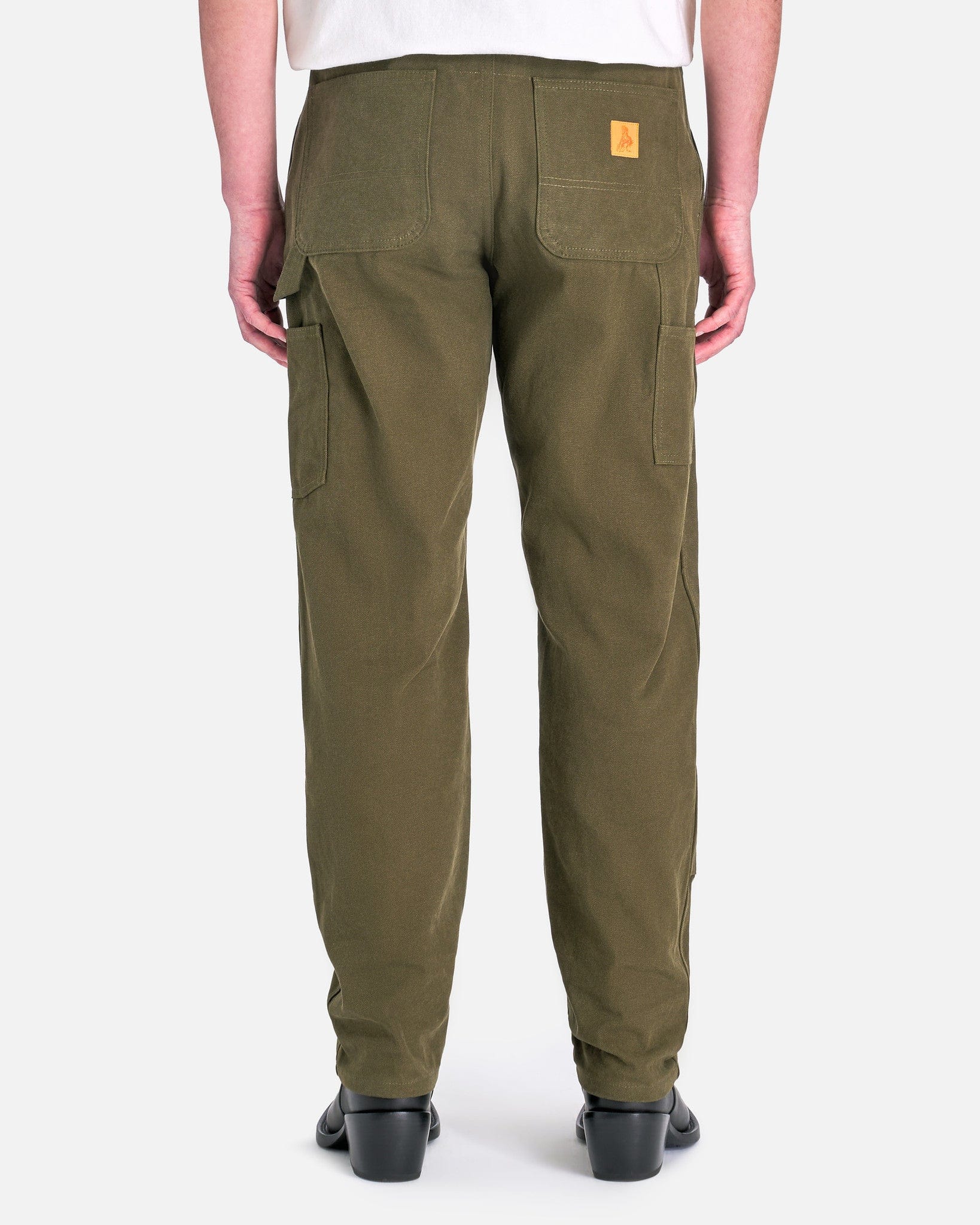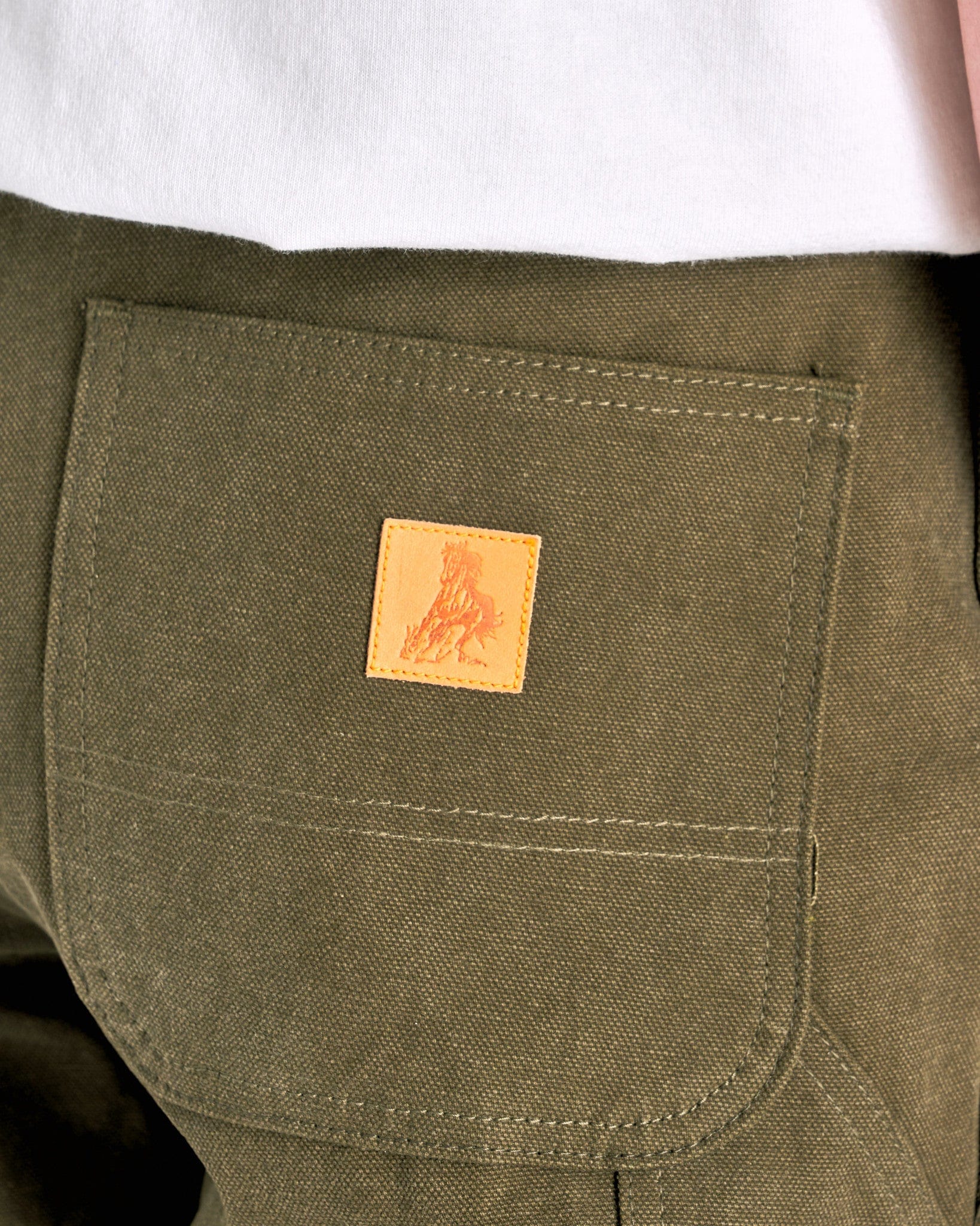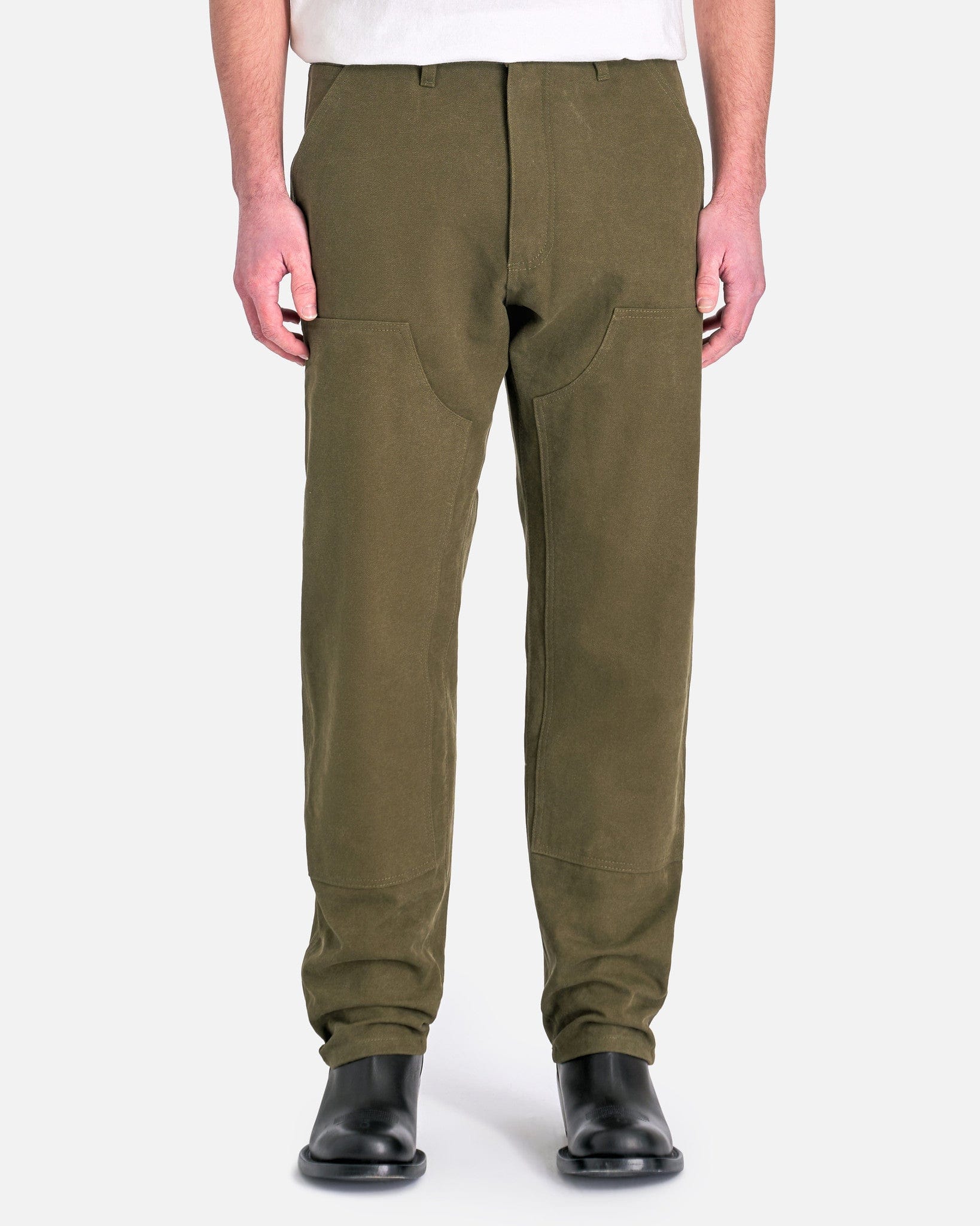One of These Days men's work pants in olive green. These pants feature an olive coloring, double knees, side slip pockets, back patch pockets and a logo tag at the back right pocket.