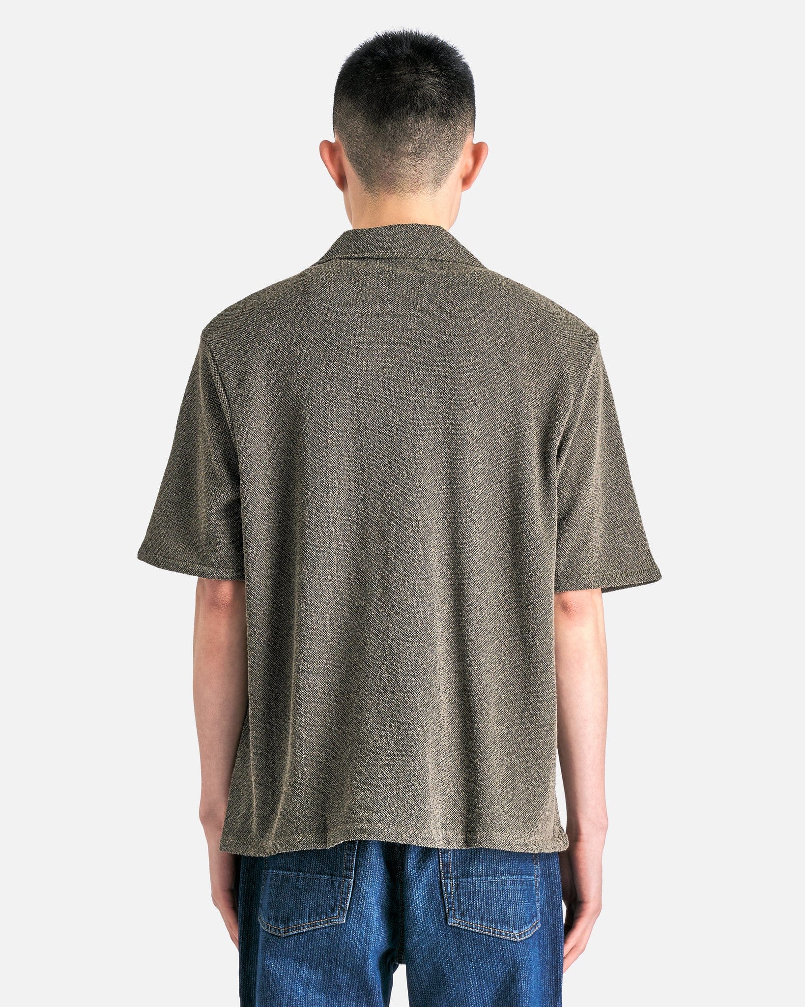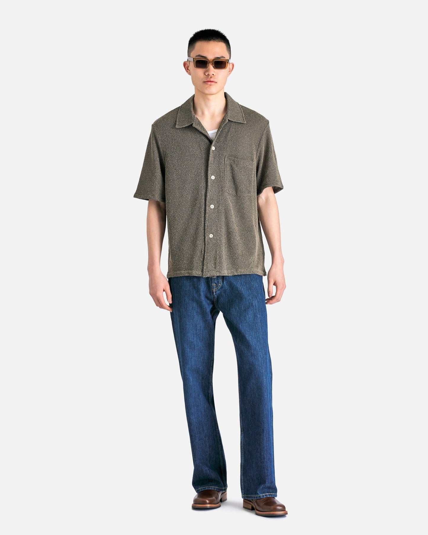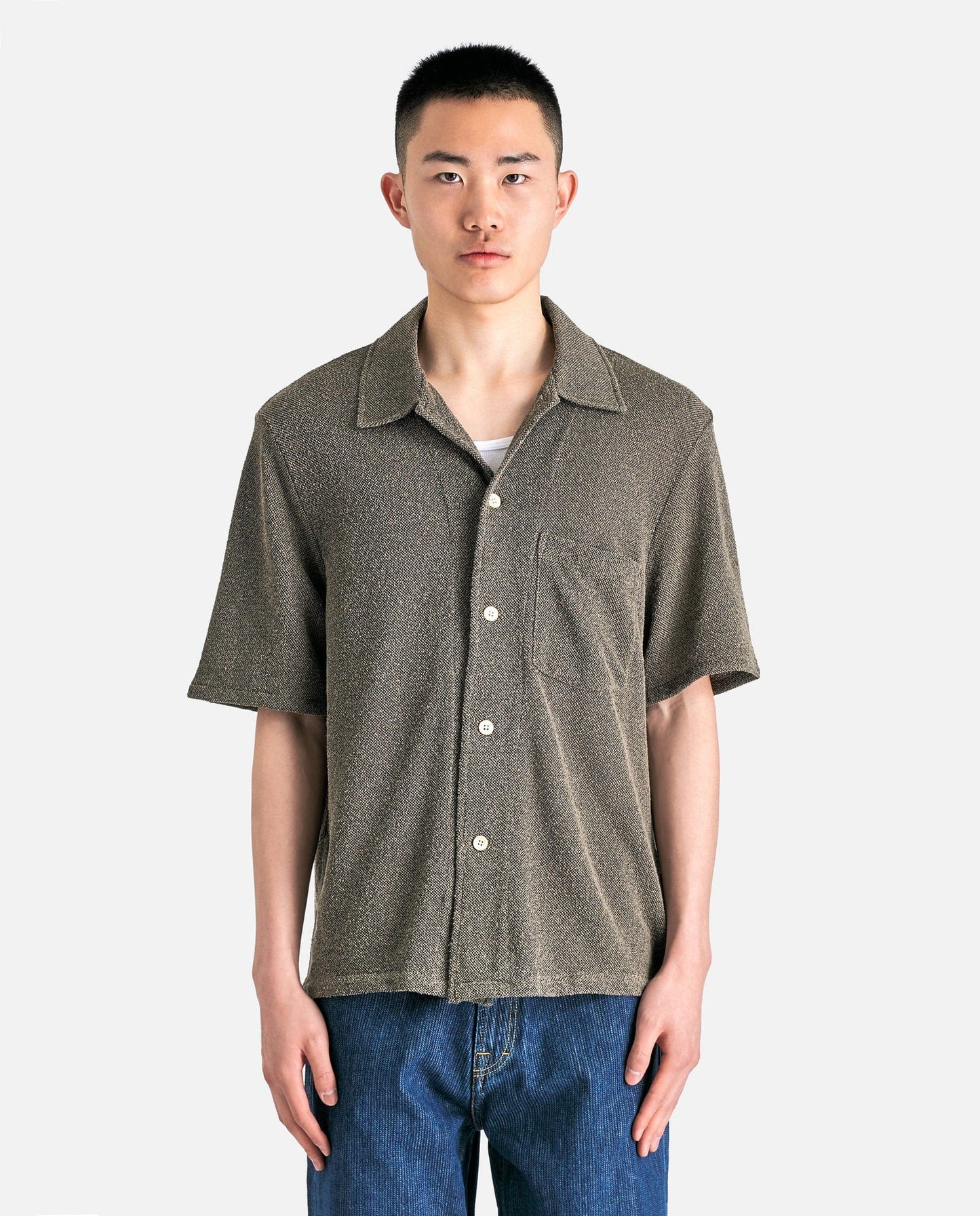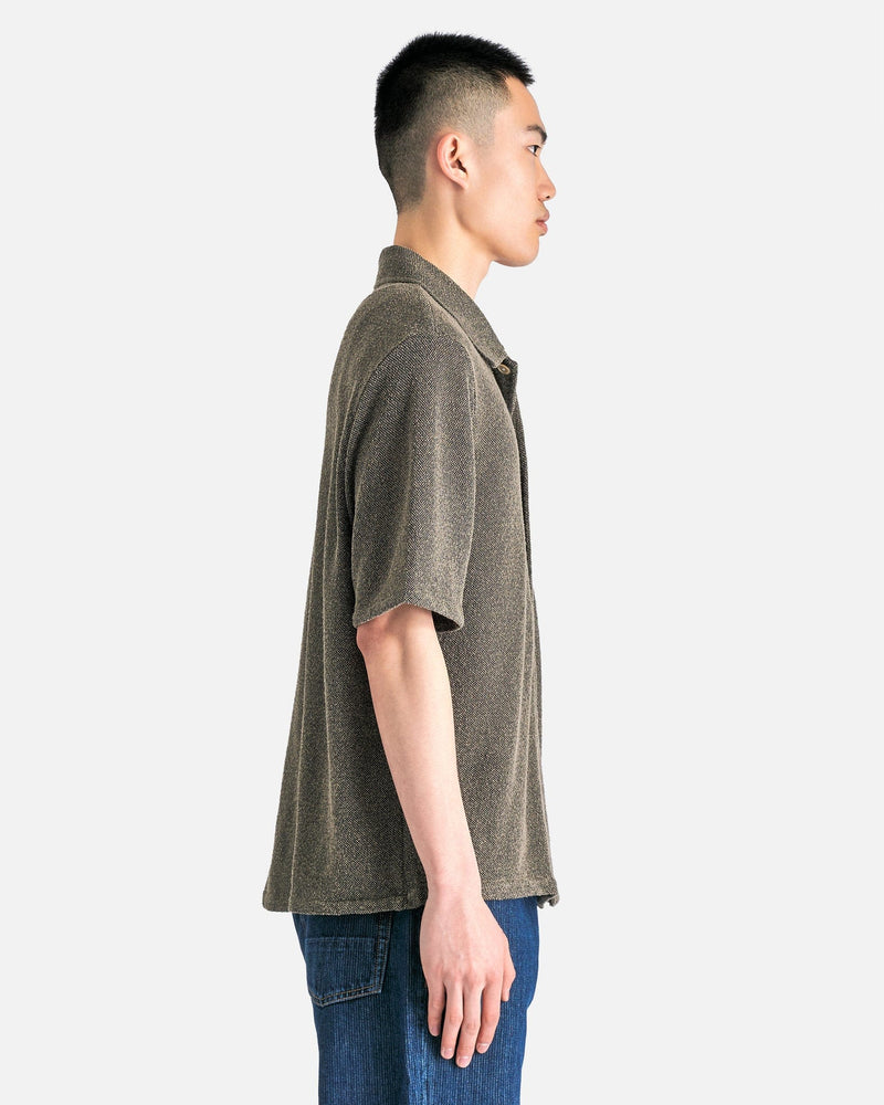 Our Legacy Box Shirt Shortsleeve in Muck Boucle. This shortsleeve shirt is constructed with a boucle textured fabric and features a peaked collar, front button closure, single chest pocket, wide placket and a straight hem.