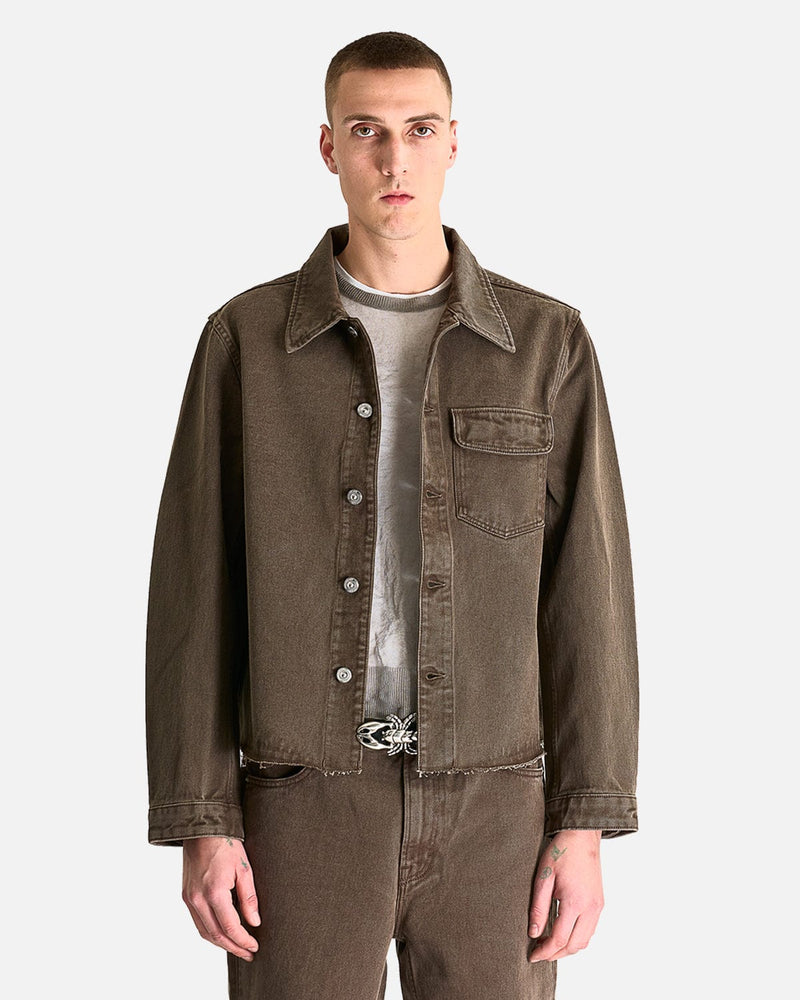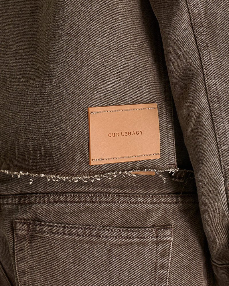 Our Legacy Cut Rebirth Jacket in Choco Overdye. This jacket is crafted from Italian denim and features a spread collar, button closure, single chest pocket with flap and a raw cut edge hem.