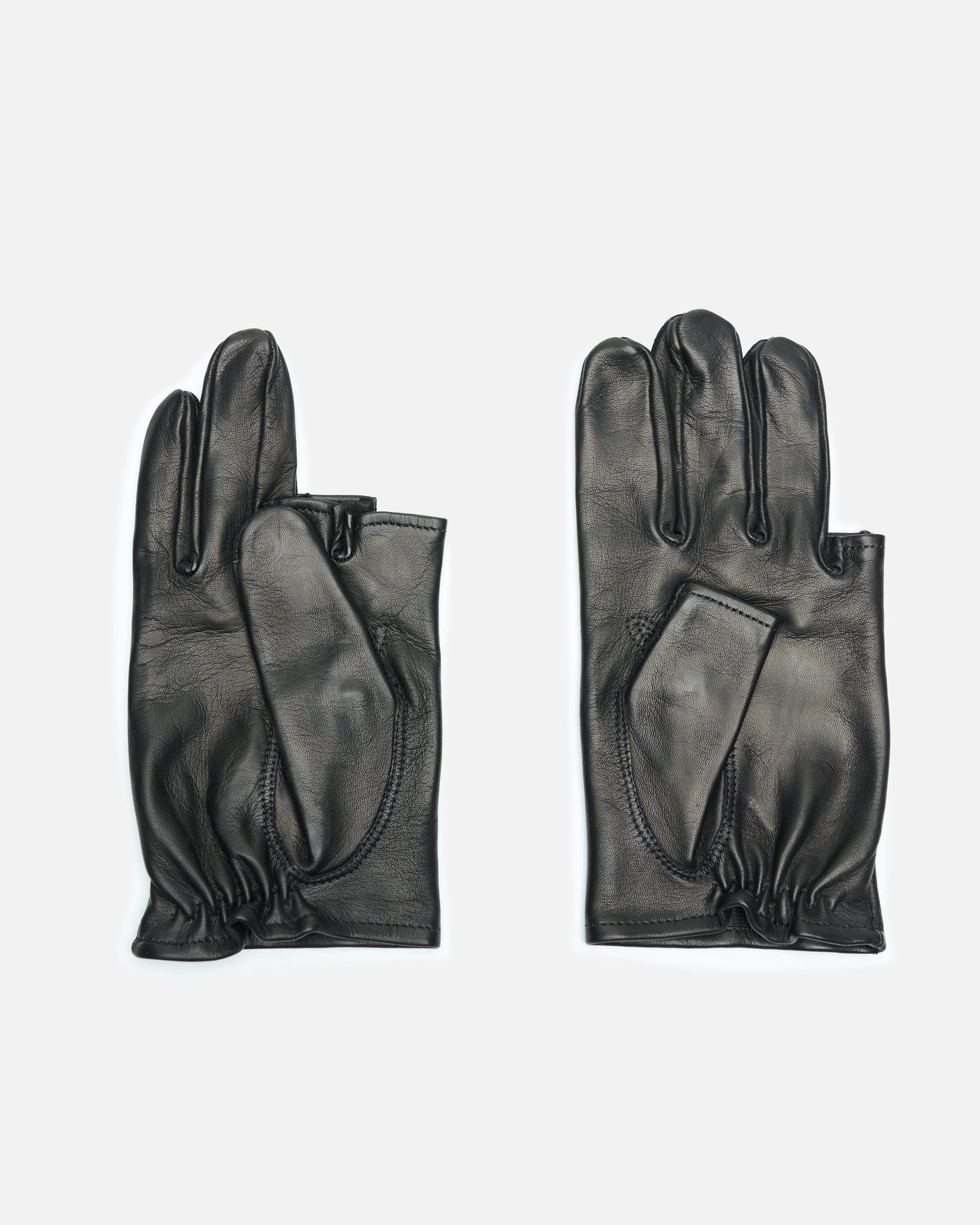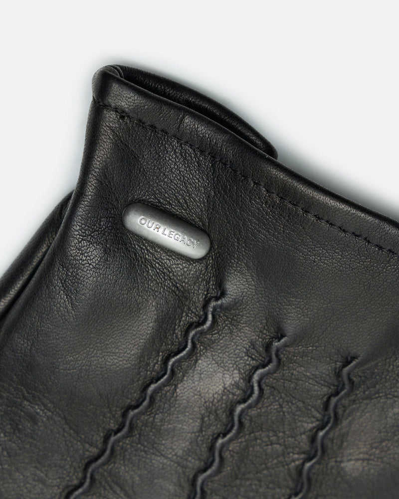 Our Legacy Hang Loose Gloves in Black Leather. These unisex gloves are crafted from Italian lamb leather and feature four cut fingers, twin needle top stitching and elastic zigzag stitched cuffs.