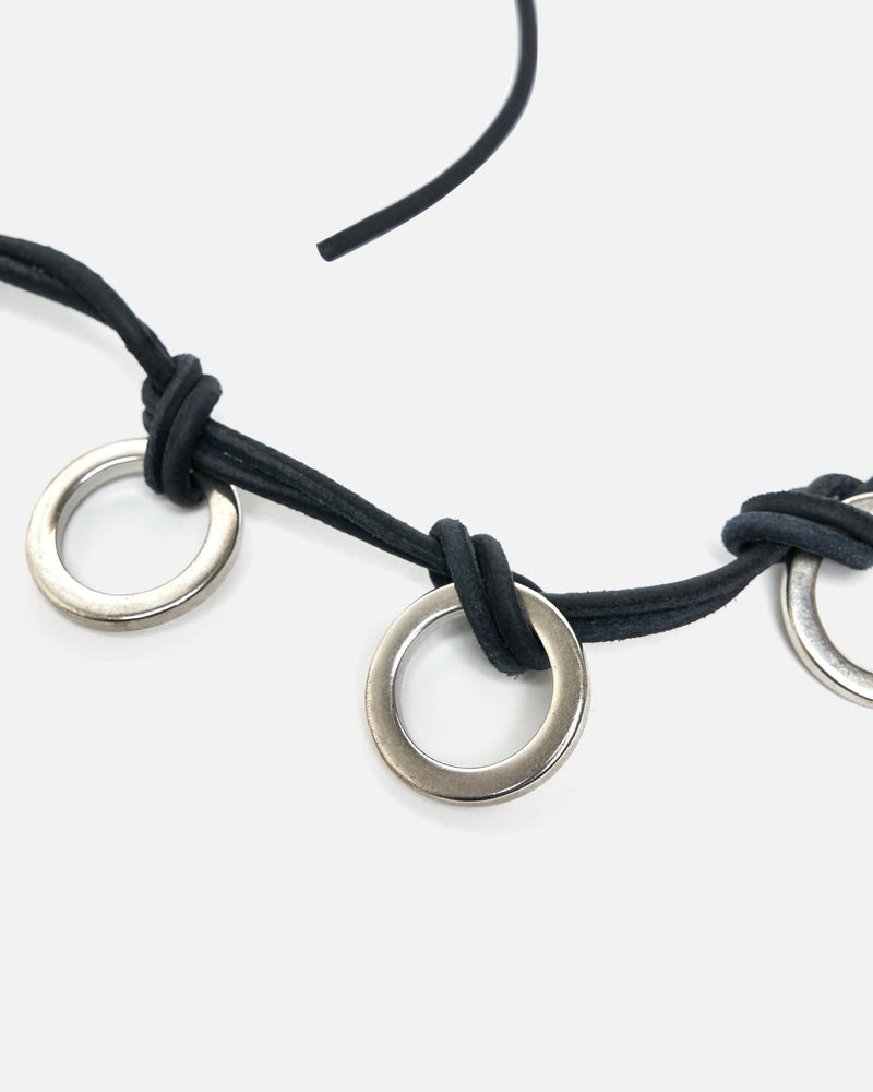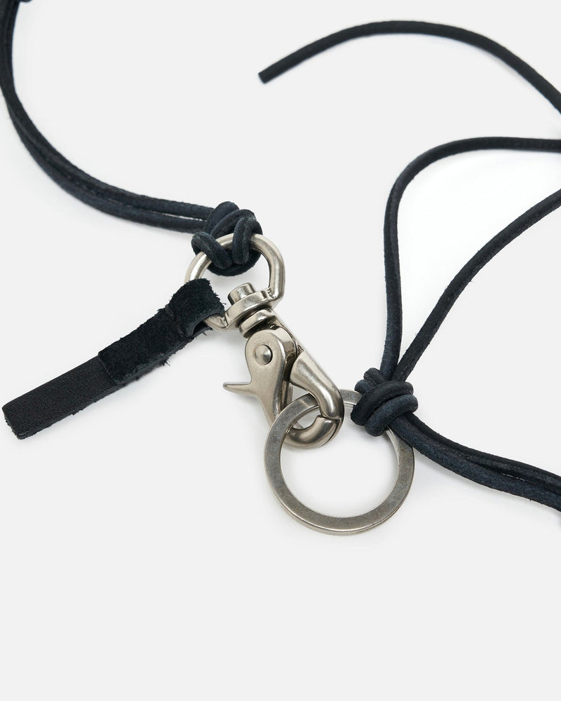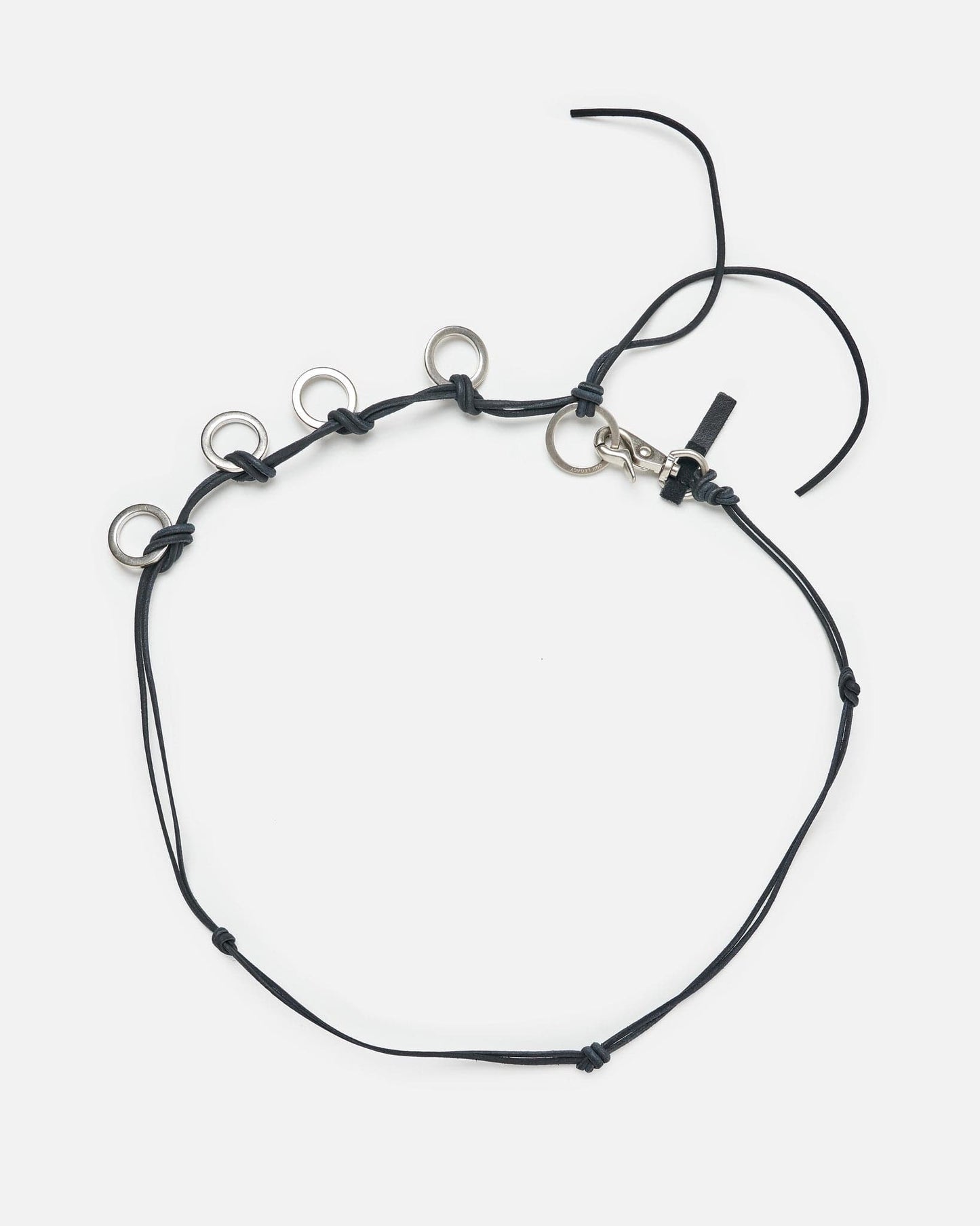 Our Legacy Ladon Belt in Black Leather. This leather belt is constructed with Japanese metal hardware and bound with knotted leather cord. The belt features a hand stitched leather tab at the clasp.