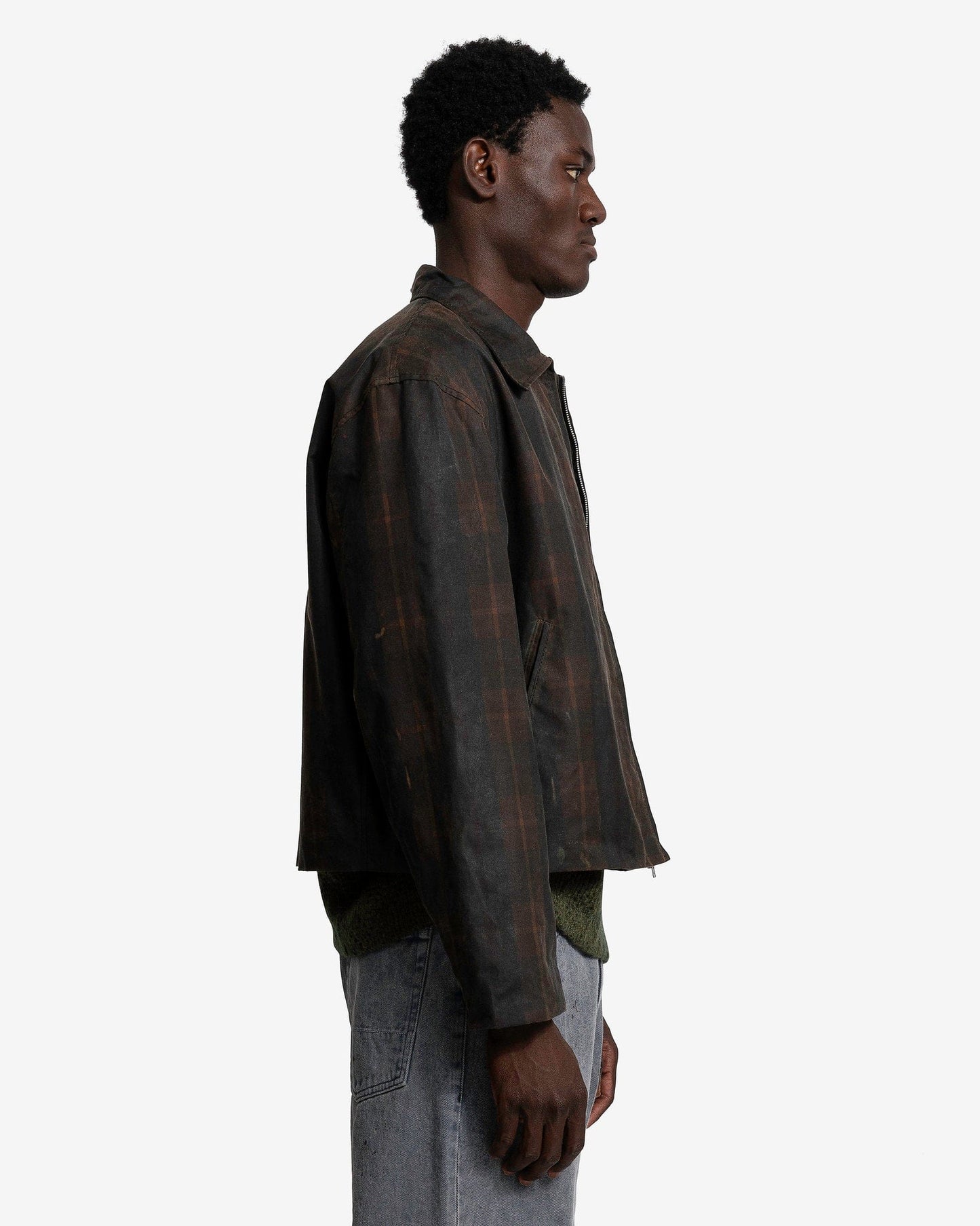 Our Legacy men’s Mini Jacket in Hunterbrown Tartan. This jacket has a minimalist look and features jet pockets, a two-way zipper and a cupro lining. The jacket also features a completely waxed outer layer.