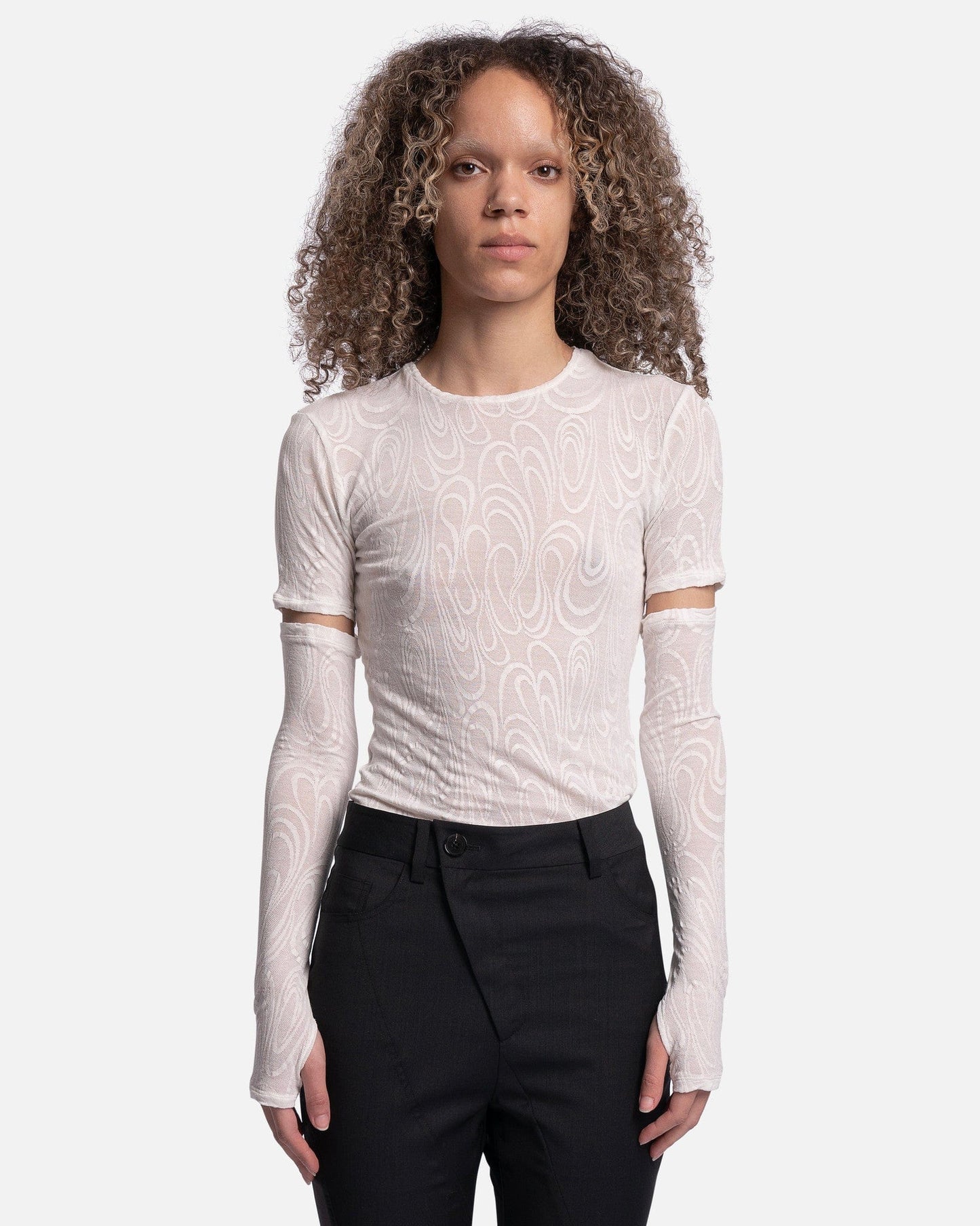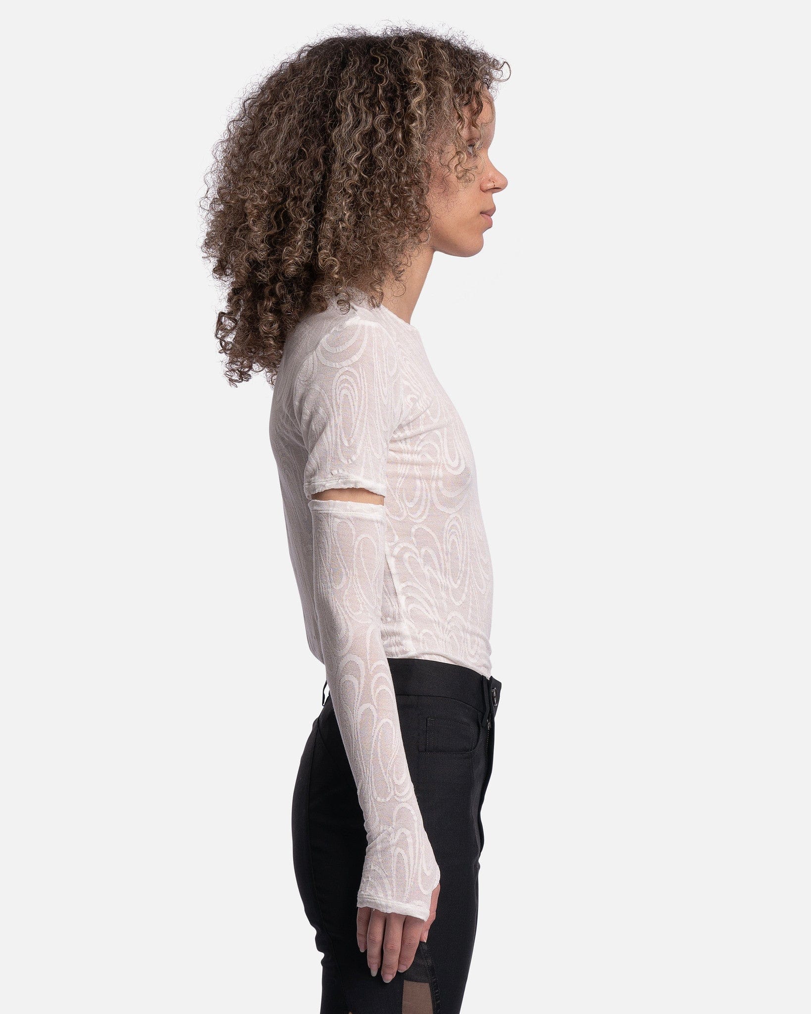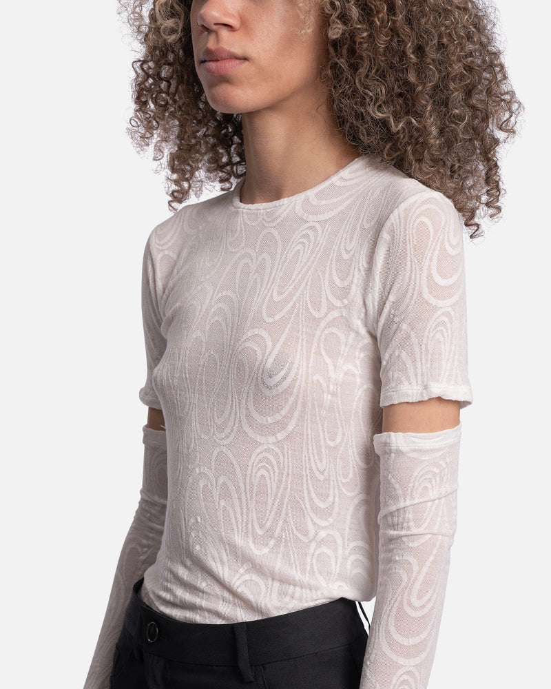 Our Legacy women's slit sleeved sheer top in white. This top features a semi sheer finish with a psychedelic jacquard print.