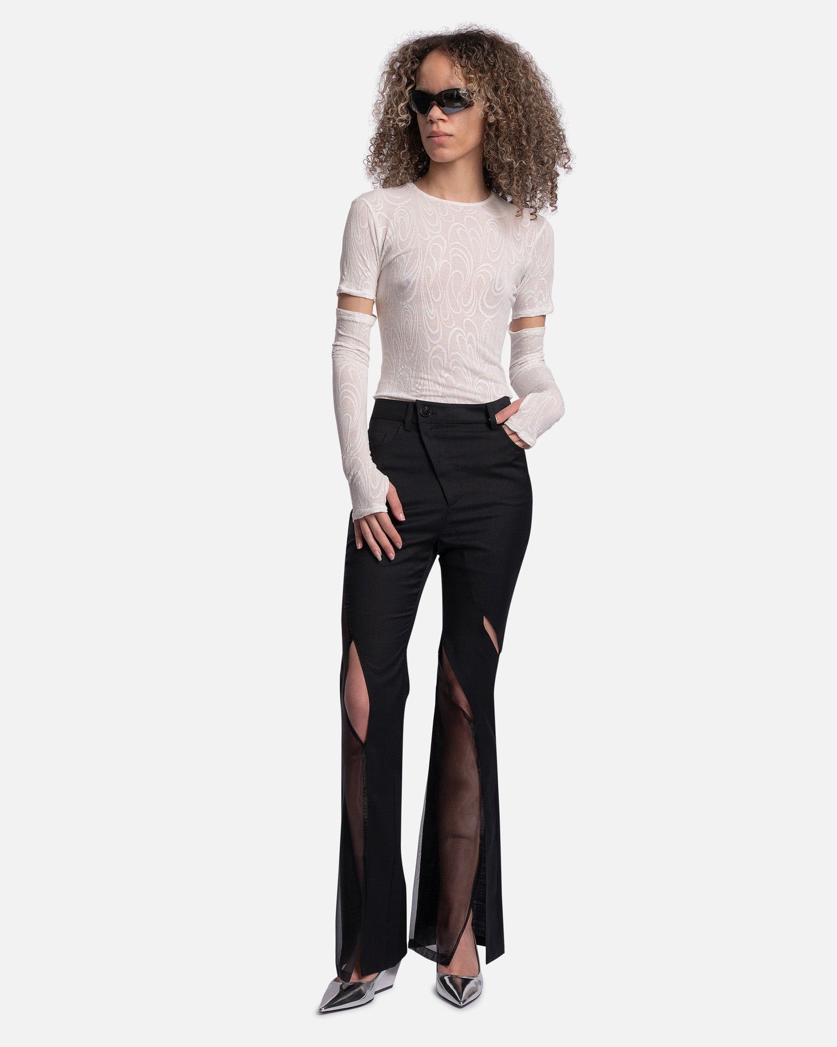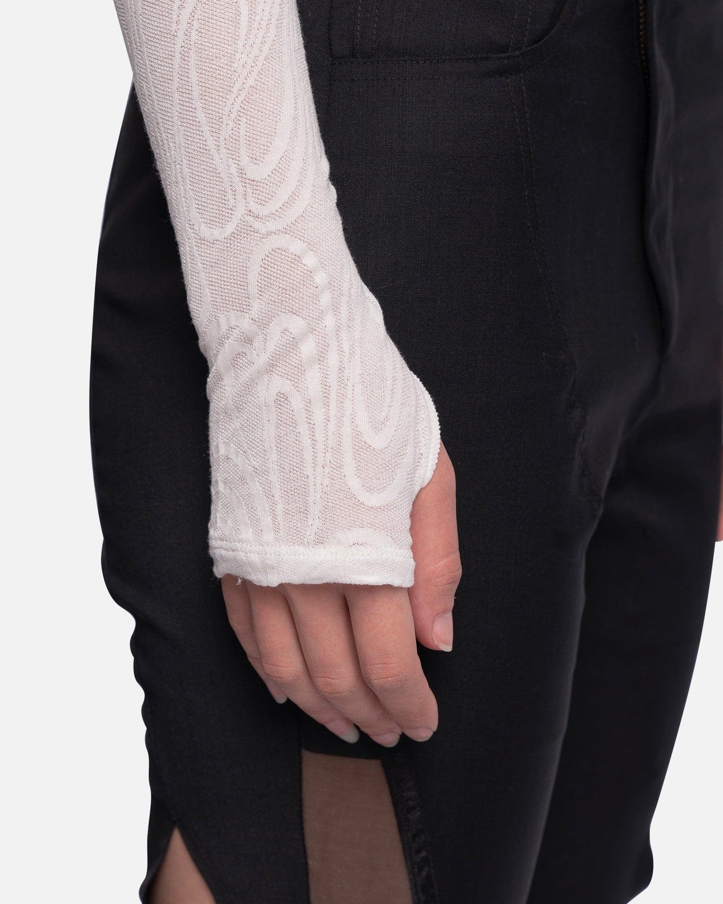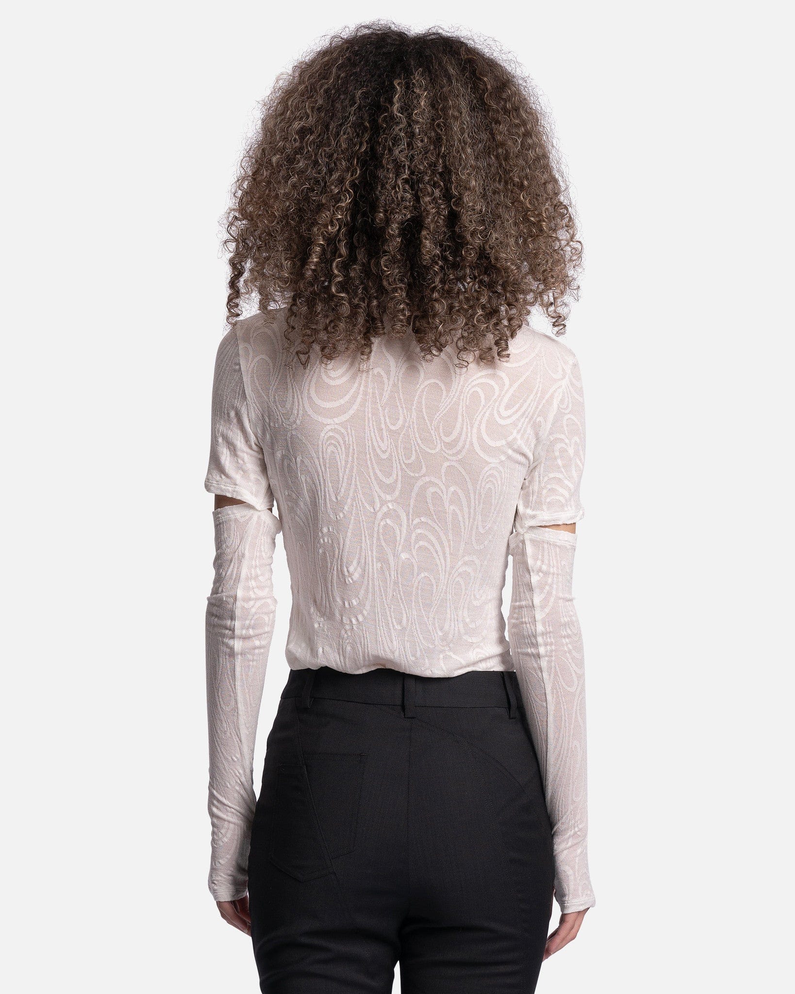 Our Legacy women's slit sleeved sheer top in white. This top features a semi sheer finish with a psychedelic jacquard print.