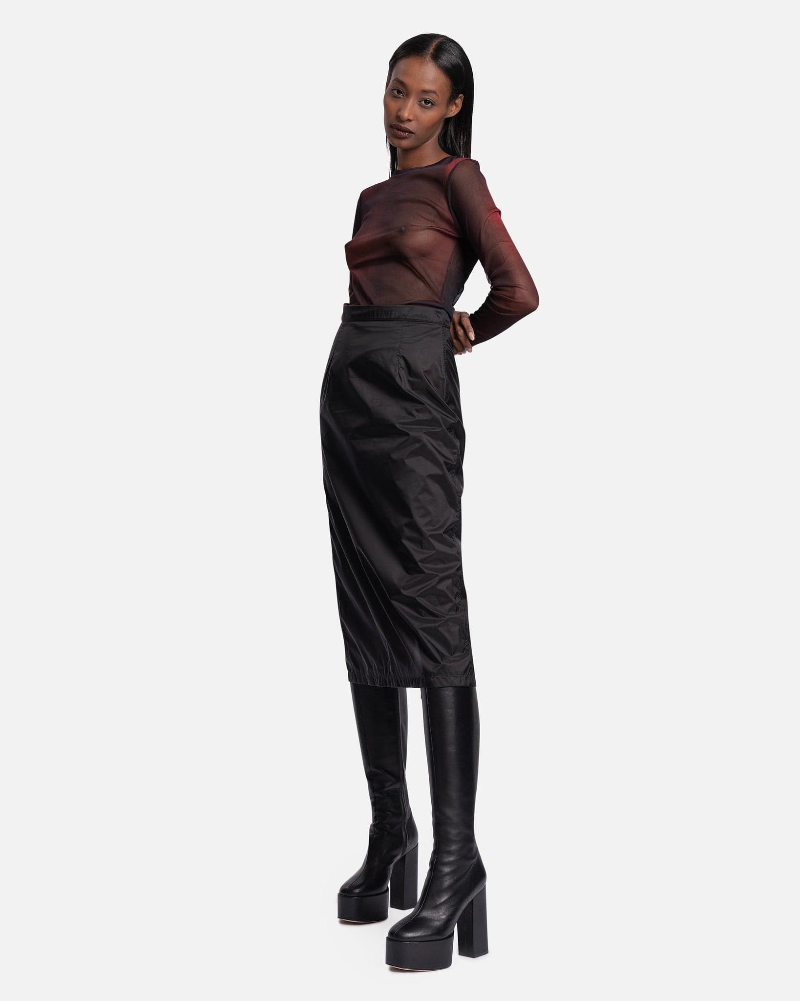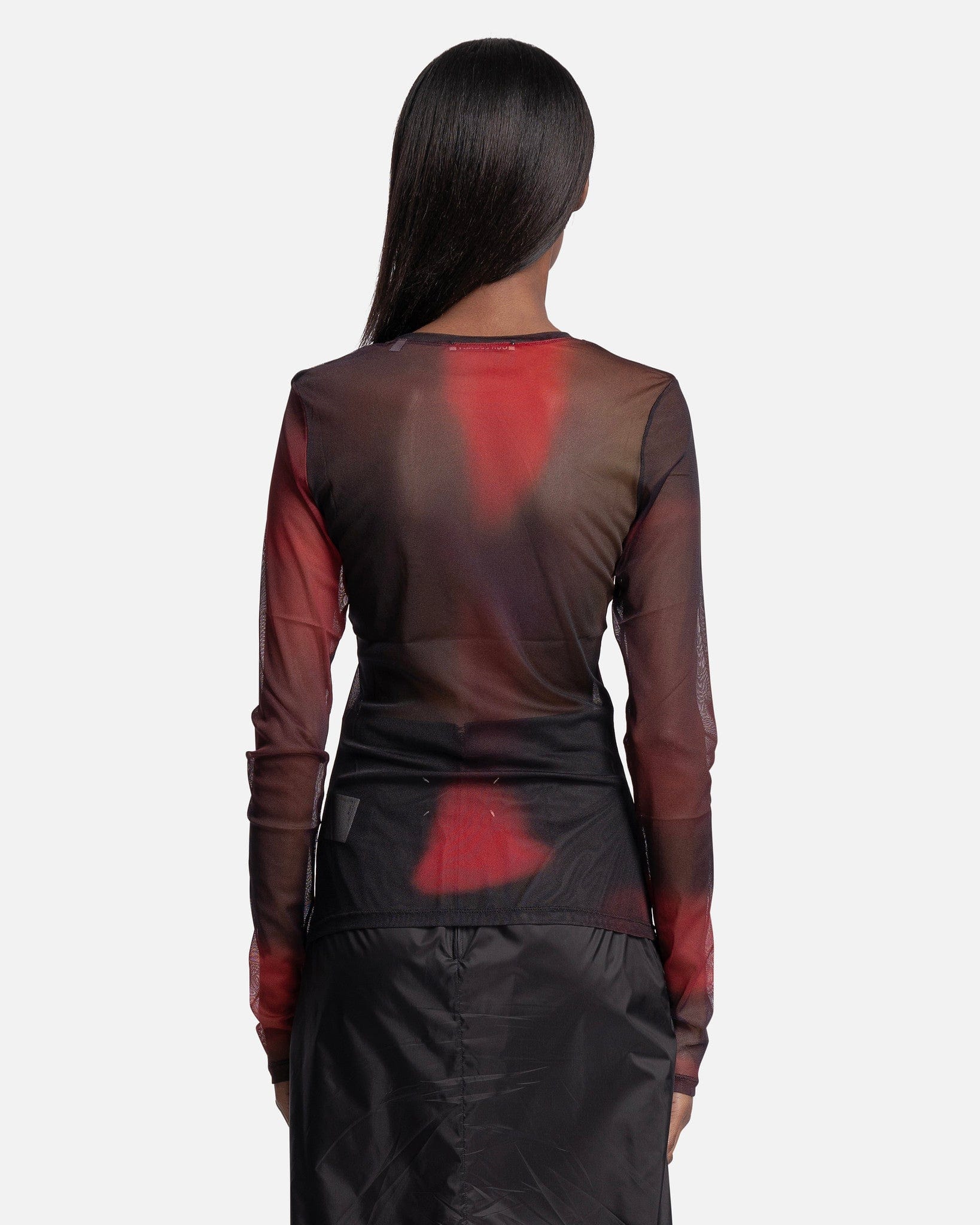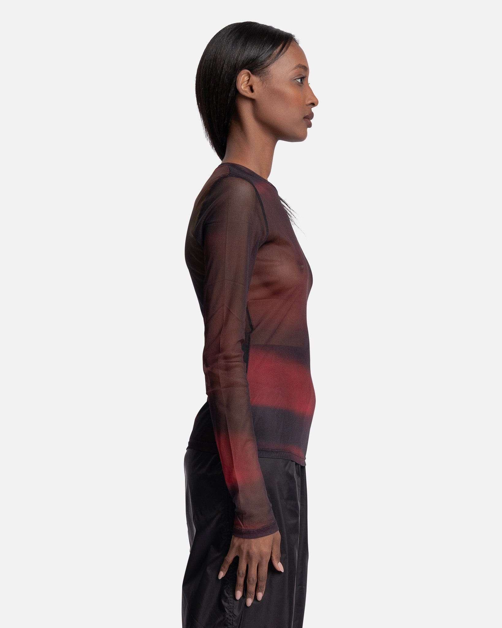 Women's Our Legacy slim long sleeve in red and black. This top features a bound collar and sheer finish. There is an allover red and black print.